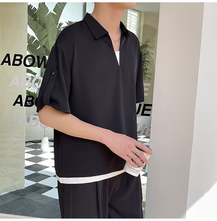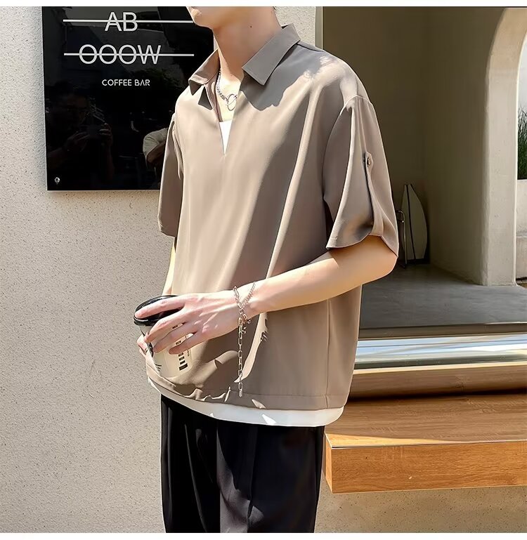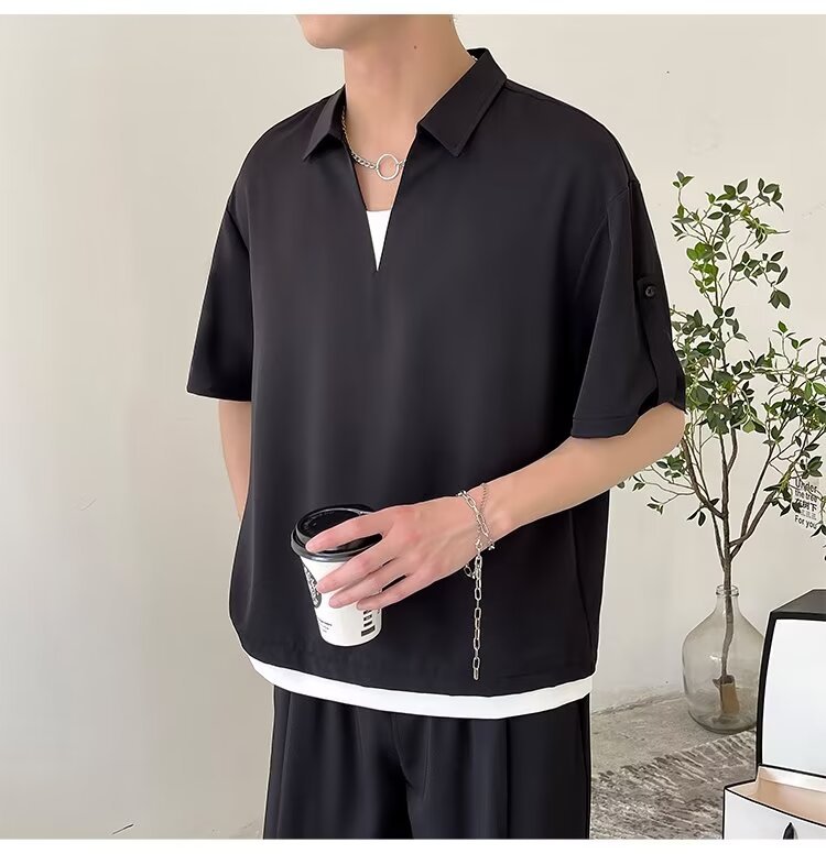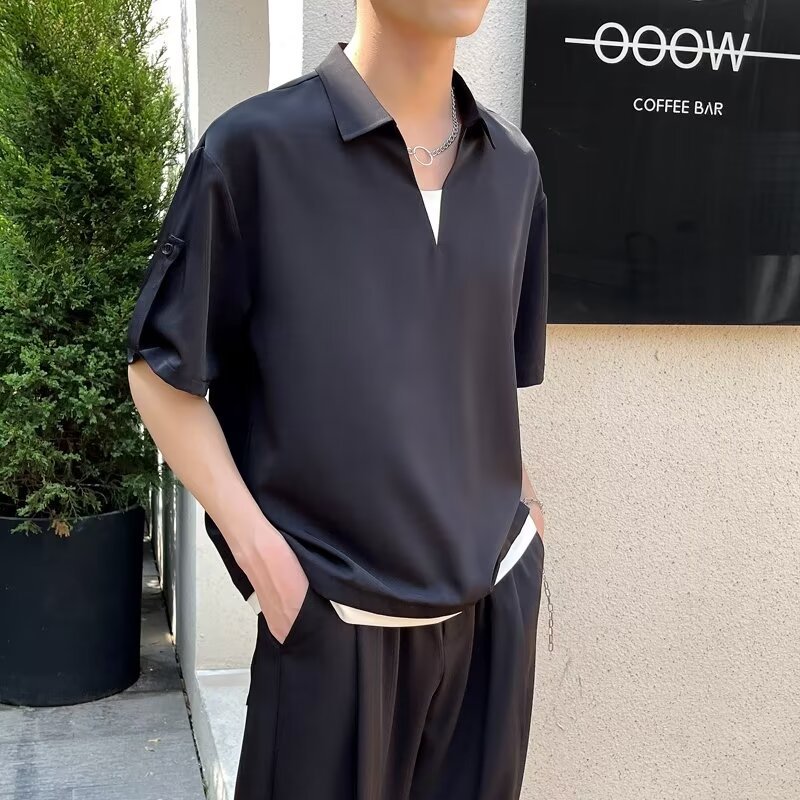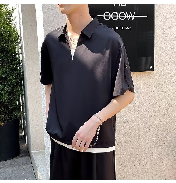 여름 트렌디 브랜드 하이 엔드 아이스 실크 티셔츠 남성 디자인 센스 페이크 투피스 V 넥 반팔 폴로 셔츠 남성 옷깃 라이트 성숙한 스타일
