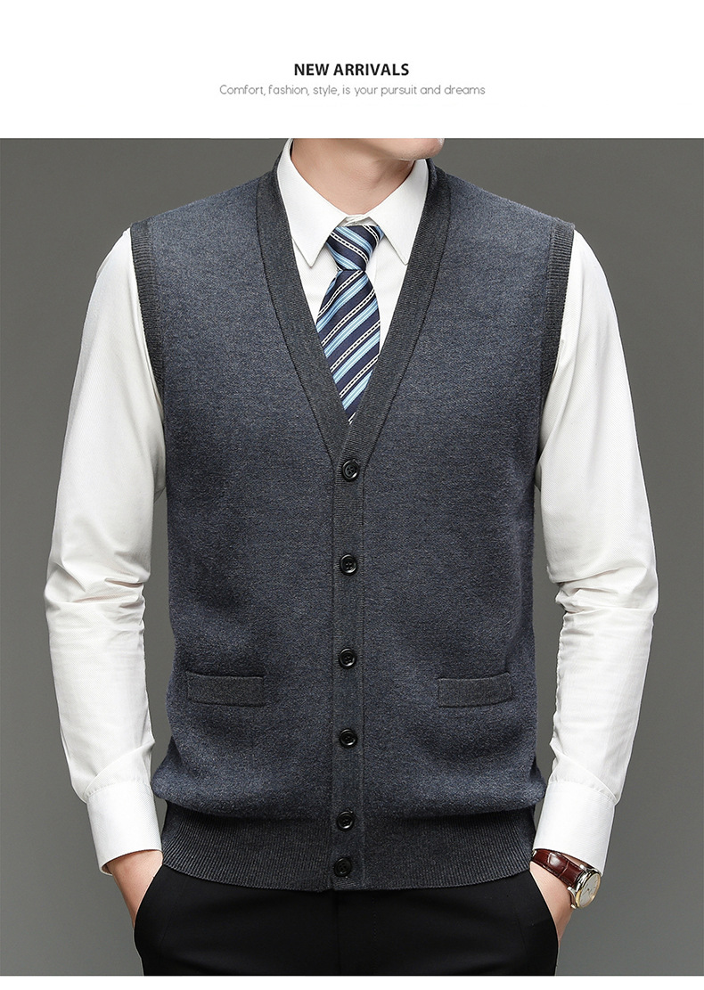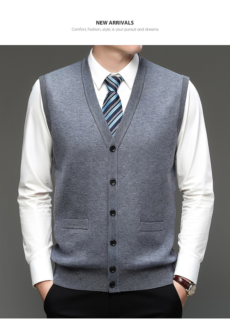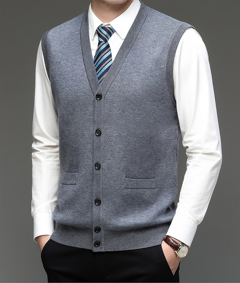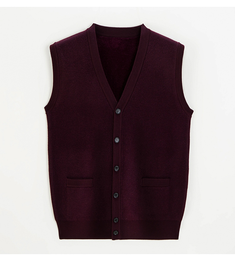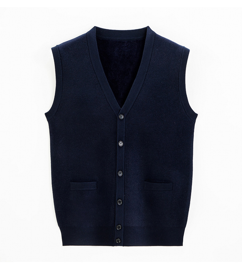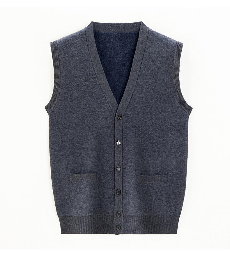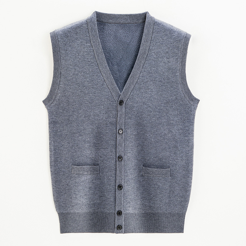 남성 기모 기모 가을과 겨울 V-Neck 버튼 니트 포켓 조끼 따뜻한 스웨터 조끼 노인을위한 민소매 웨이스트 코트