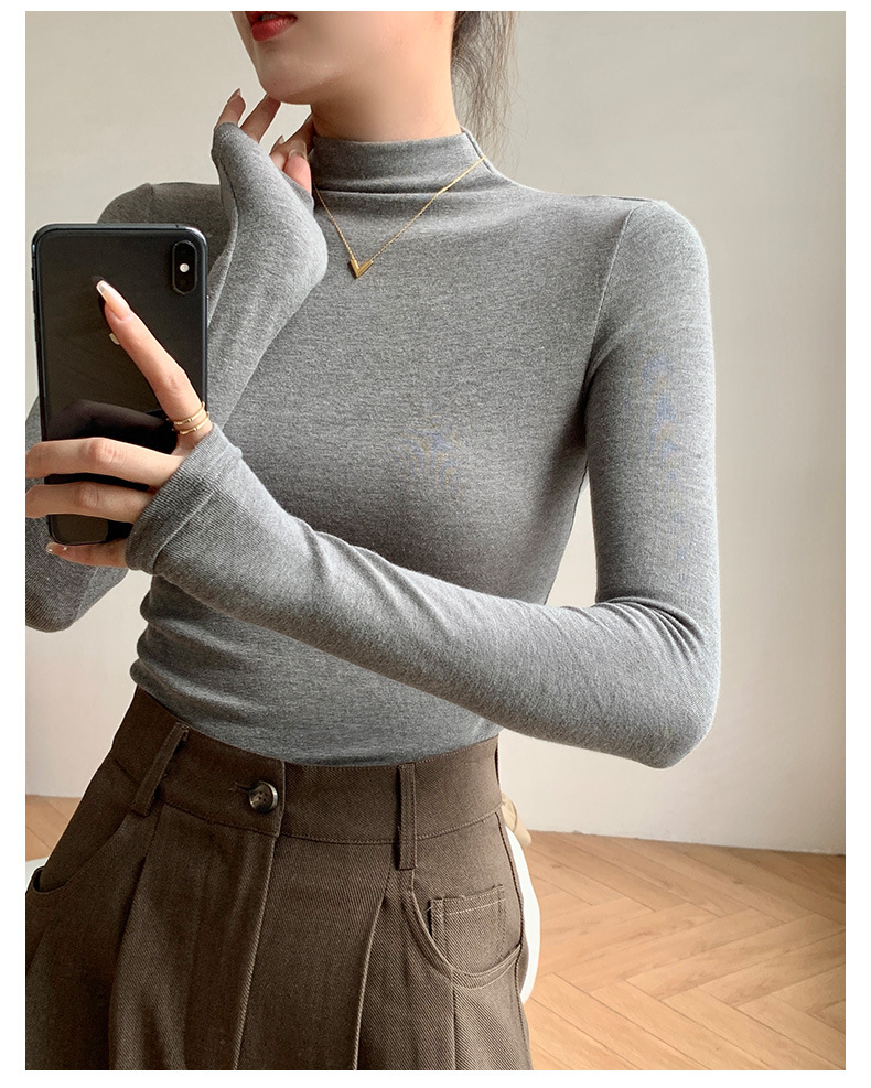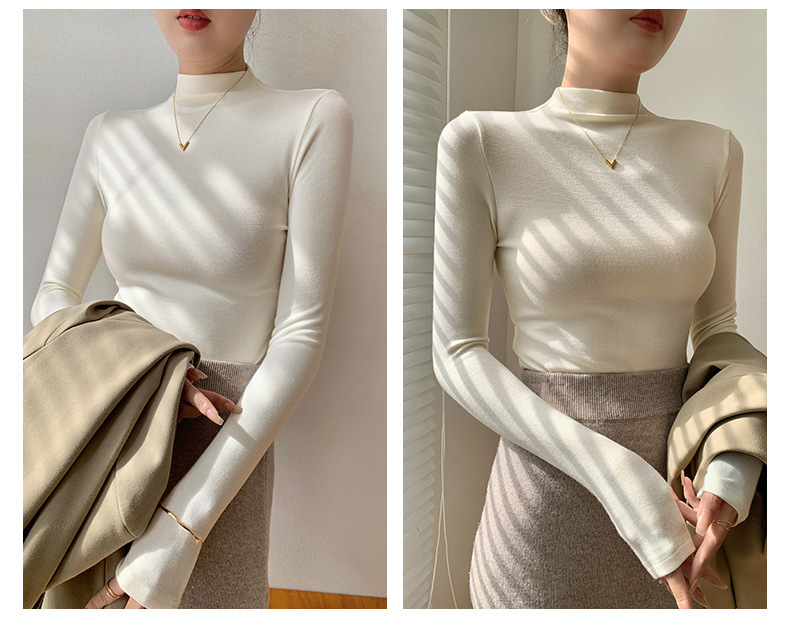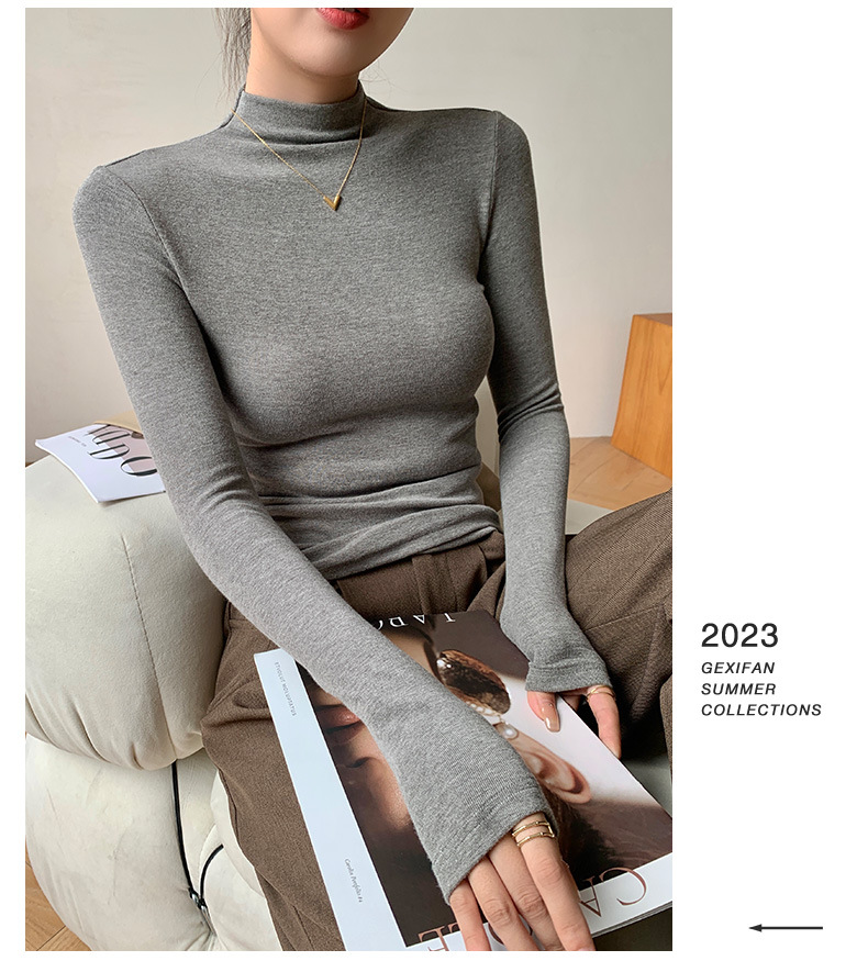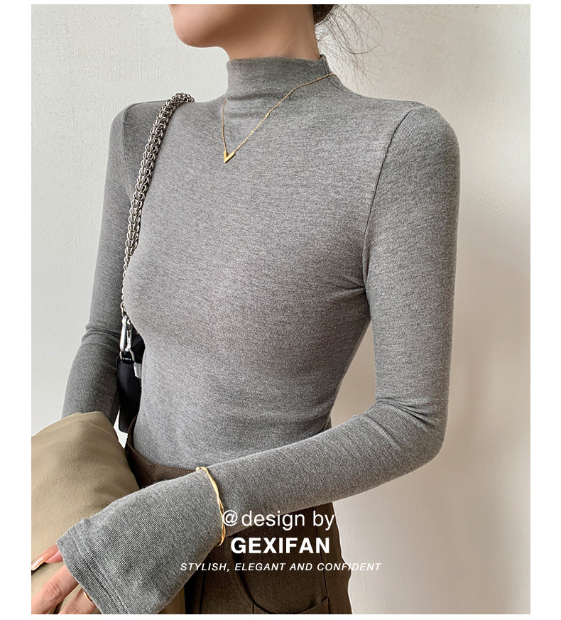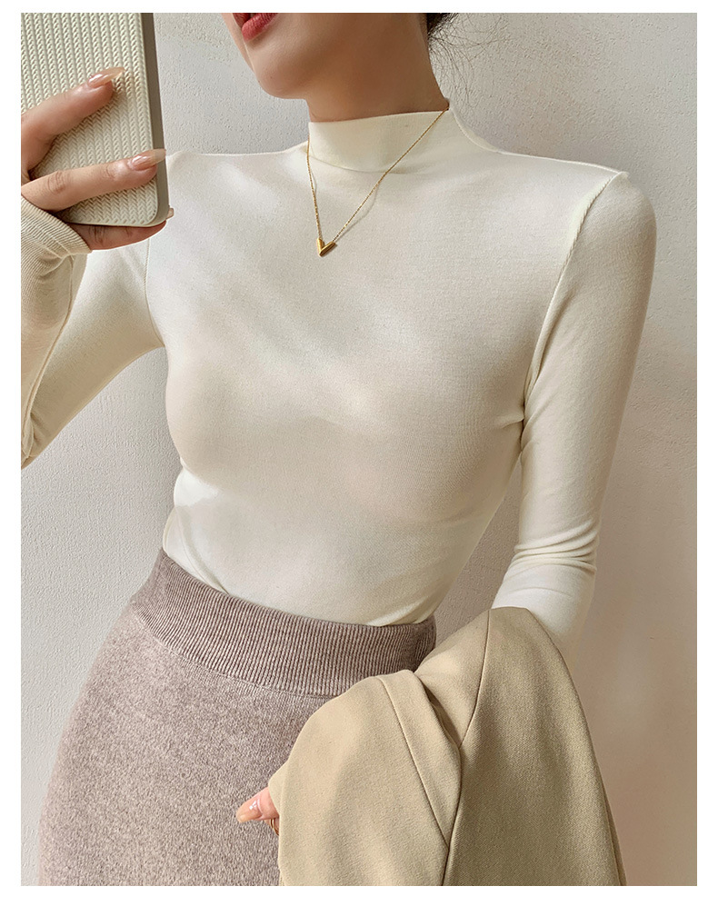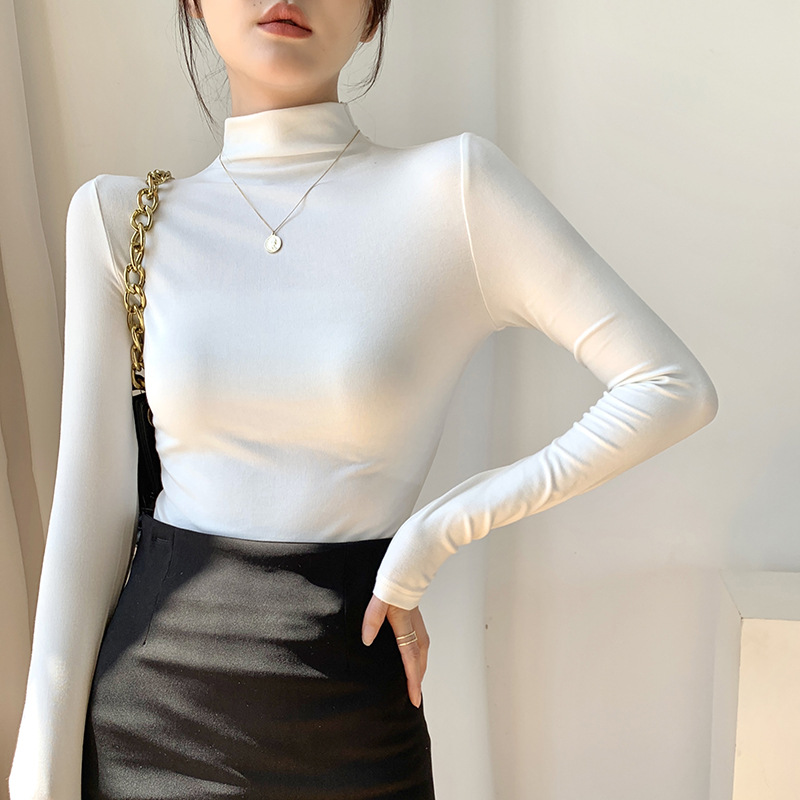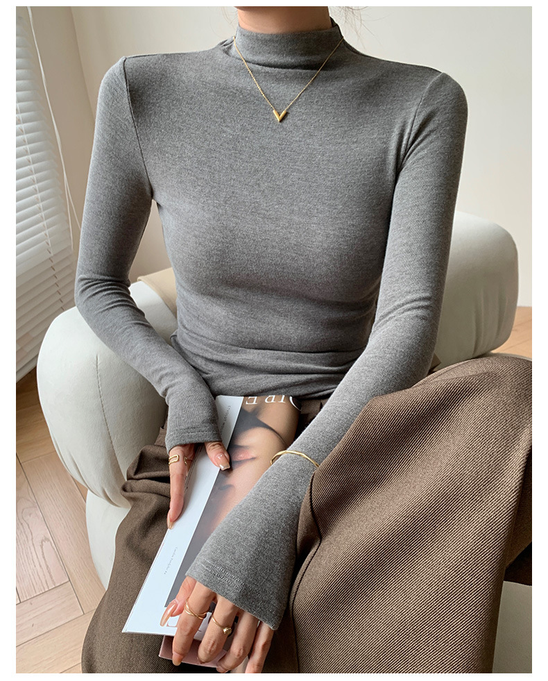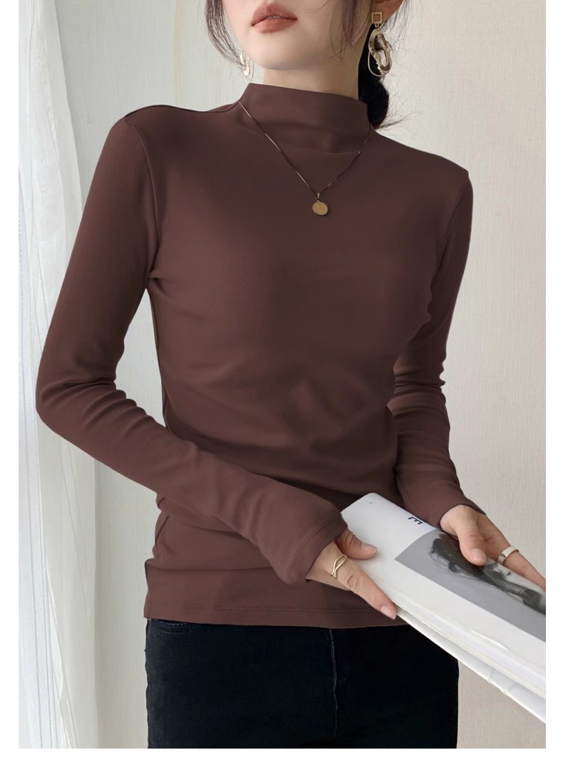 반높이 칼라베이스 셔츠 가을과 겨울 새로운 슬림핏 따뜻한 양털 긴팔 티셔츠 여성용 솔리드 컬러 올매치 탑