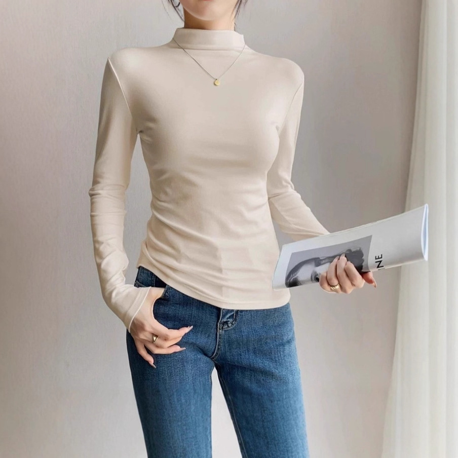 반높이 칼라베이스 셔츠 가을과 겨울 새로운 슬림핏 따뜻한 양털 긴팔 티셔츠 여성용 솔리드 컬러 올매치 탑스토어 가기