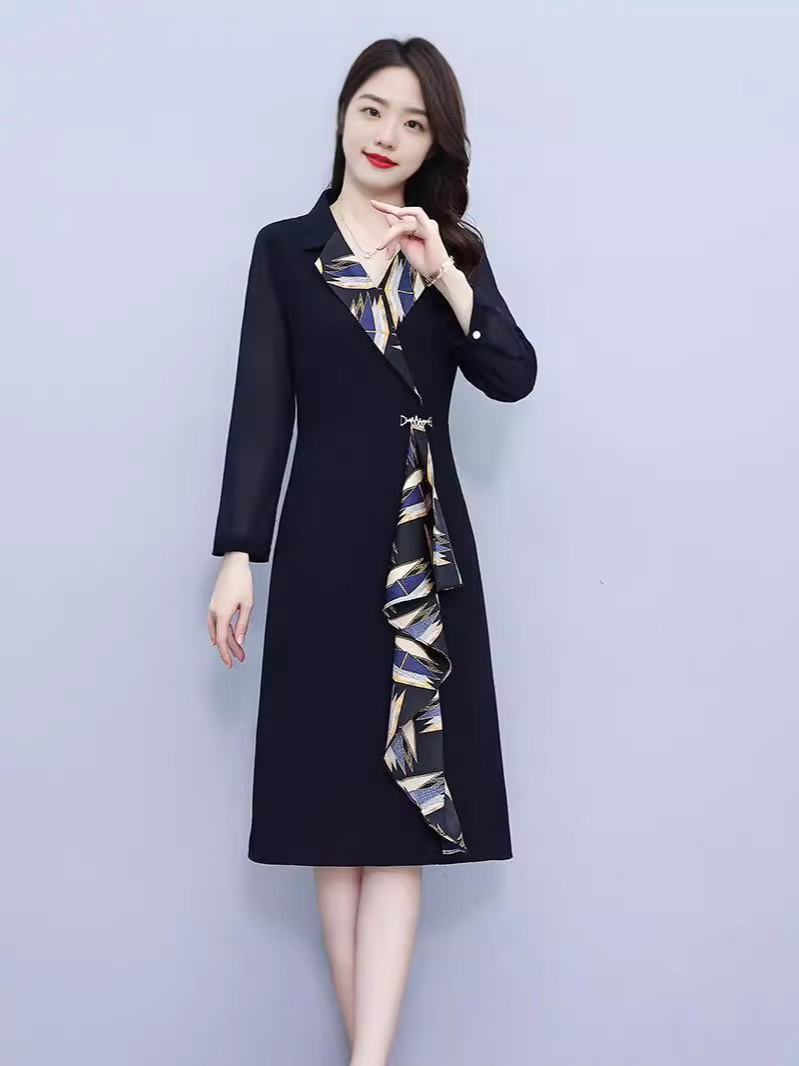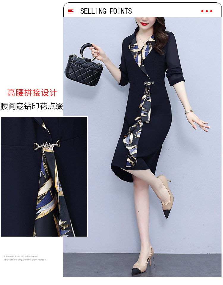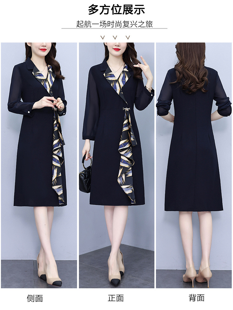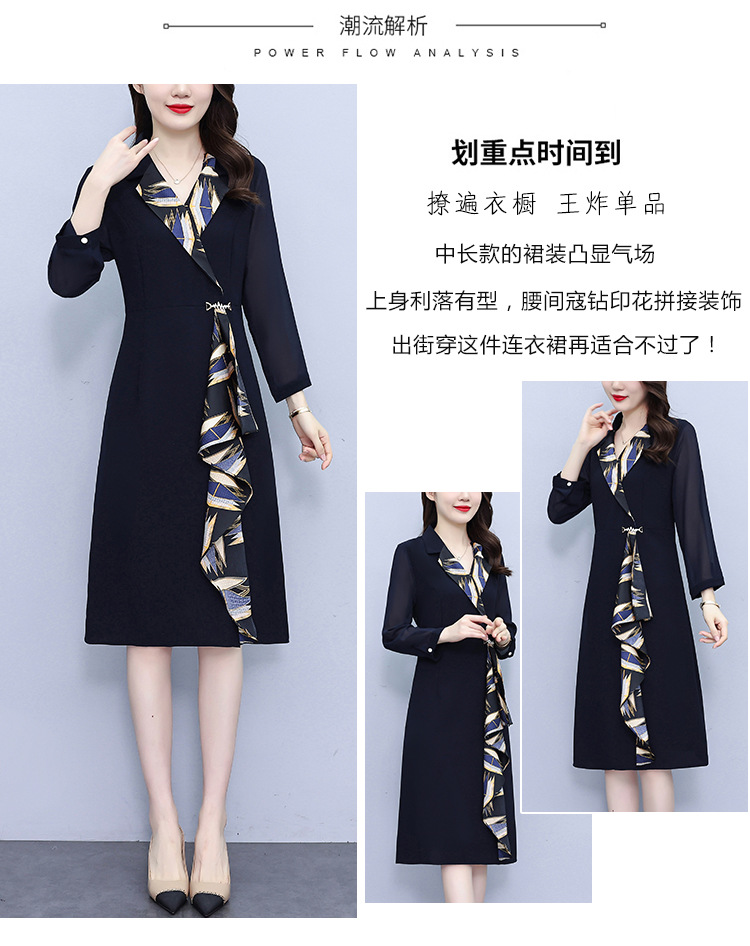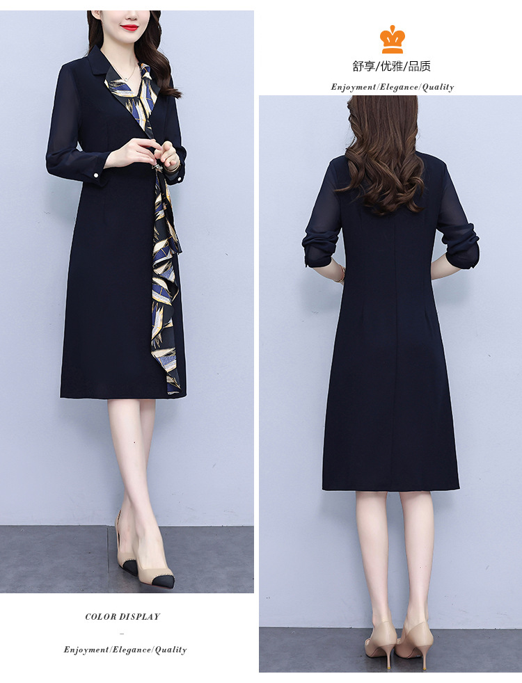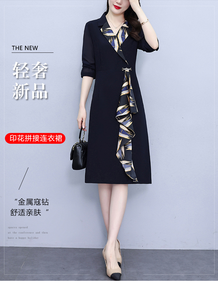 가을 2024 새로운 서양 스타일 우아한 우아한 원피스 칼라 패션 중년 어머니 대비 색상 스티칭 중간 길이 원피스스토어 가기