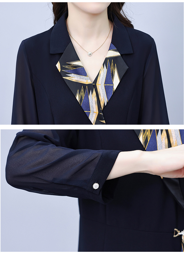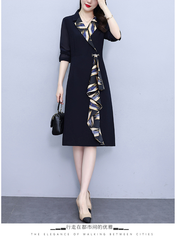 가을 2024 새로운 서양 스타일 우아한 우아한 원피스 칼라 패션 중년 어머니 대비 색상 스티칭 중간 길이 원피스