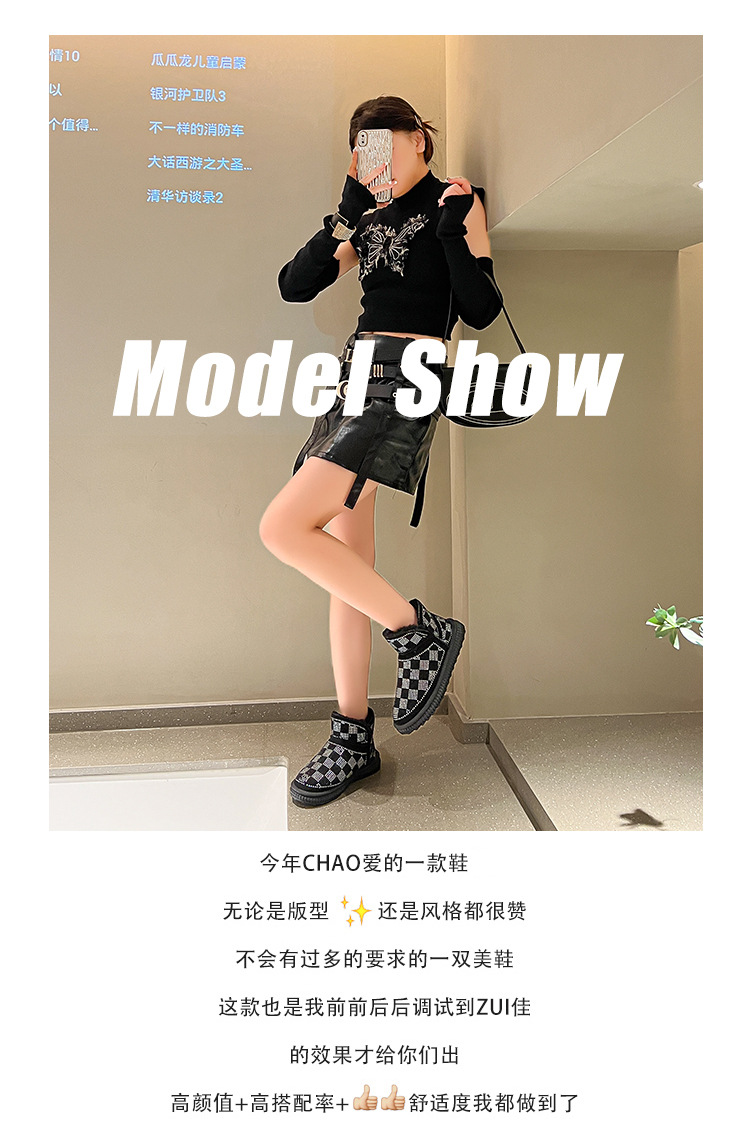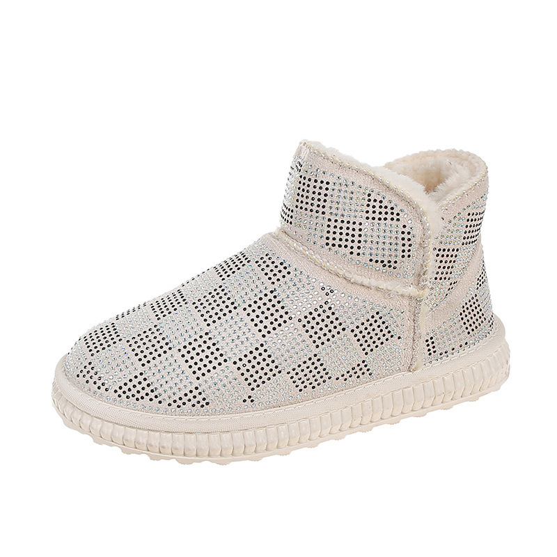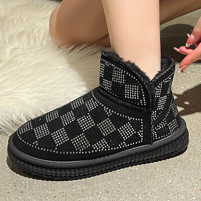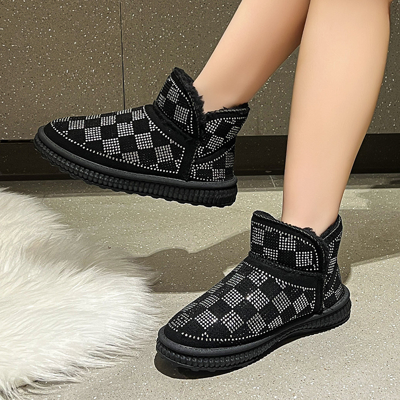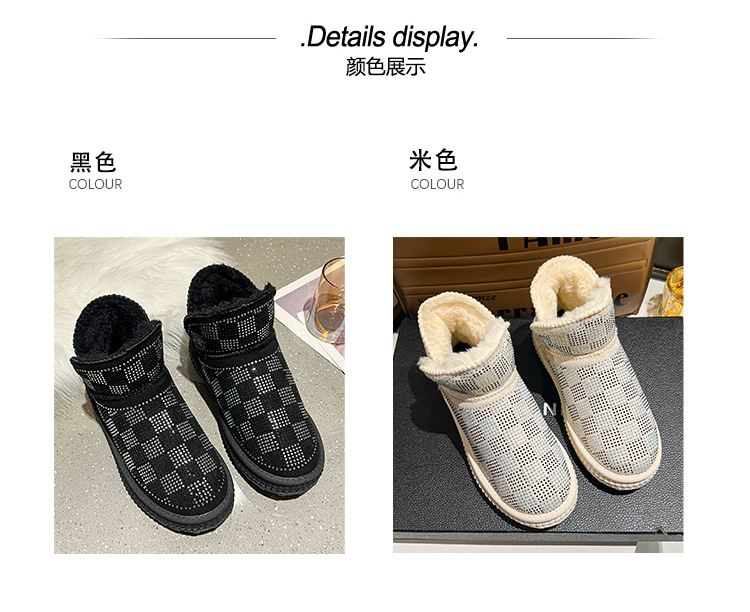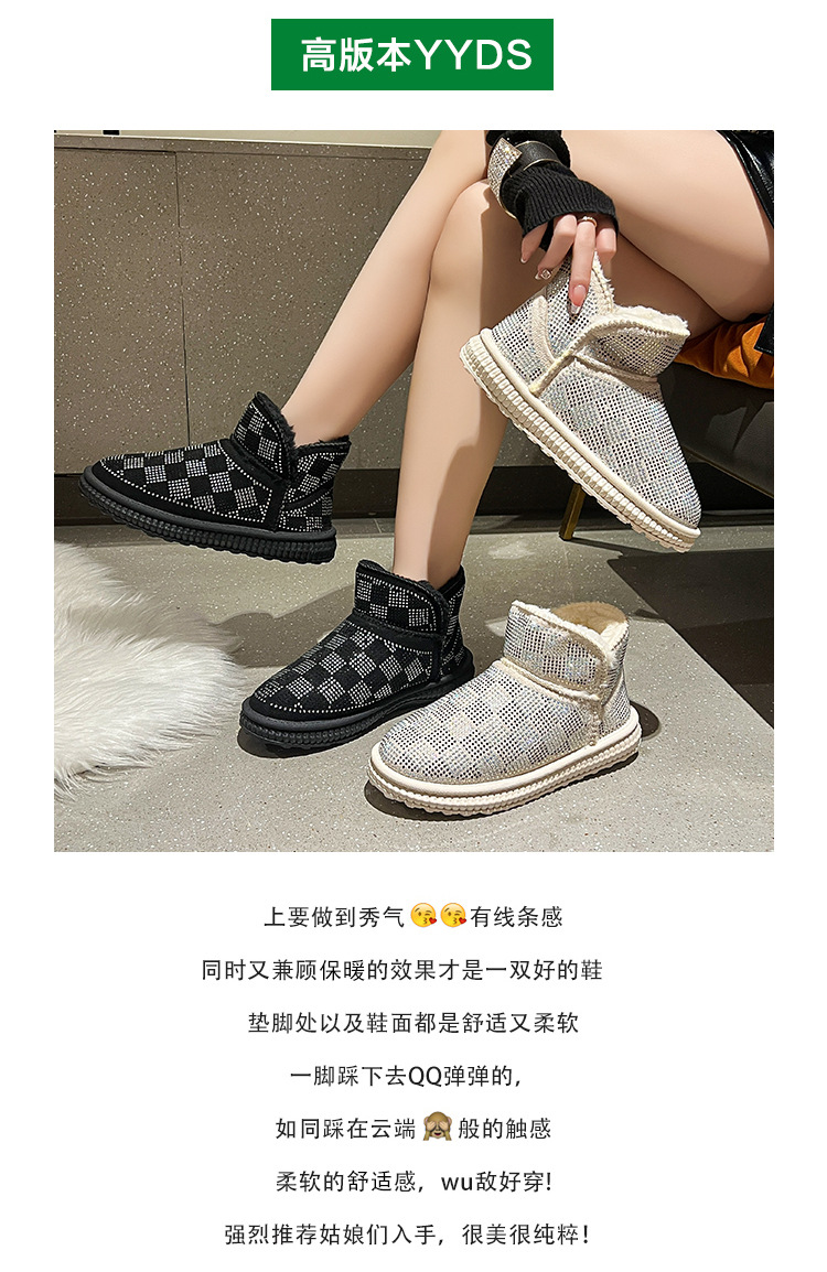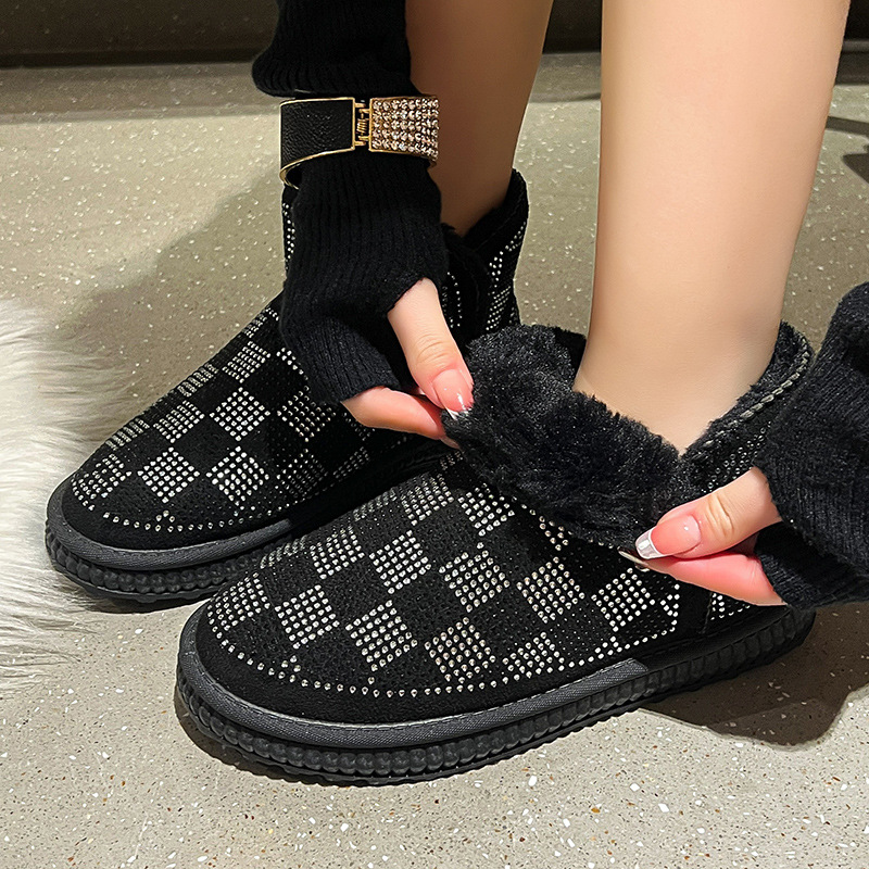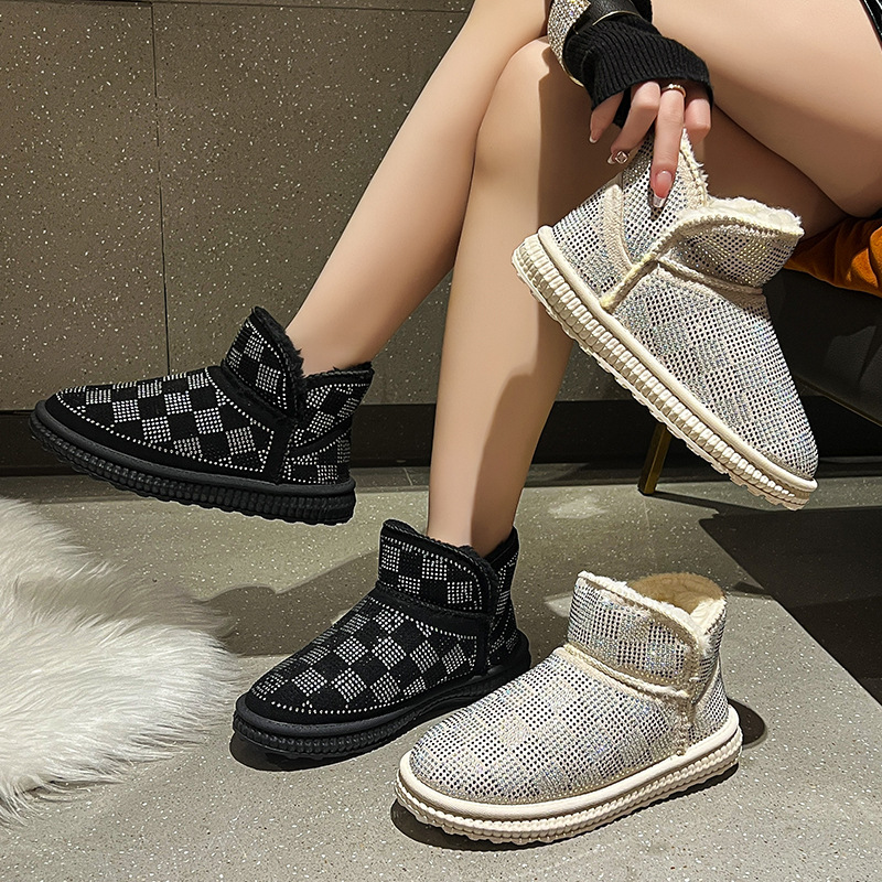 모피 원 쇼트 튜브 스노우 부츠 여성의 2024 새로운 겨울 플랫 미끄럼 기모 따뜻한 라인스톤 두꺼운 코튼 슈즈스토어 가기