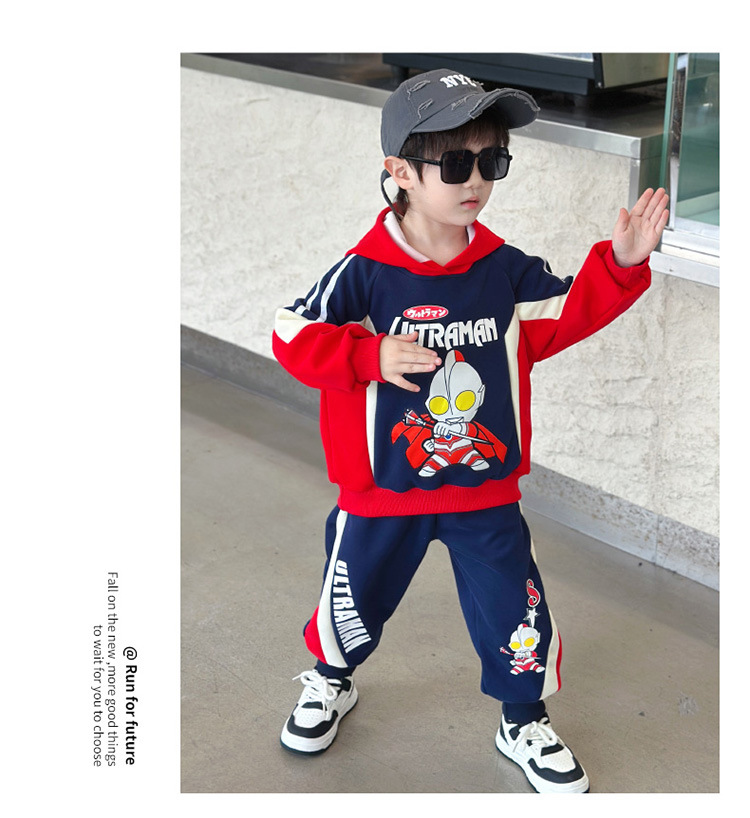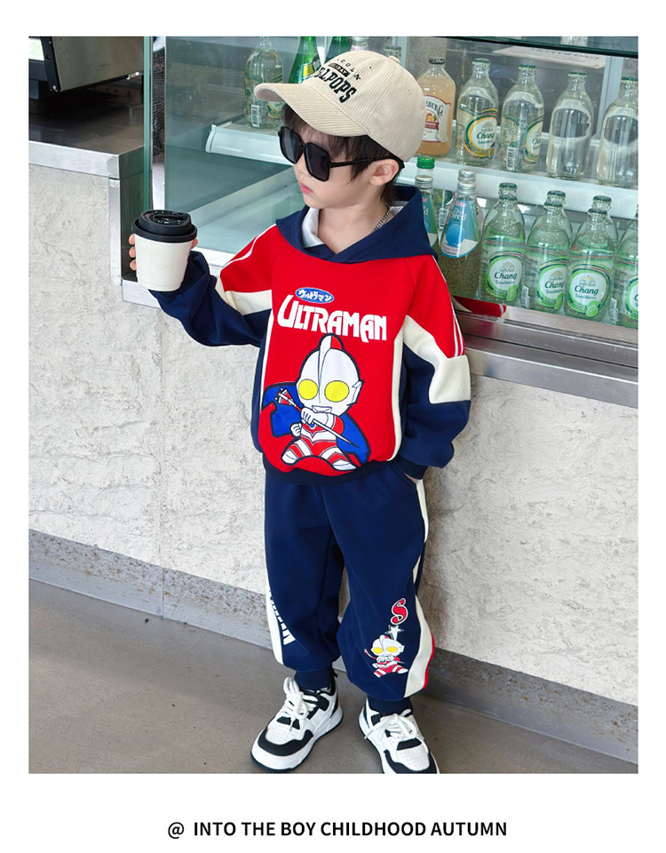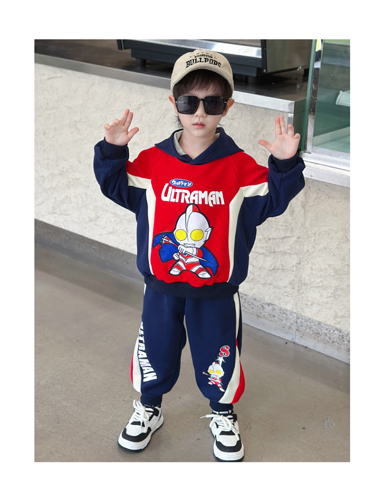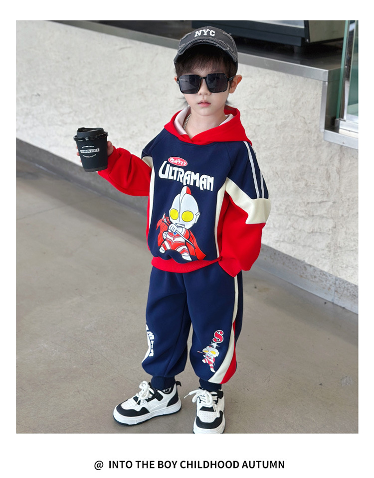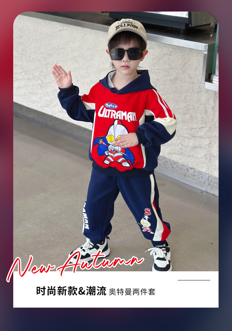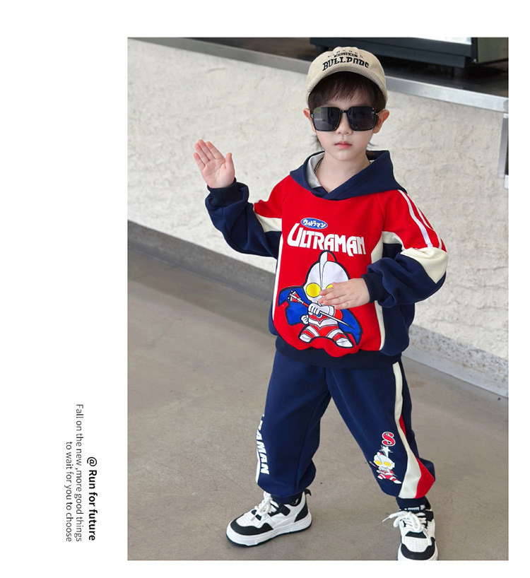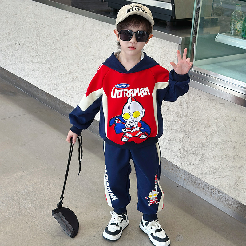 울트라 맨 옷 소년 봄과 가을 세트 2024 새로운 외국 스타일 멋진 잘 생긴 남자의 보물 후드 조끼 2 피스 트렌디 한 옷스토어 가기