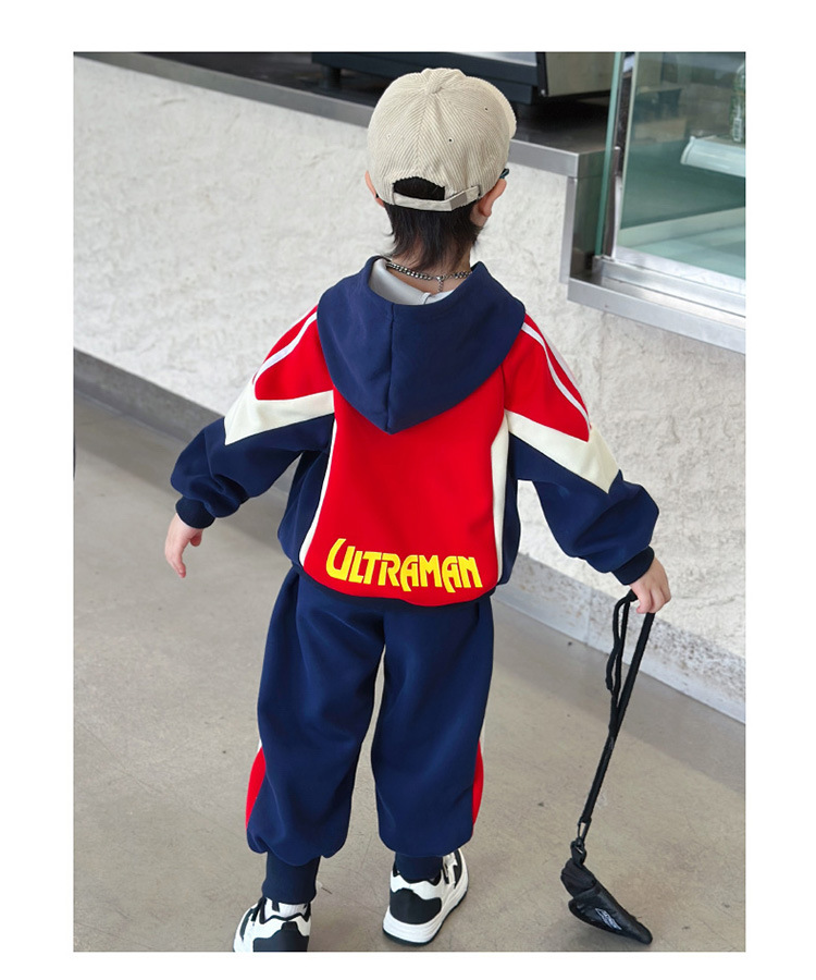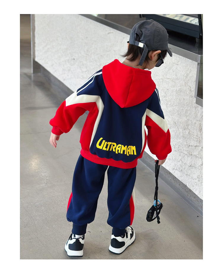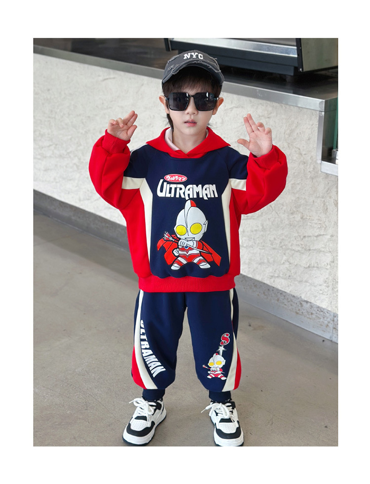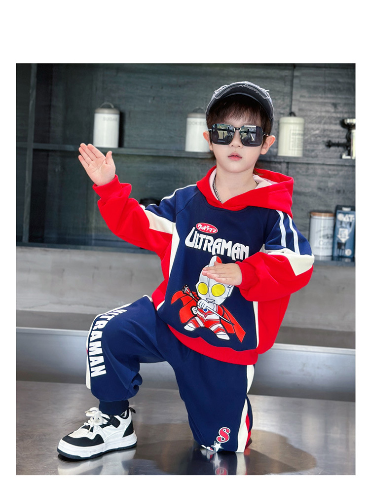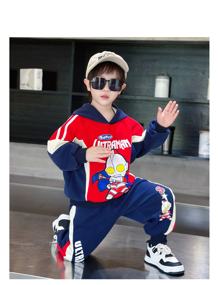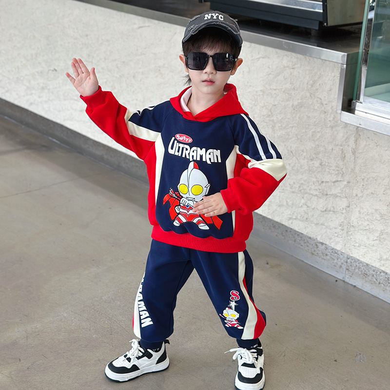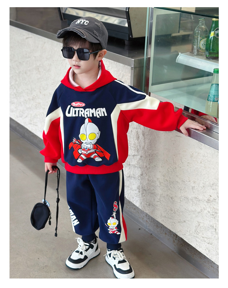울트라 맨 옷 소년 봄과 가을 세트 2024 새로운 외국 스타일 멋진 잘 생긴 남자의 보물 후드 조끼 2 피스 트렌디 한 옷스토어 가기