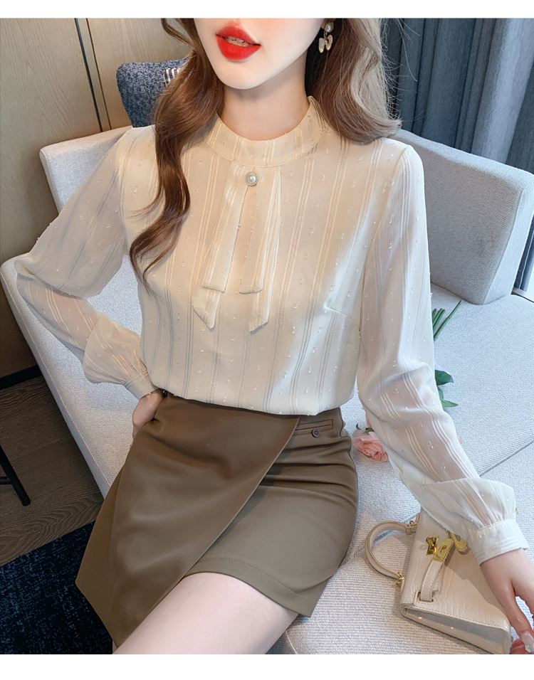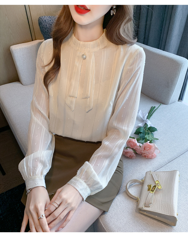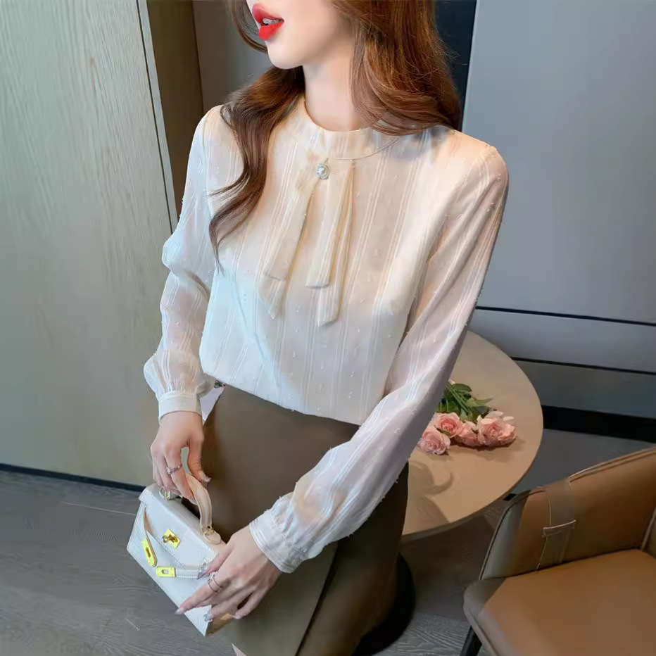 프렌치 스타일의 세련된 긴팔 쉬폰 셔츠 여성용 2024 신상 가을 패션 스탠드 칼라 리본 슬림핏 상의