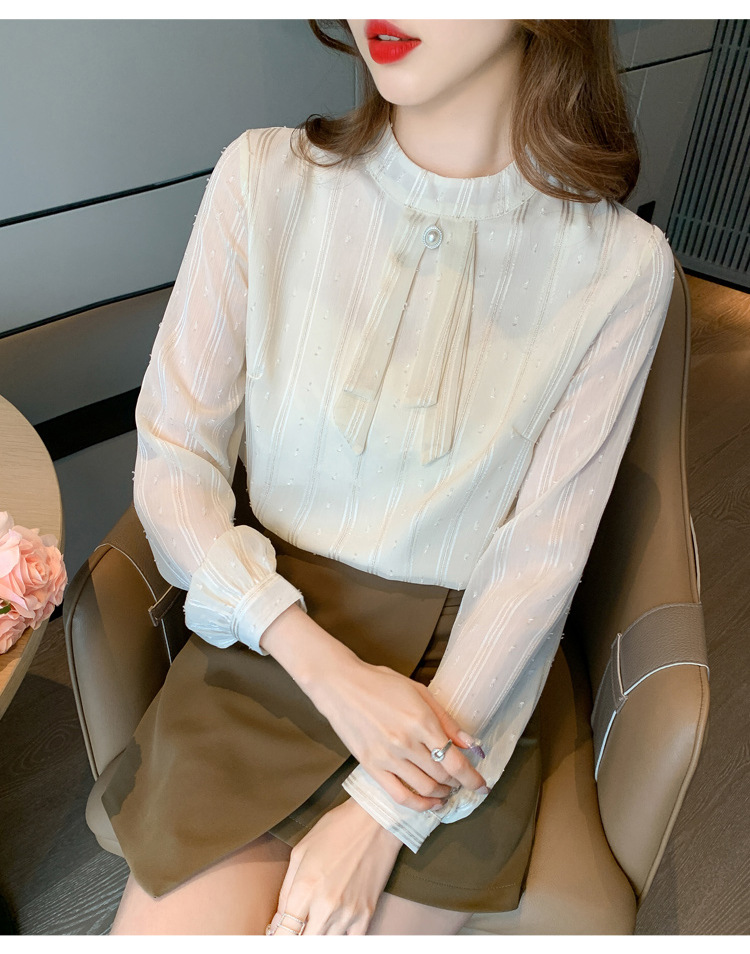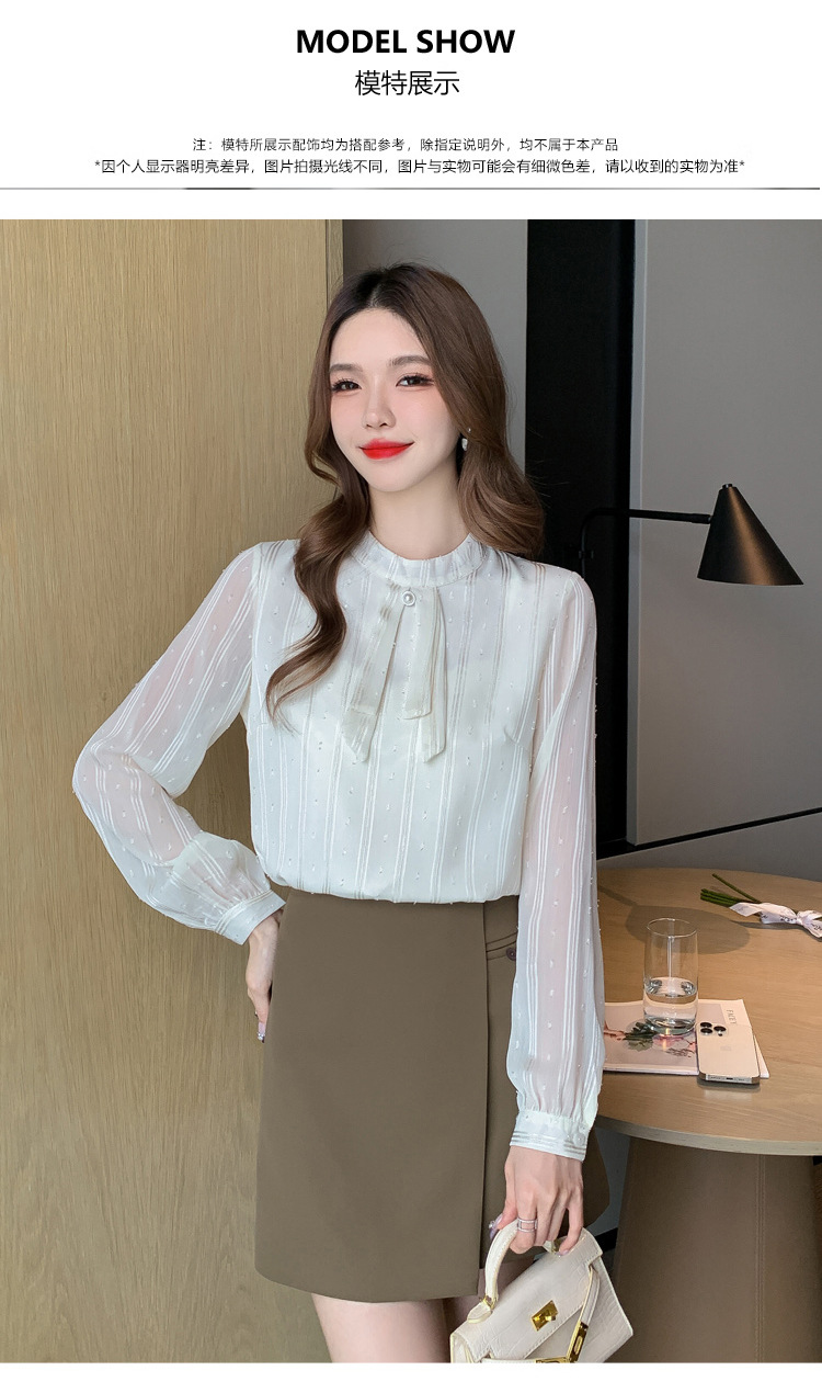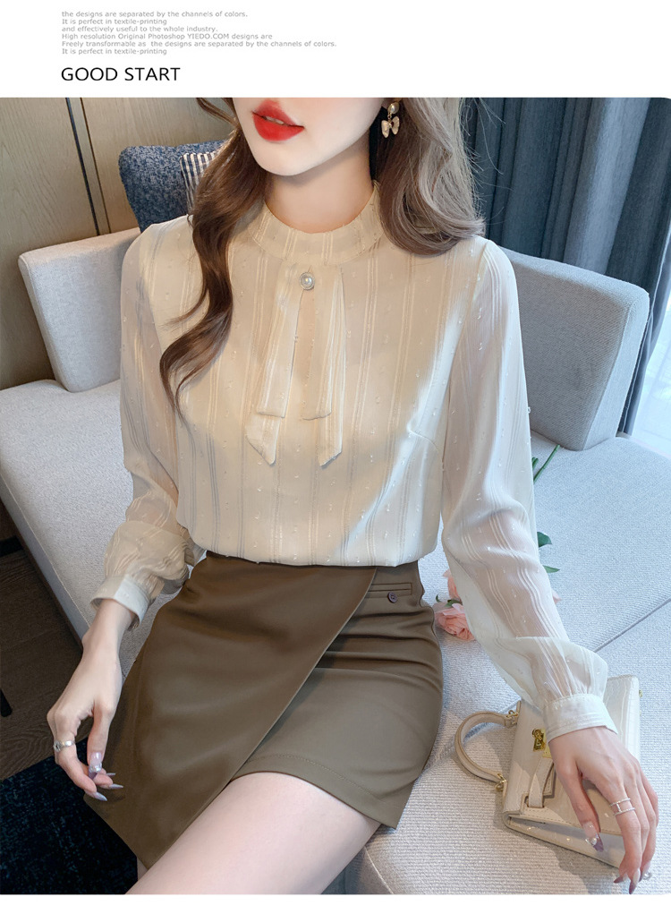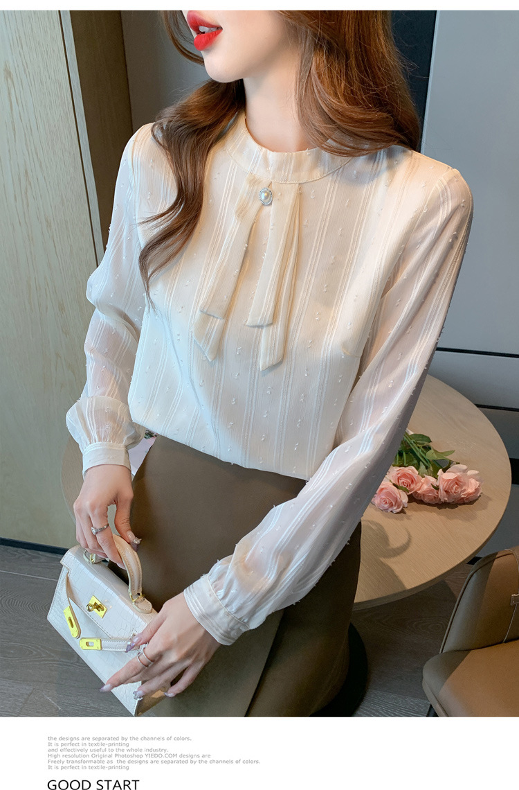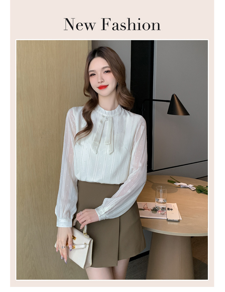 프렌치 스타일의 세련된 긴팔 쉬폰 셔츠 여성용 2024 신상 가을 패션 스탠드 칼라 리본 슬림핏 상의스토어 가기