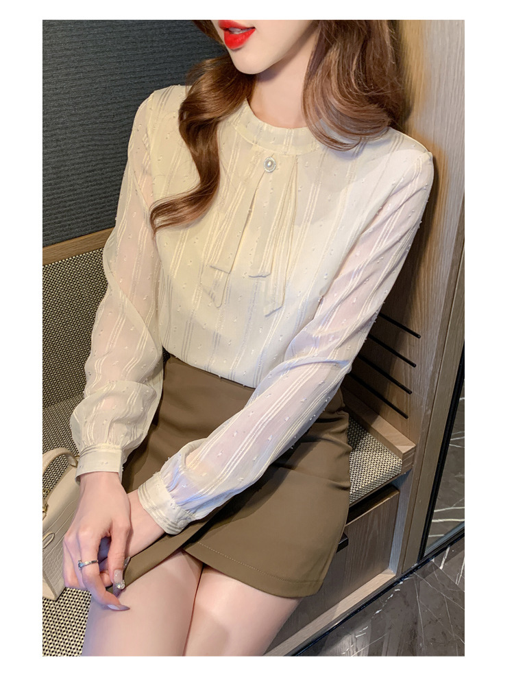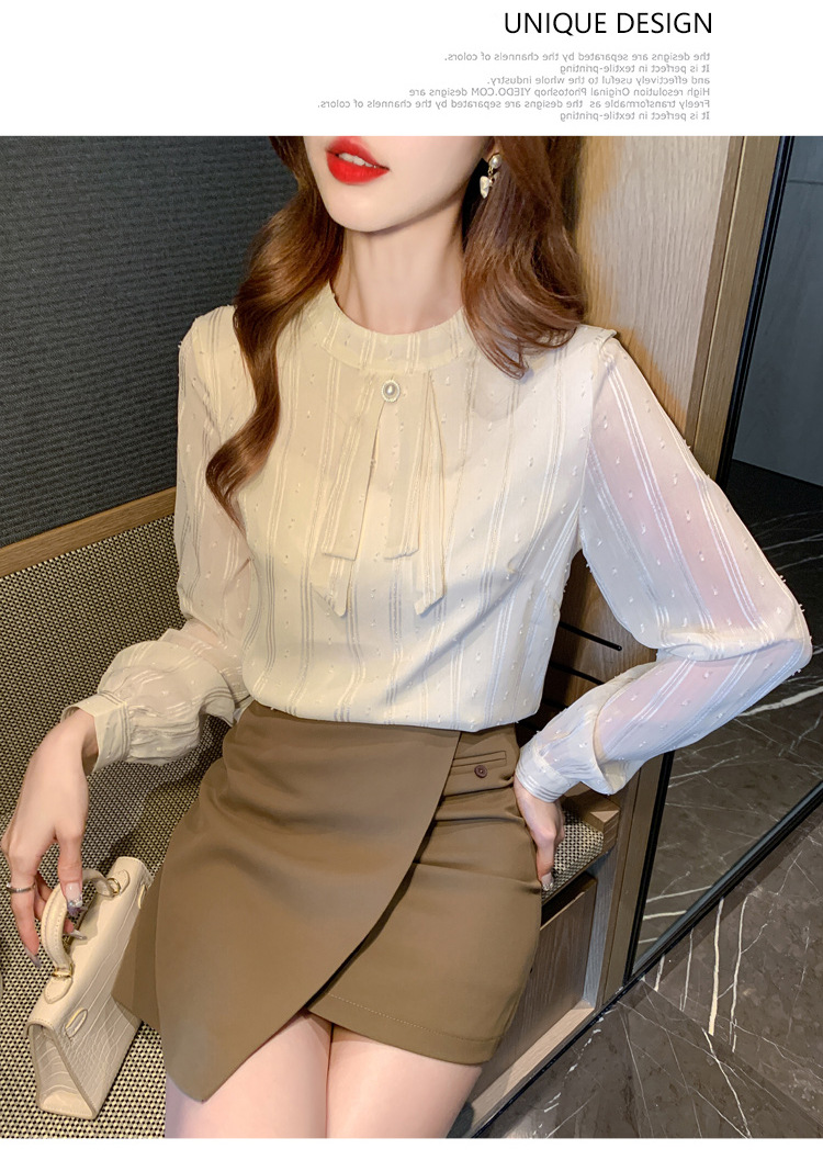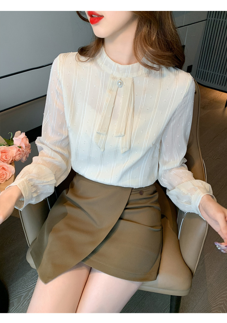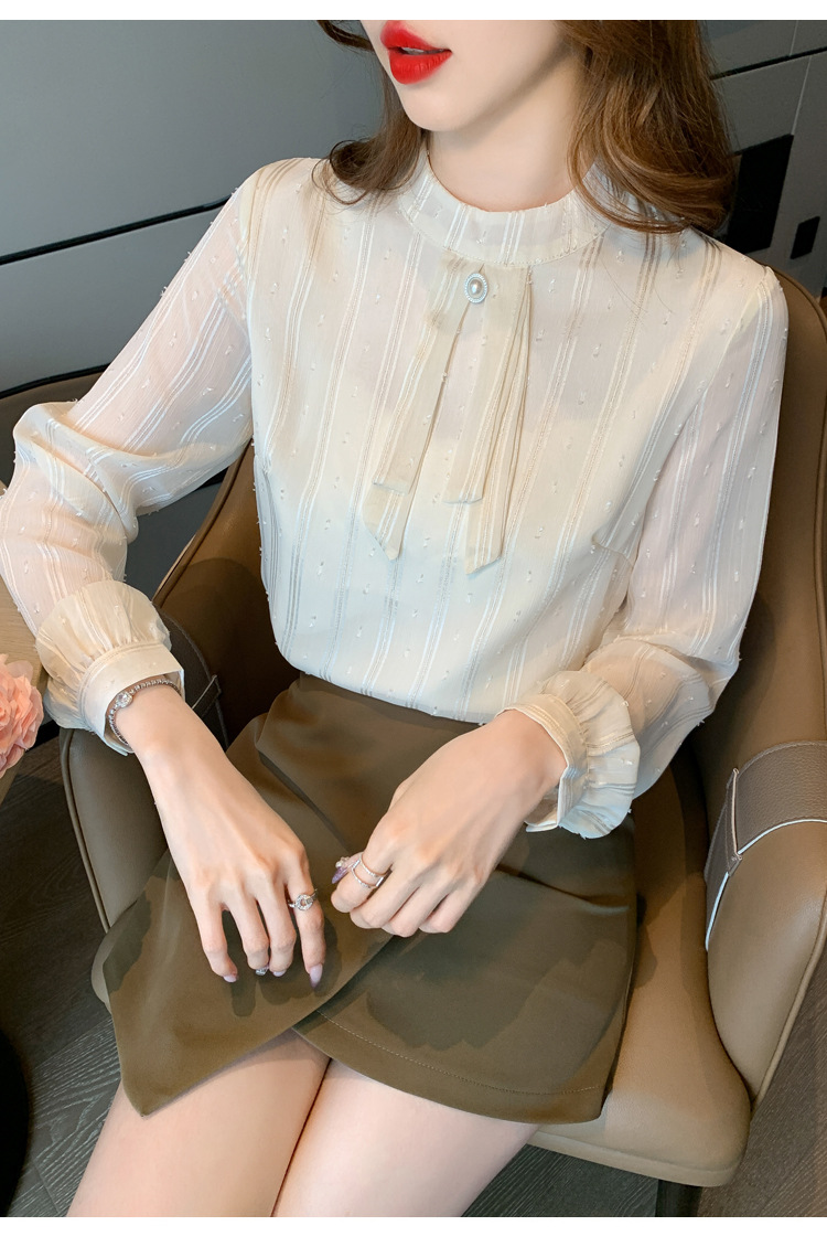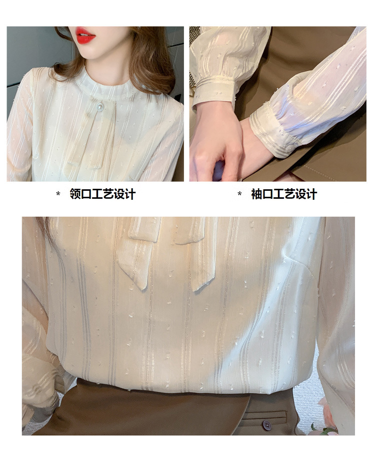 프렌치 스타일의 세련된 긴팔 쉬폰 셔츠 여성용 2024 신상 가을 패션 스탠드 칼라 리본 슬림핏 상의스토어 가기
