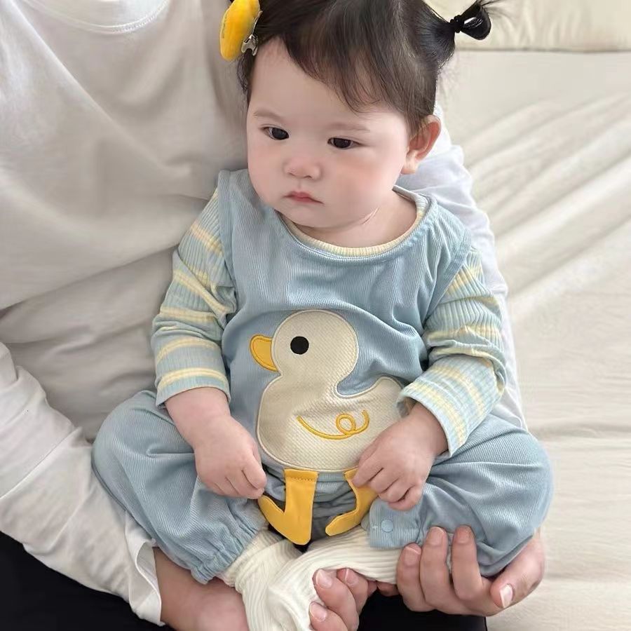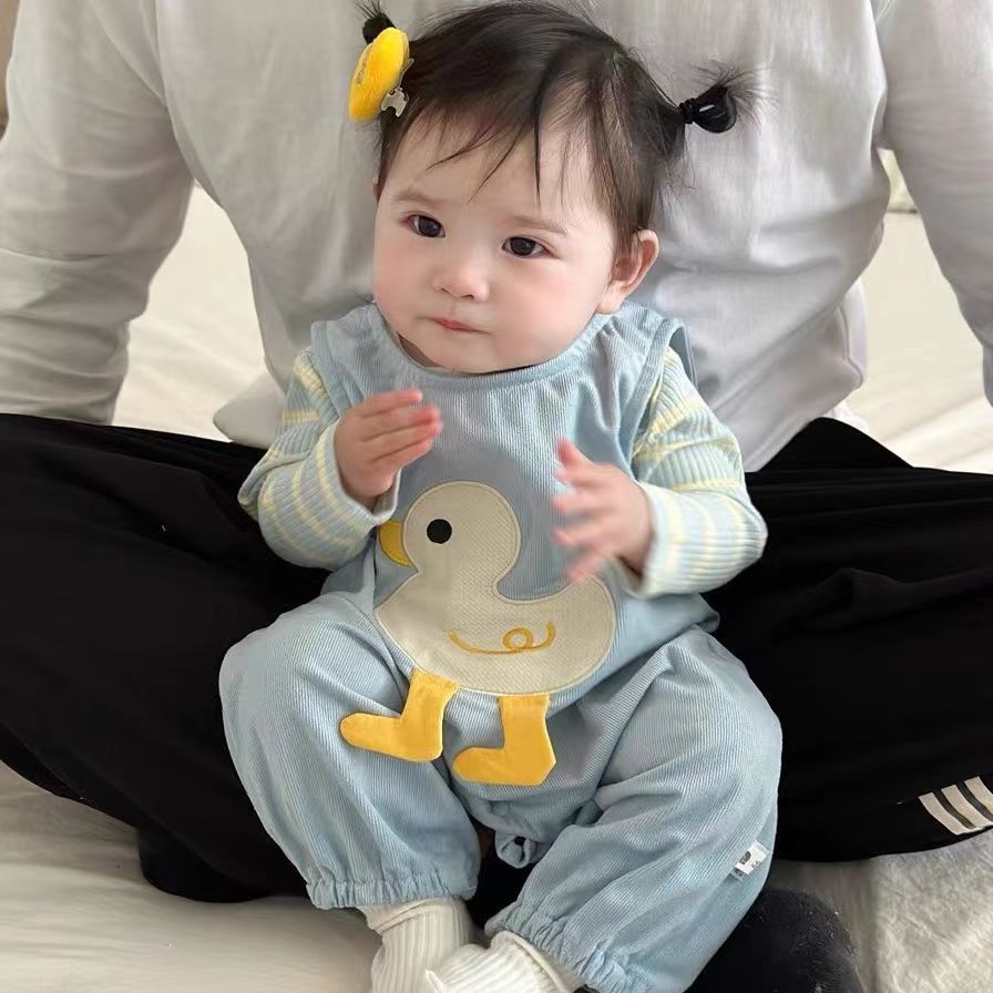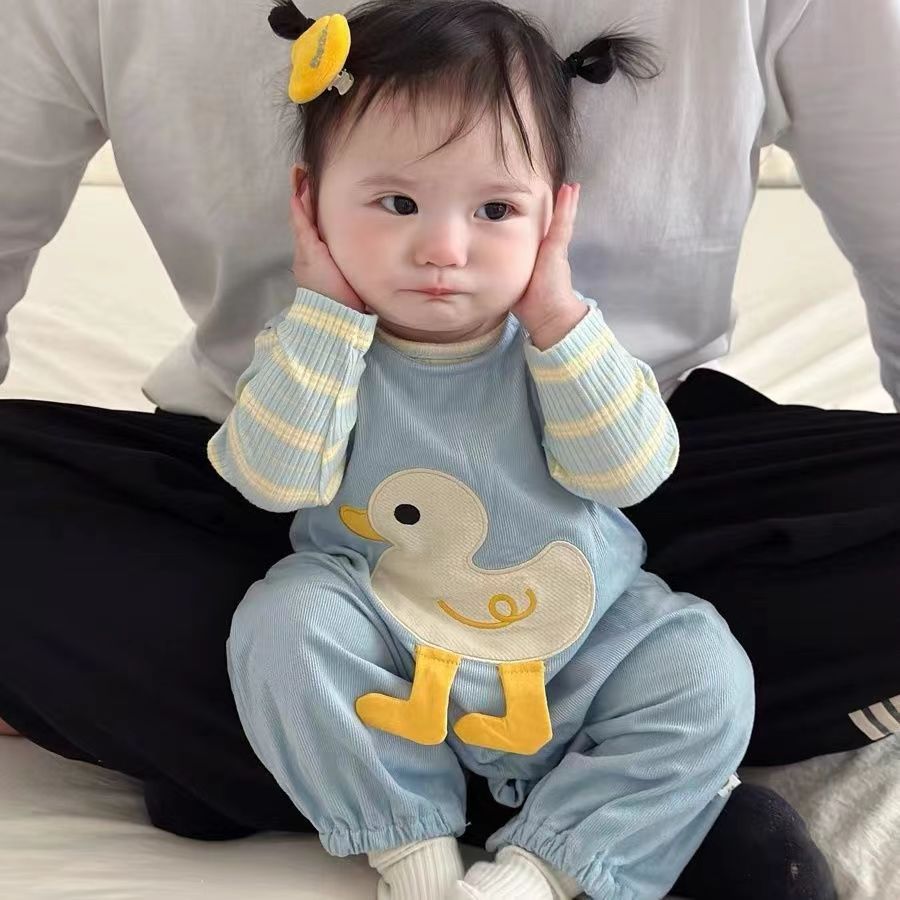 아기 옷 가을 세트 여성의 귀여운 줄무늬 병 셔츠 오리 슈퍼 귀여운 작업복 2 종 세트스토어 가기