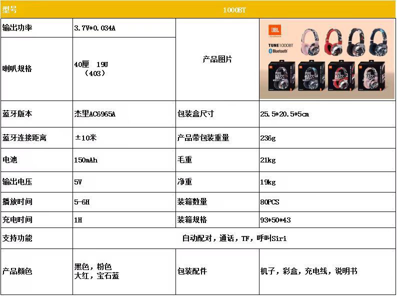JBL1000BT 노이즈 캔슬링 헤드폰 무선 블루투스 이어폰 접이식 개인 맞춤형 로고 신형