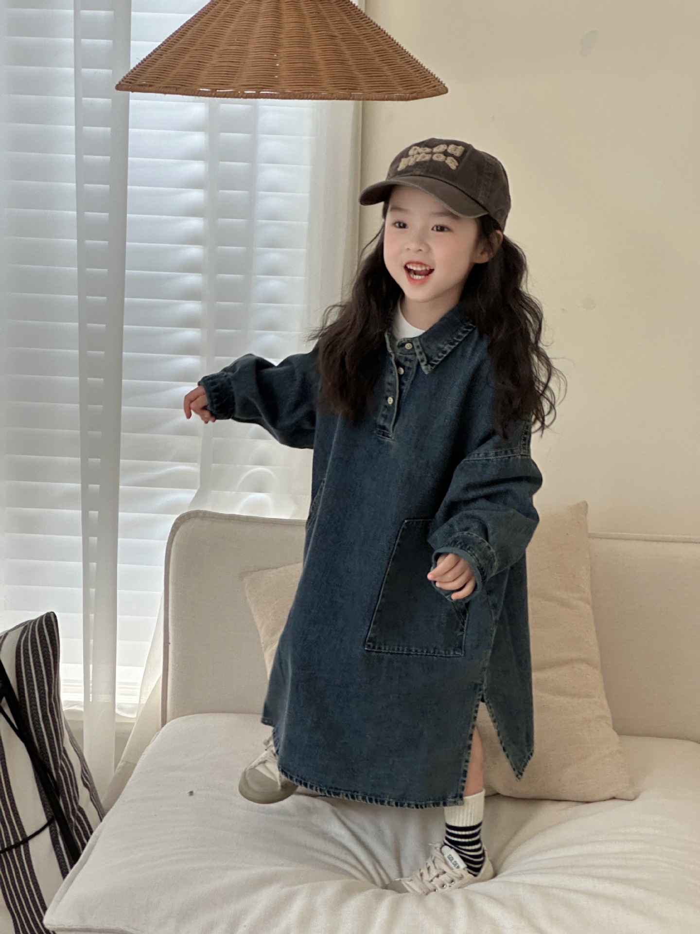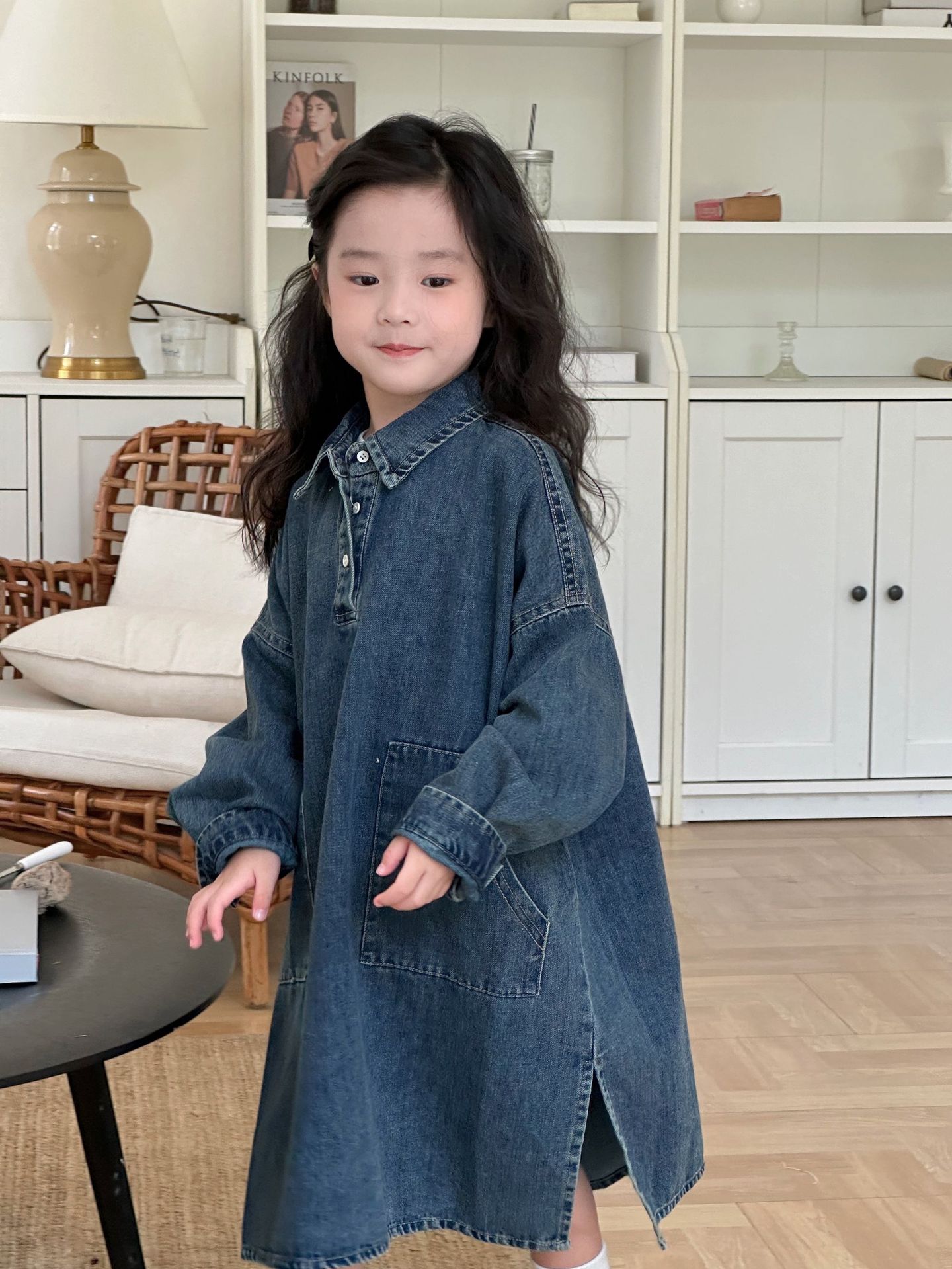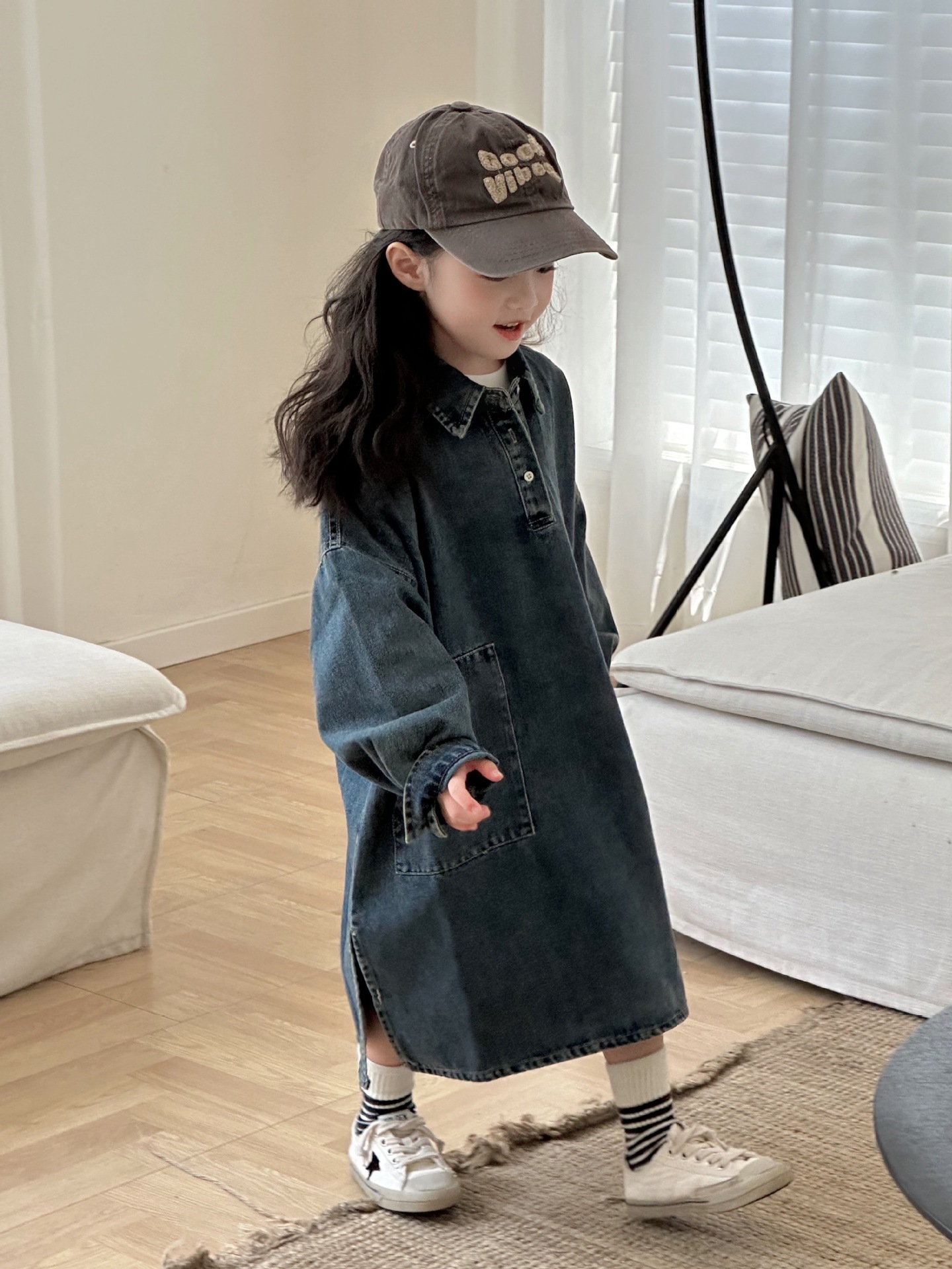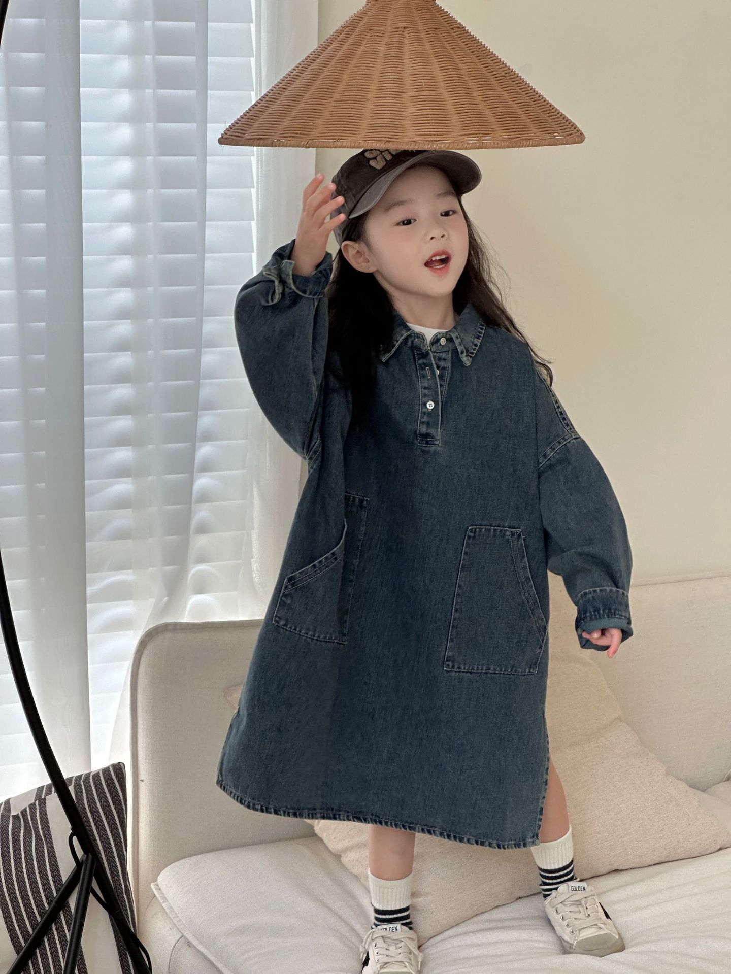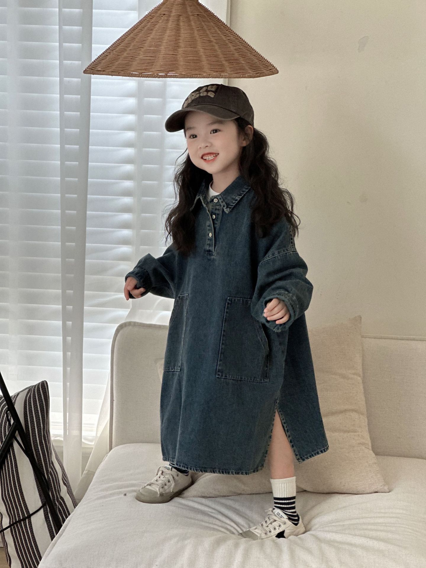 가을 새로운 소녀 빈티지 데님 원피스 한국 어린이 착용 아기 유행 옷깃 긴 소매 원피스 셔츠 원피스스토어 가기