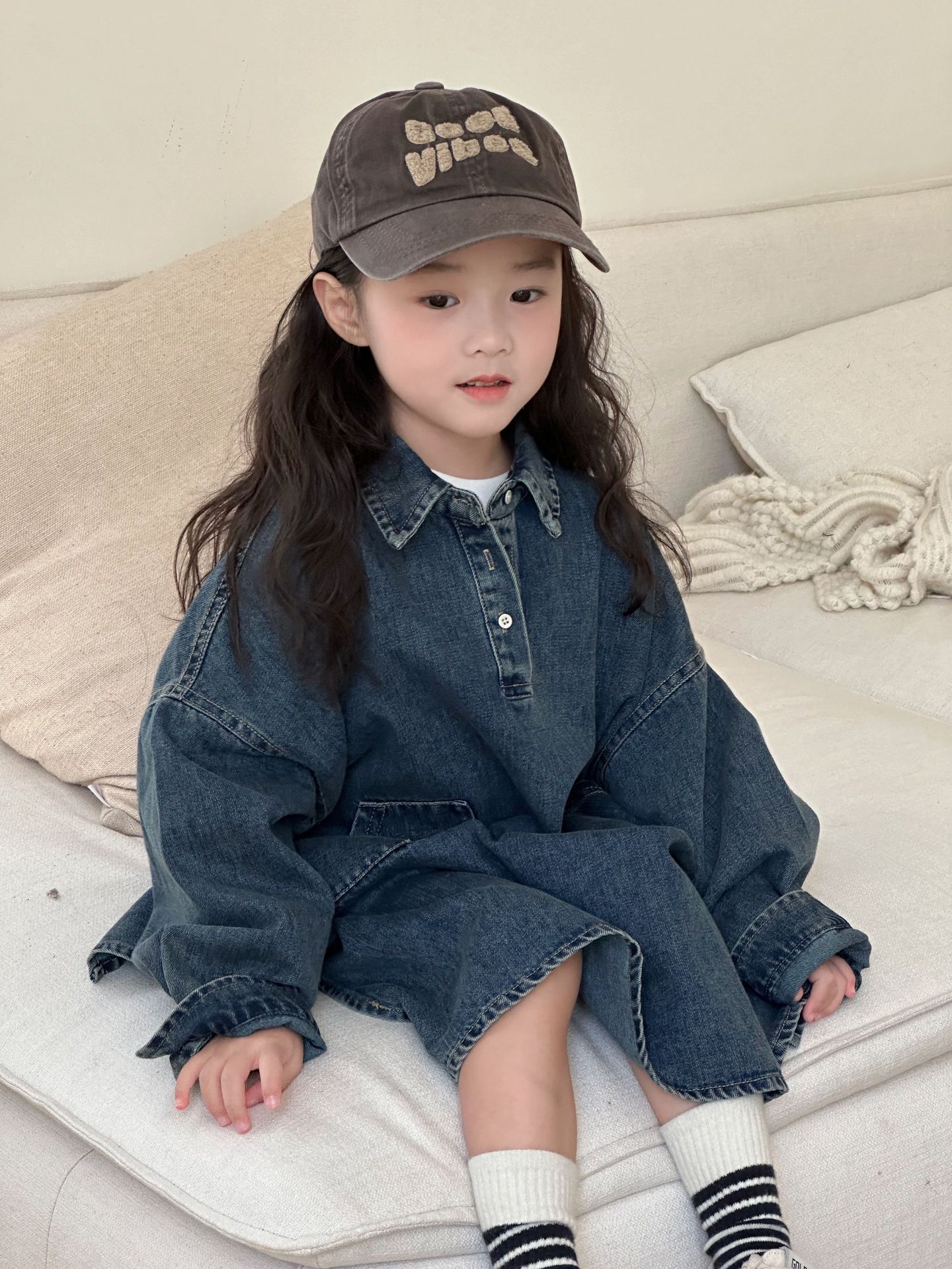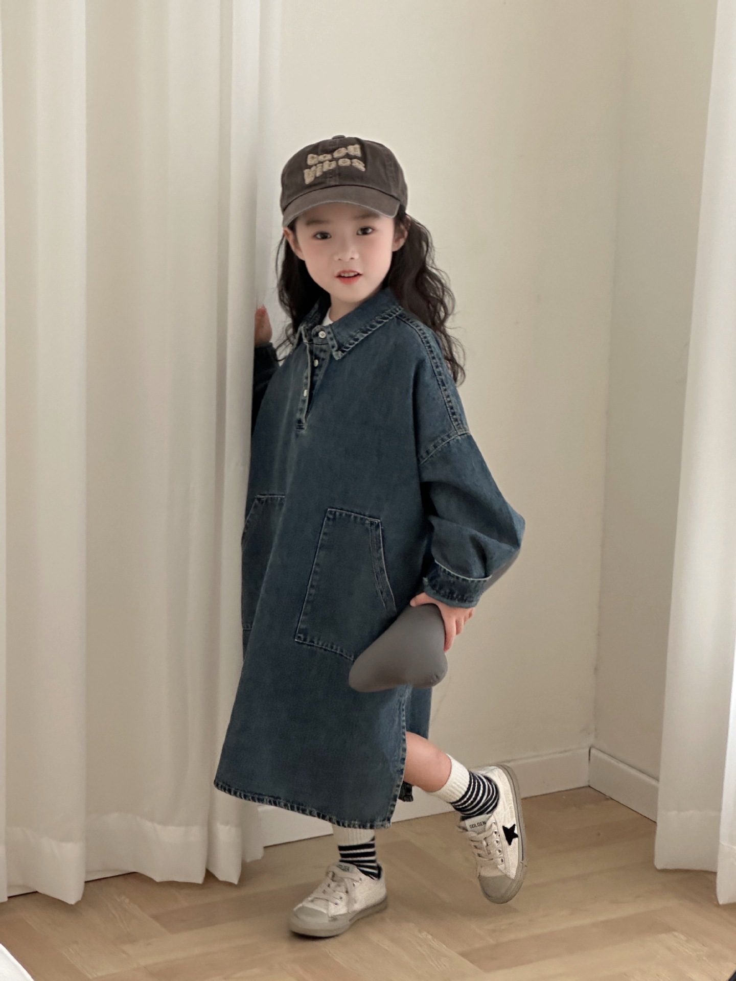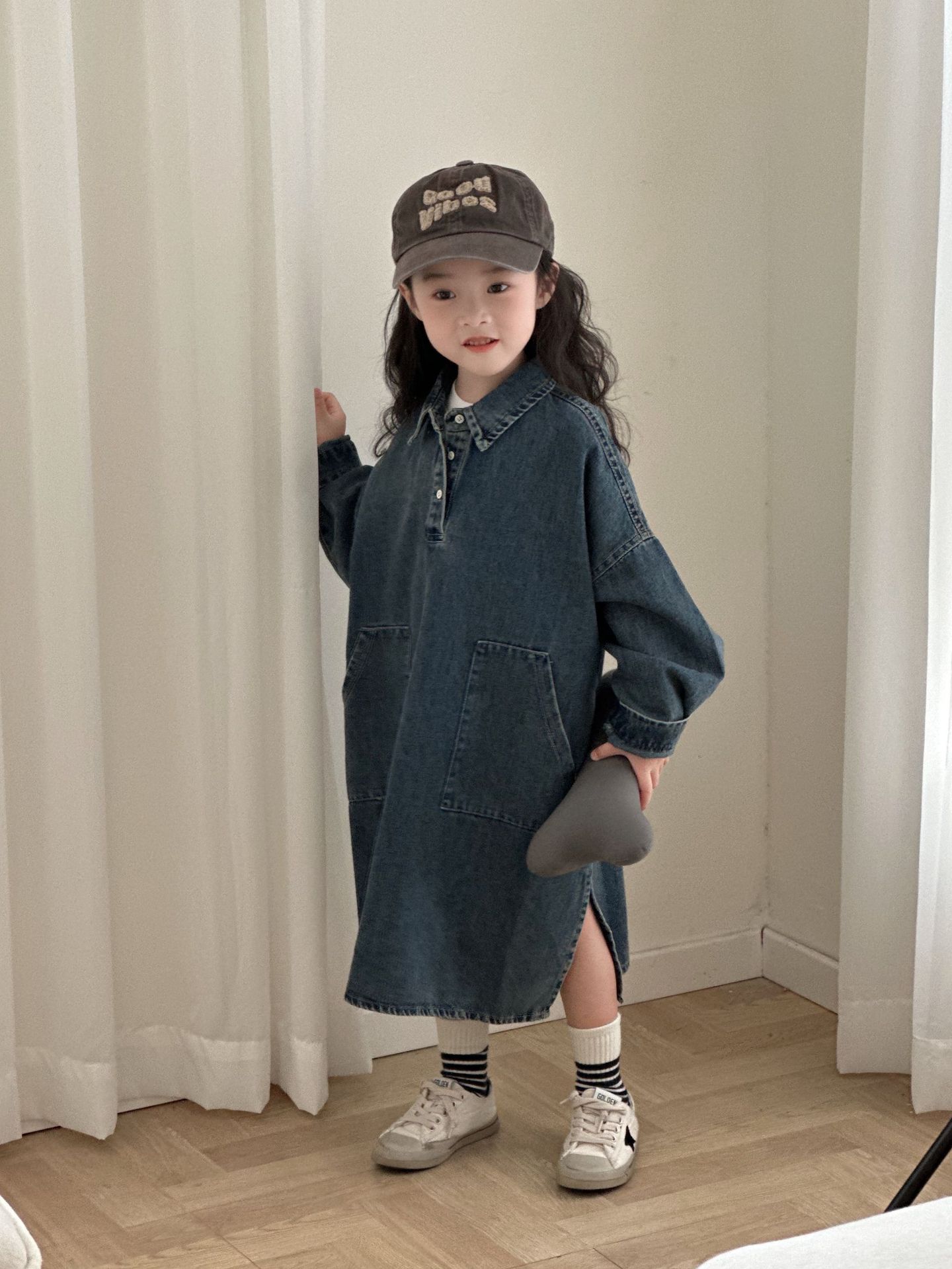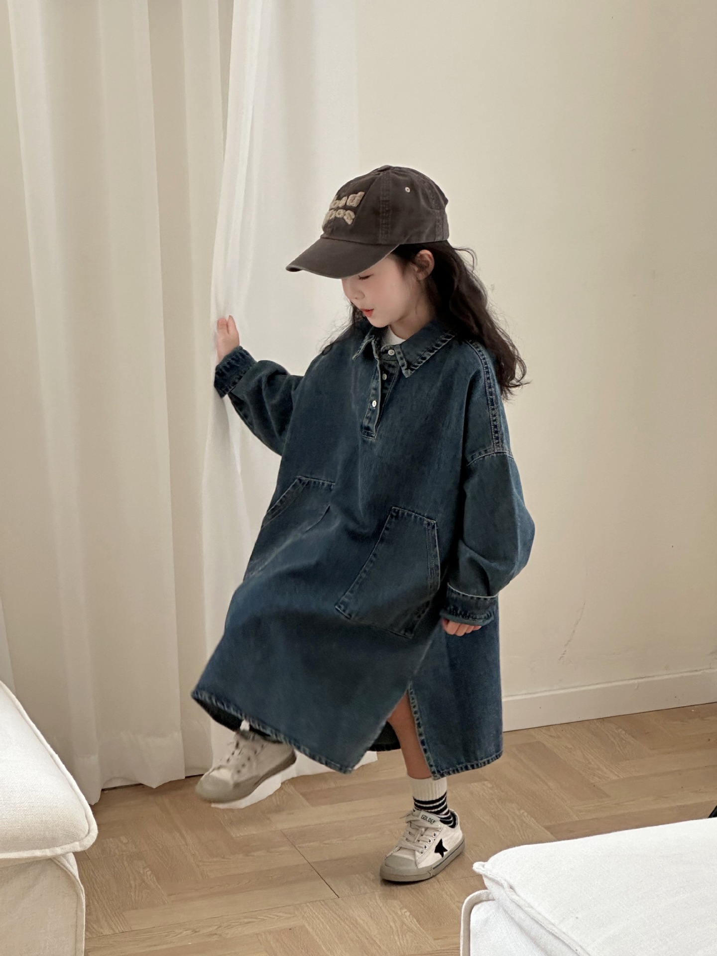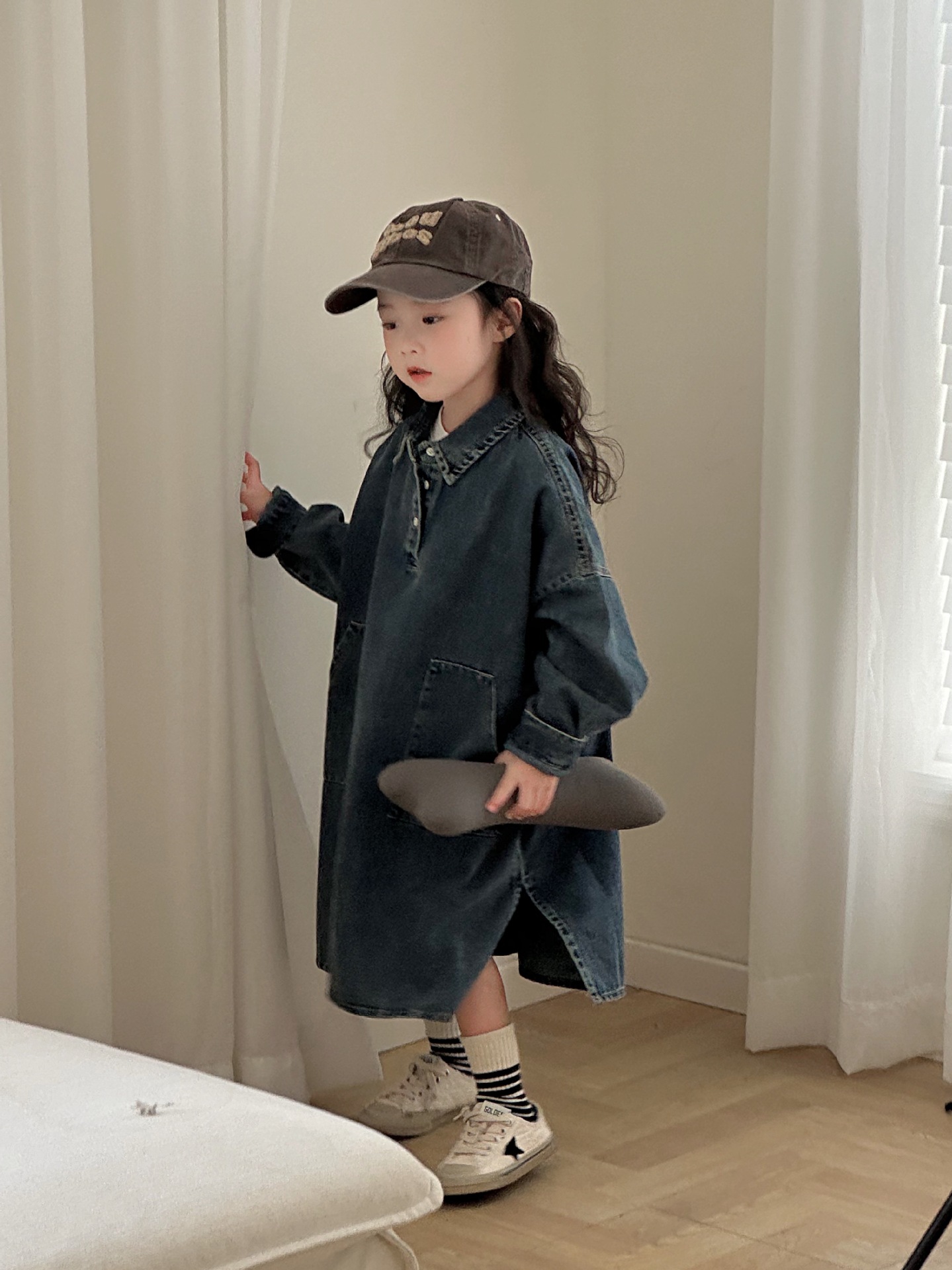 가을 새로운 소녀 빈티지 데님 원피스 한국 어린이 착용 아기 유행 옷깃 긴 소매 원피스 셔츠 원피스스토어 가기