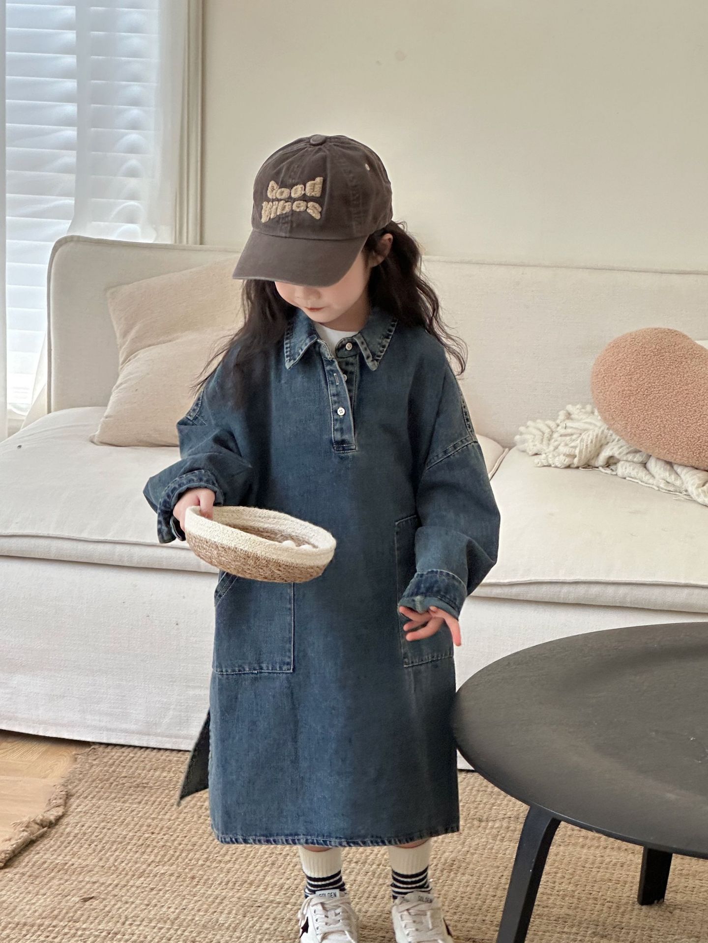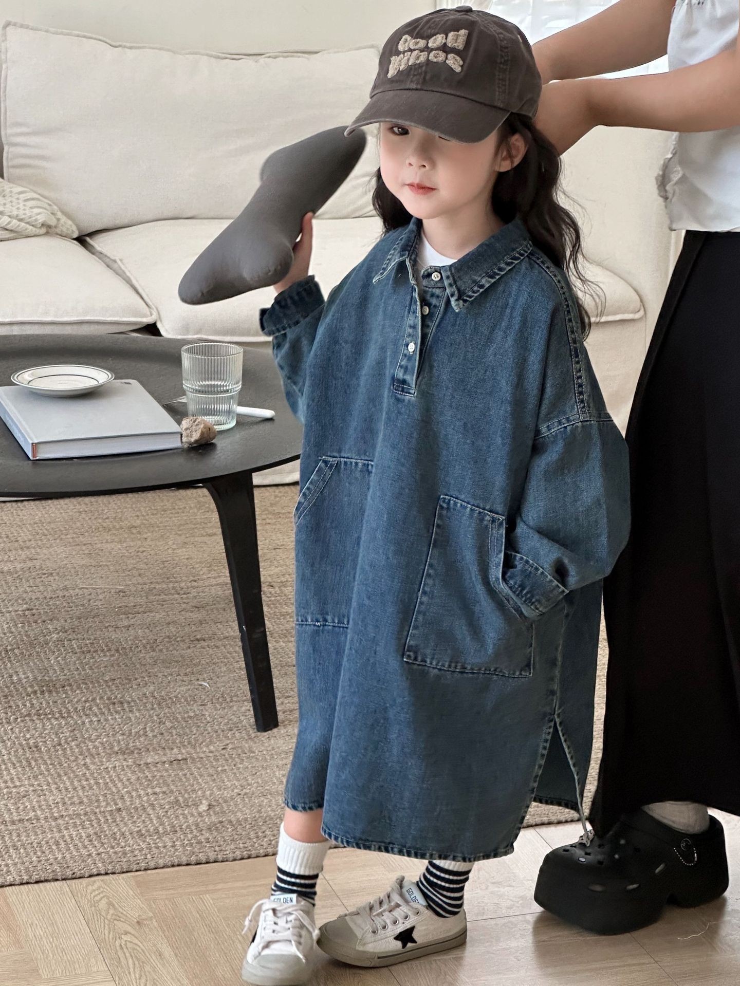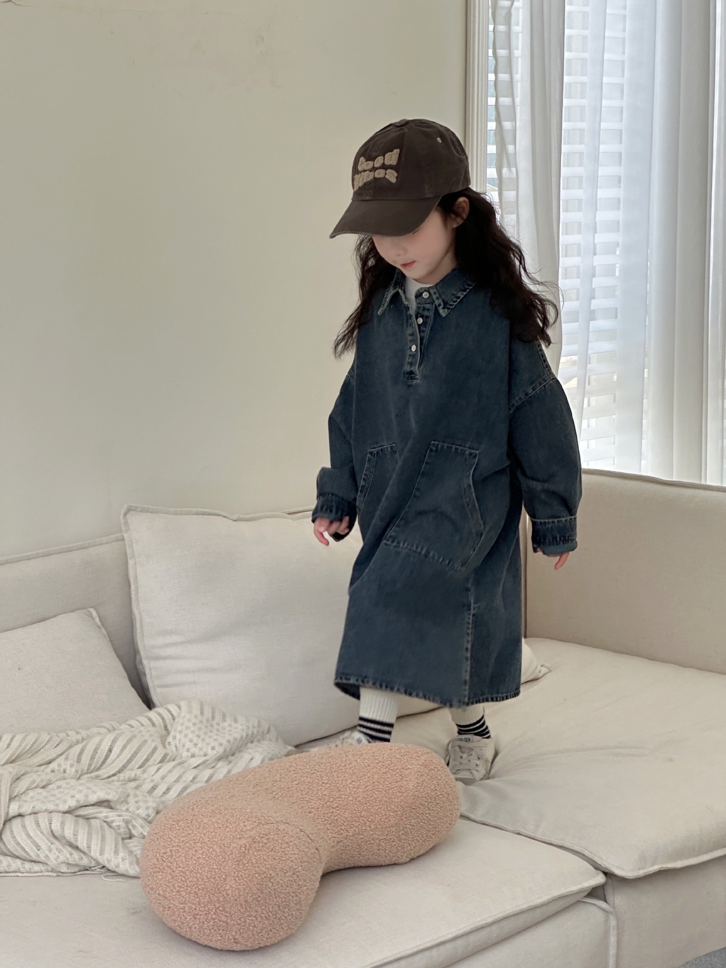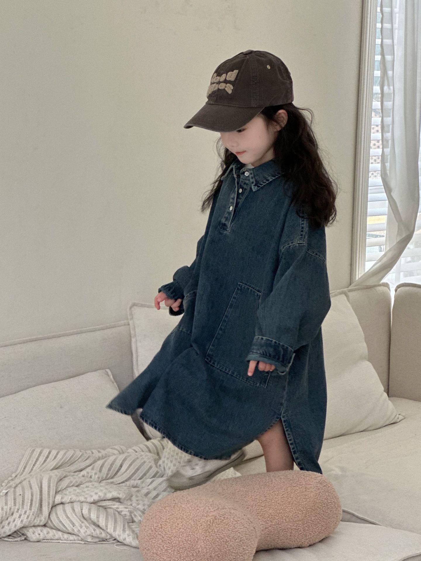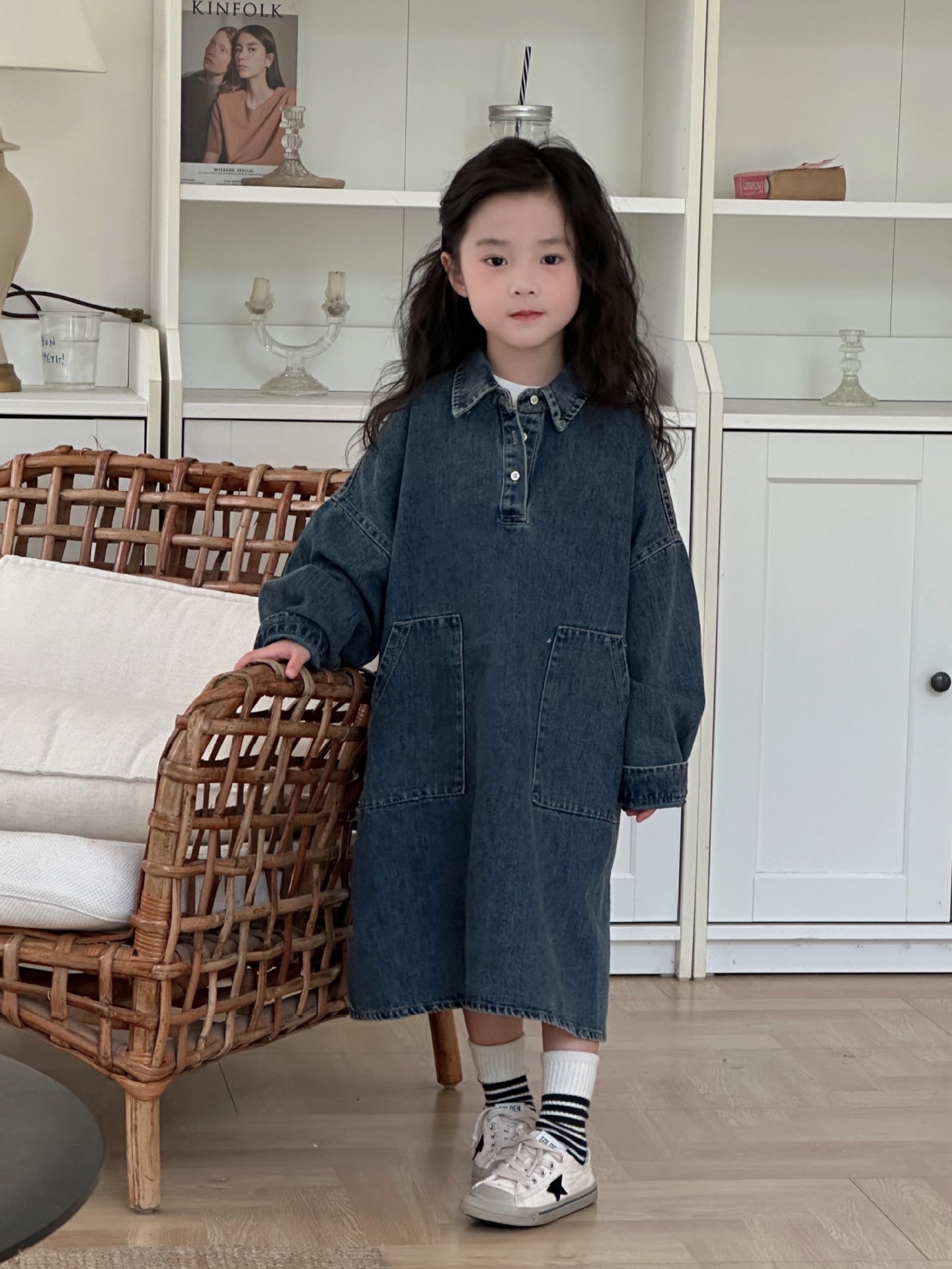 가을 새로운 소녀 빈티지 데님 원피스 한국 어린이 착용 아기 유행 옷깃 긴 소매 원피스 셔츠 원피스스토어 가기