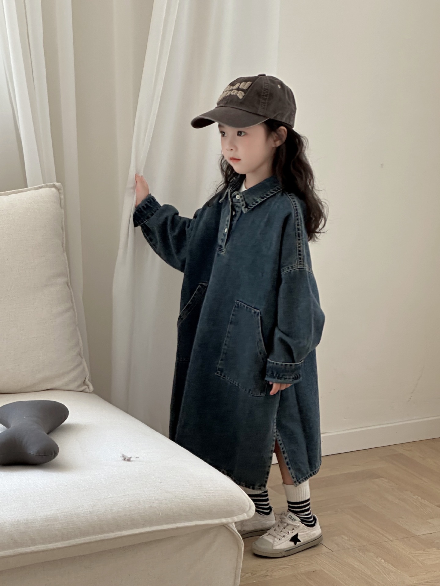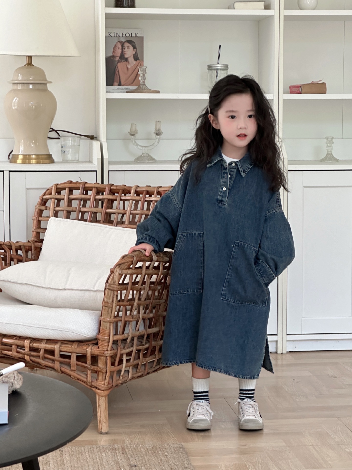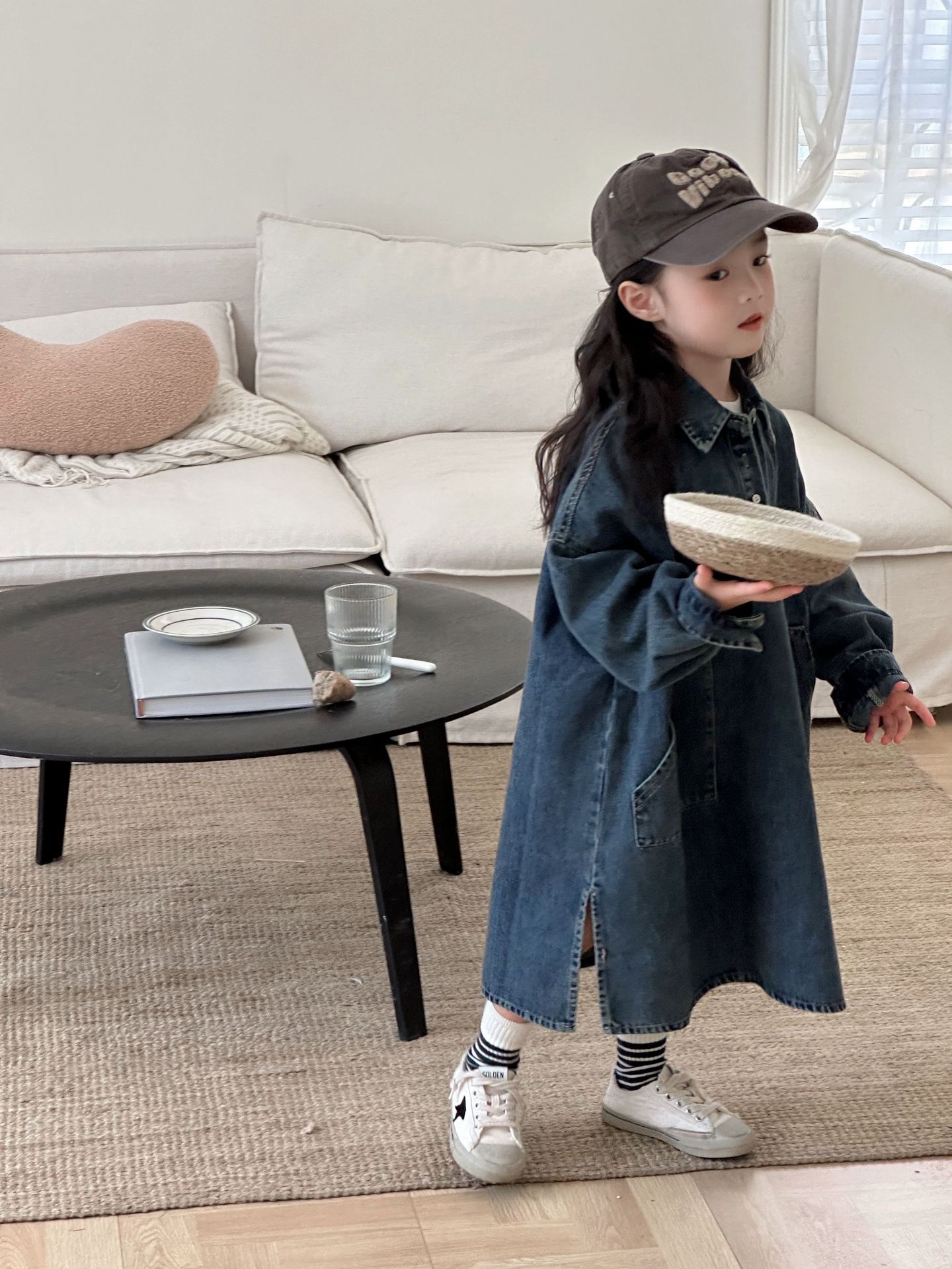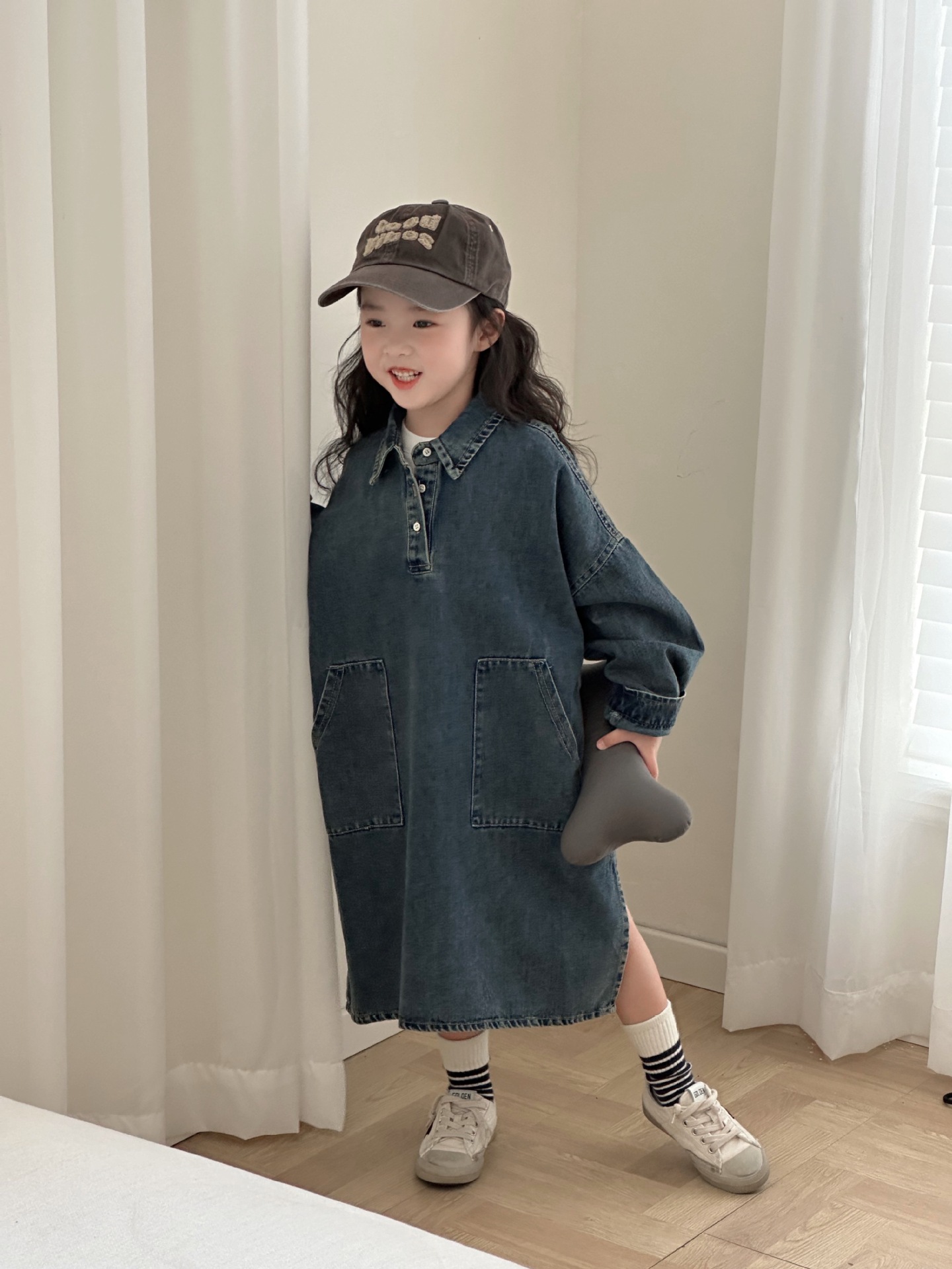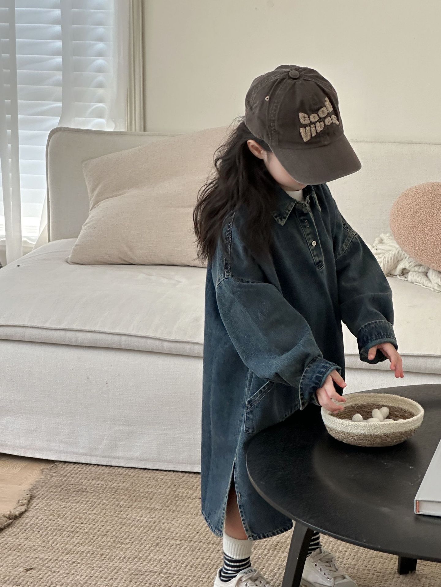 가을 새로운 소녀 빈티지 데님 원피스 한국 어린이 착용 아기 유행 옷깃 긴 소매 원피스 셔츠 원피스스토어 가기