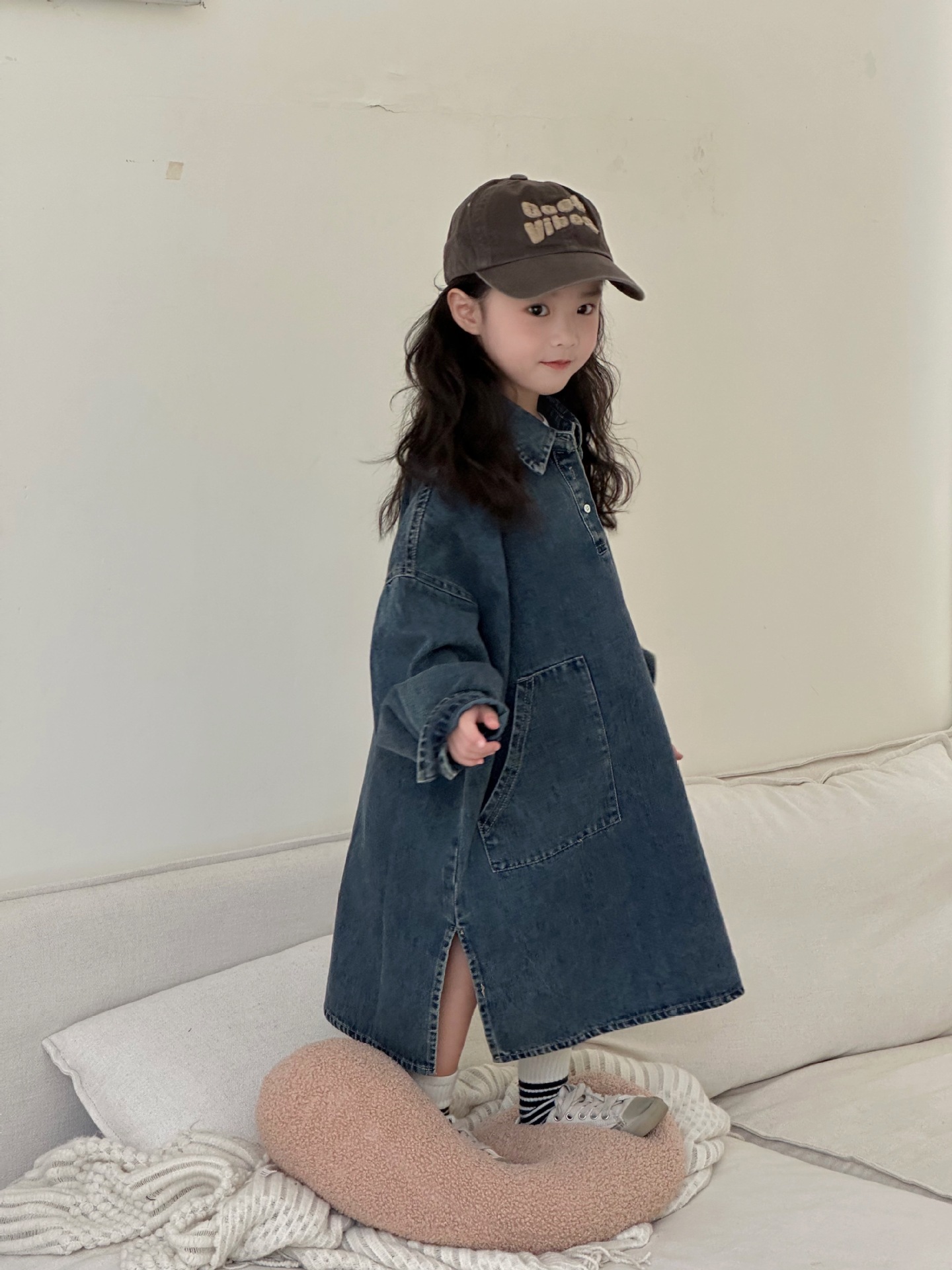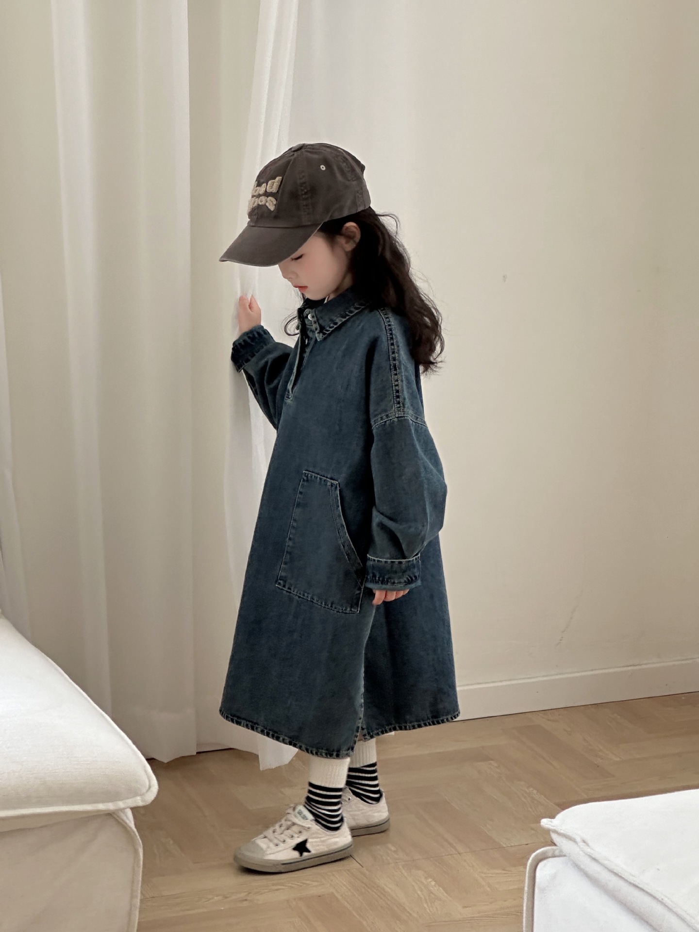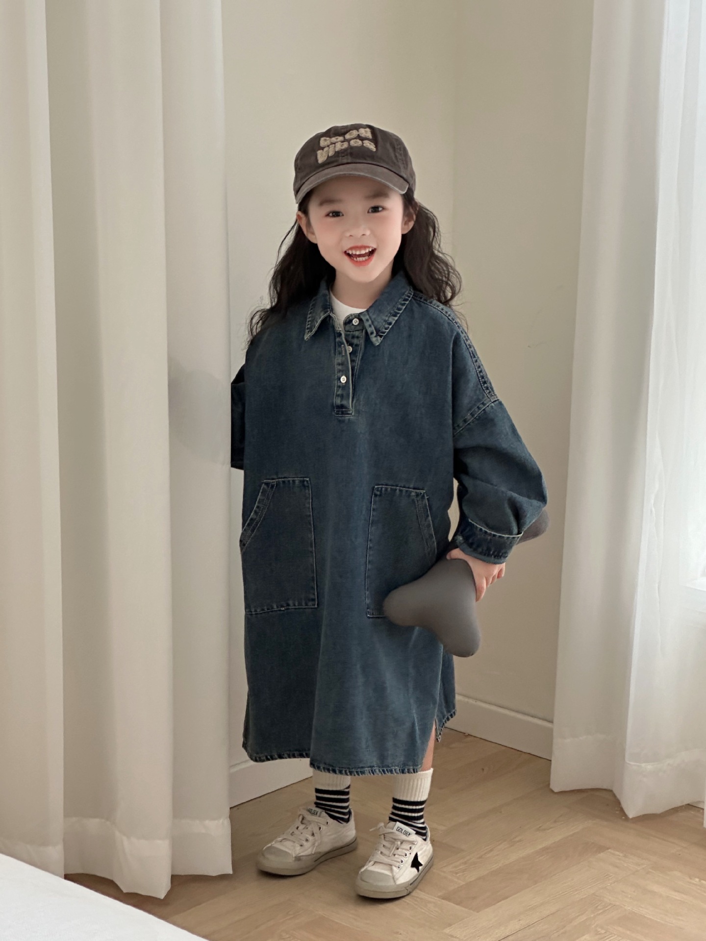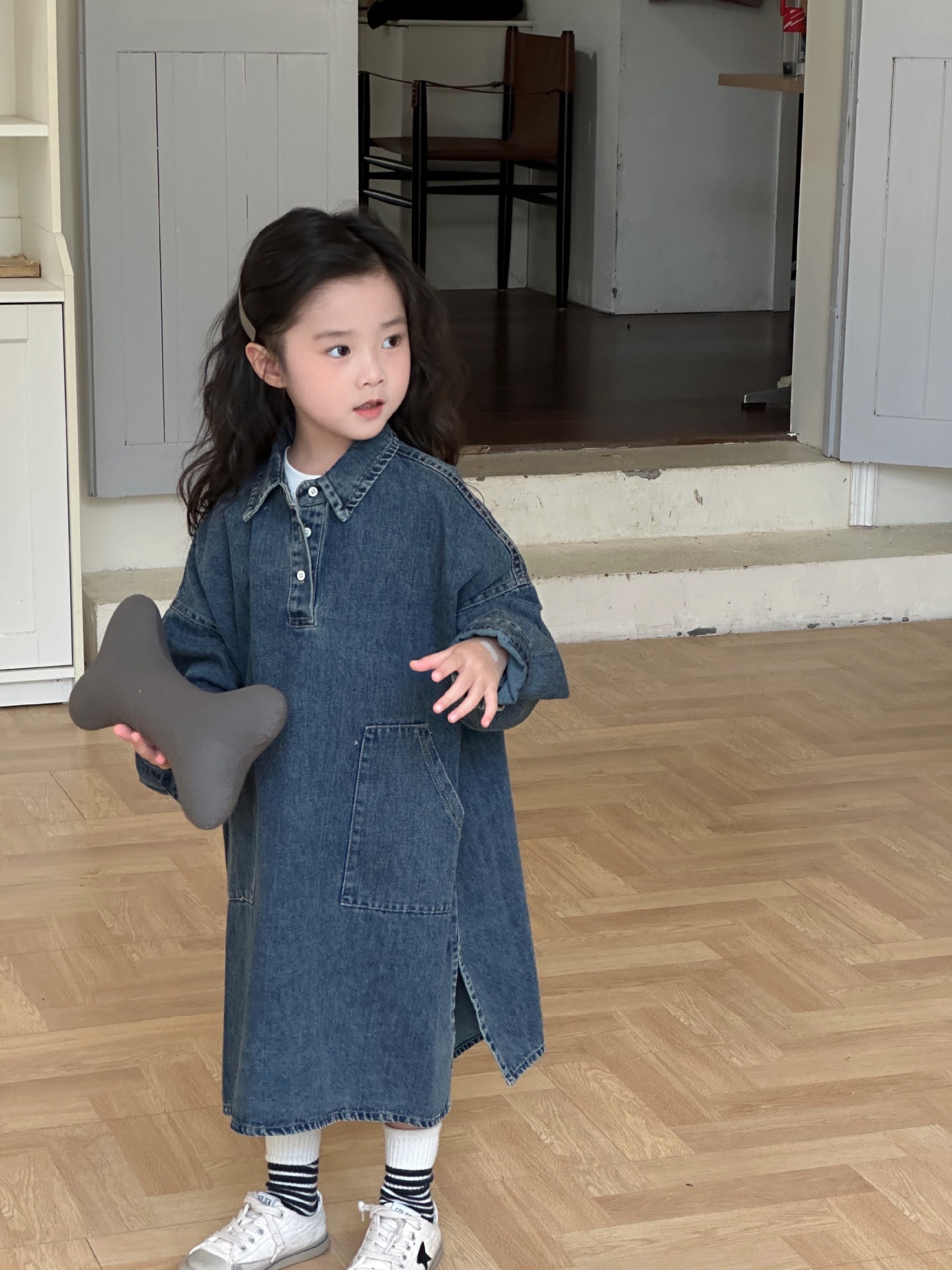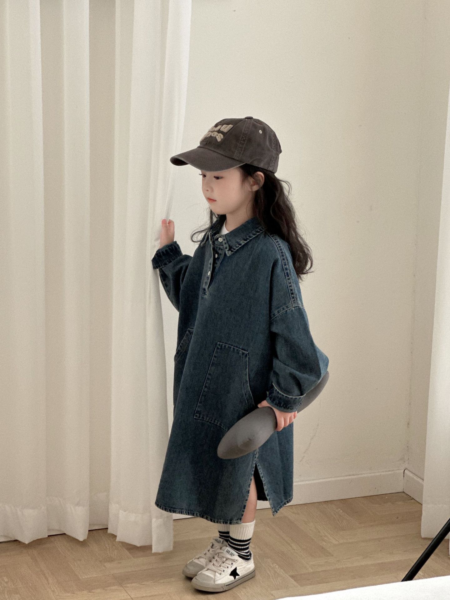 가을 새로운 소녀 빈티지 데님 원피스 한국 어린이 착용 아기 유행 옷깃 긴 소매 원피스 셔츠 원피스스토어 가기