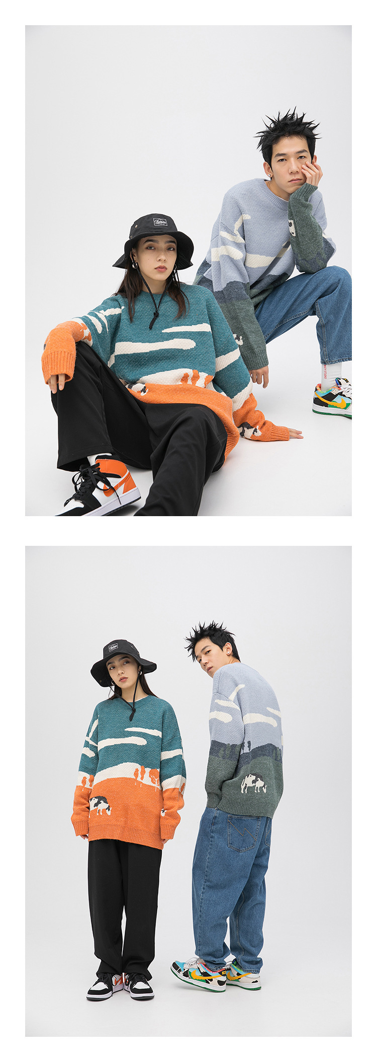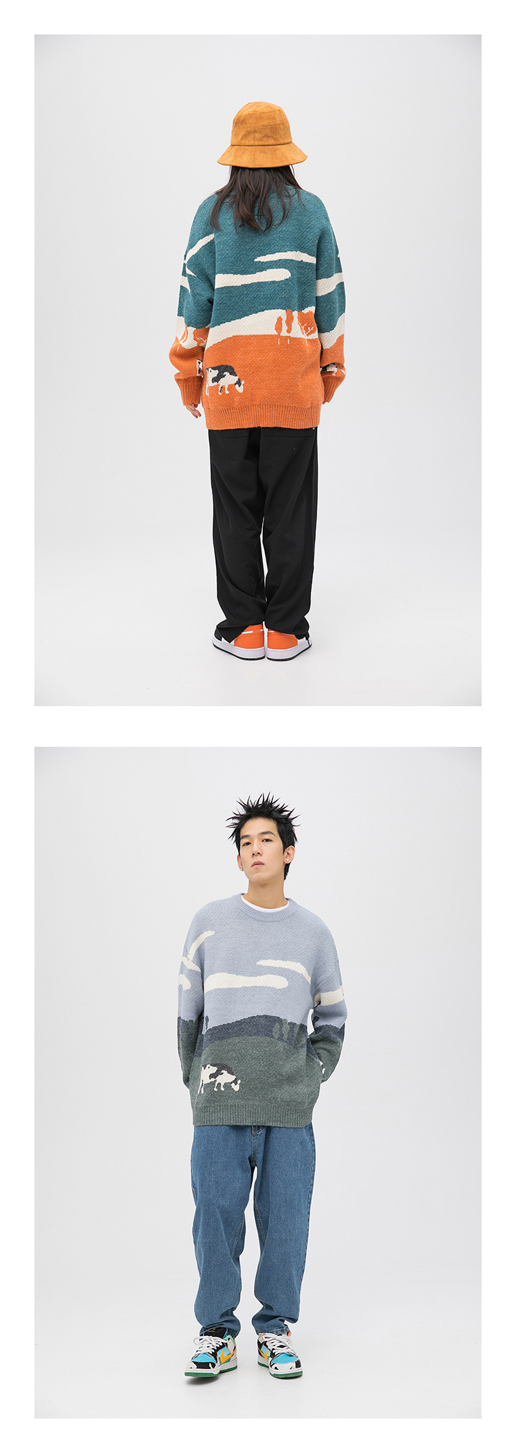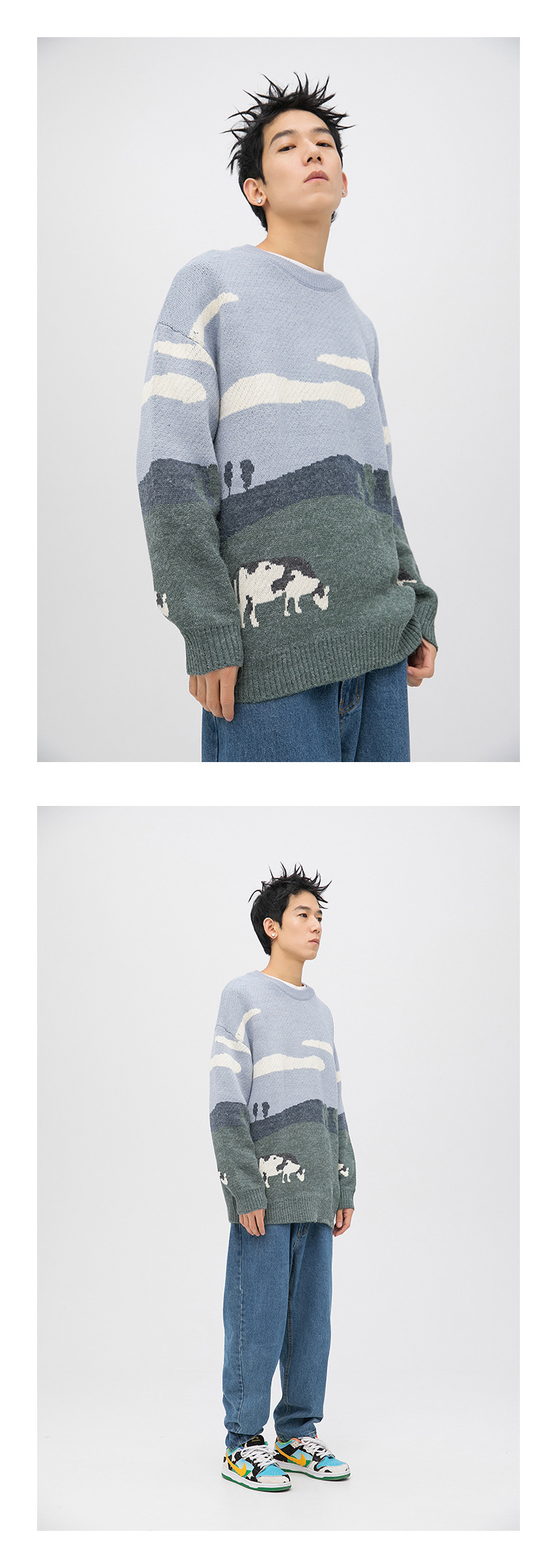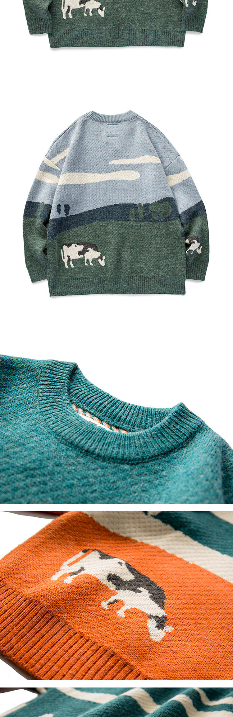 남자의 재미있는 소 신선한 둥근 목 스웨터 유행 브랜드 일본 스타일 풀오버 홍콩 스타일 Ins 컬러 스플릿 니트웨어 탑 옷스토어 가기