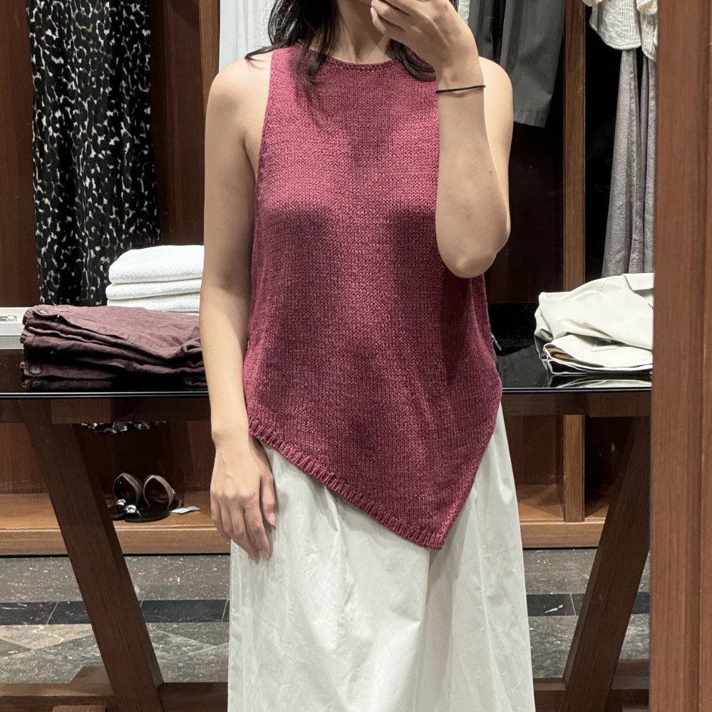 재고 M 스타일 여성용 레트로 레드 비대칭 헴 디자인 라운드 넥 민소매 니트 티셔츠 조끼 탑