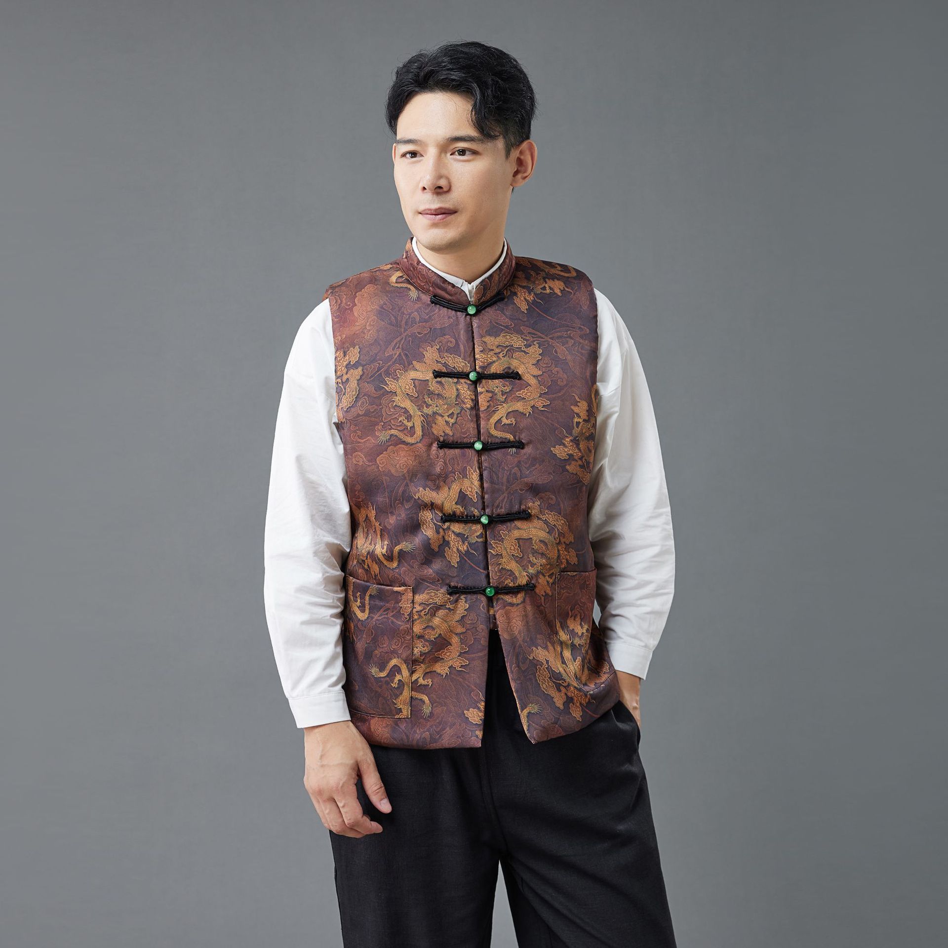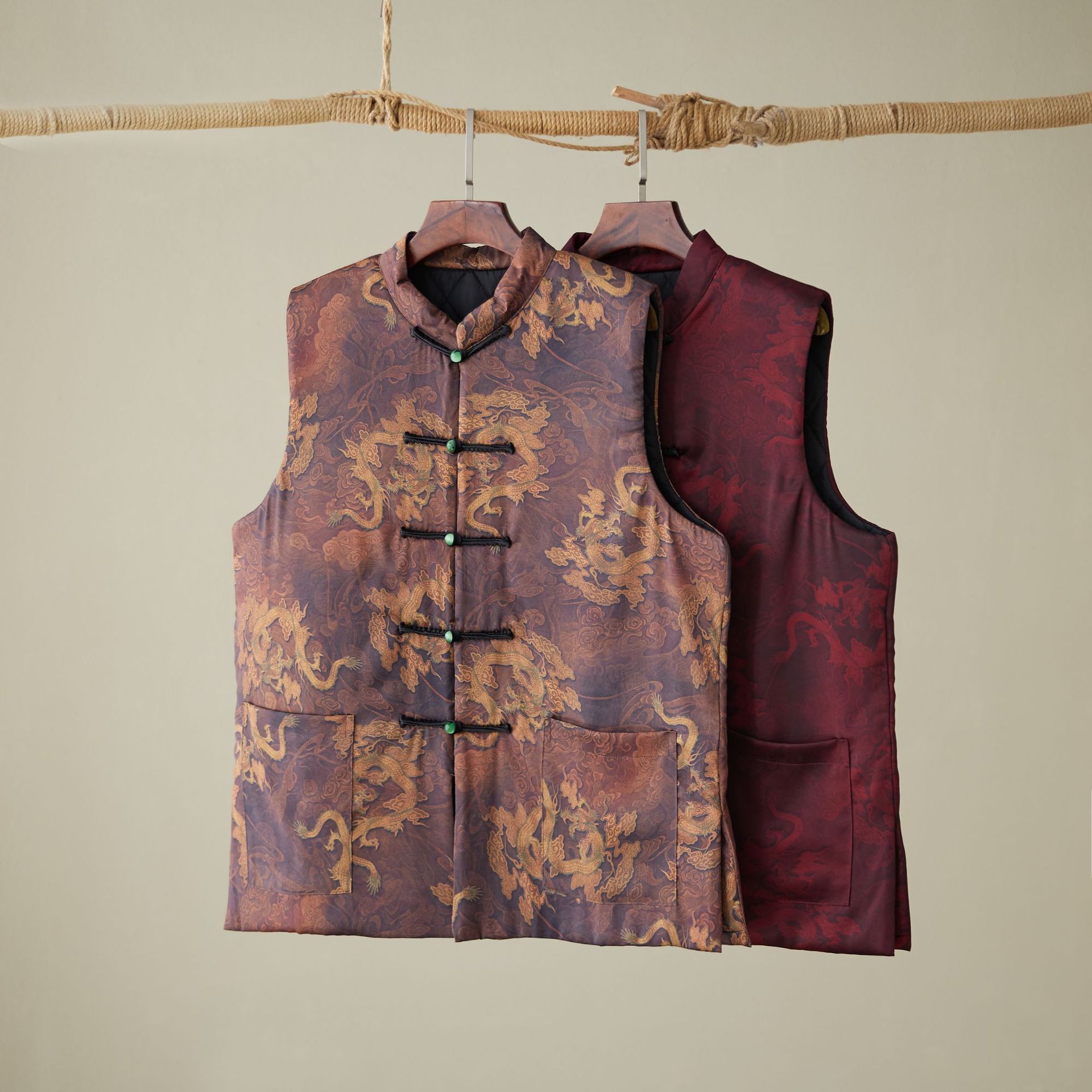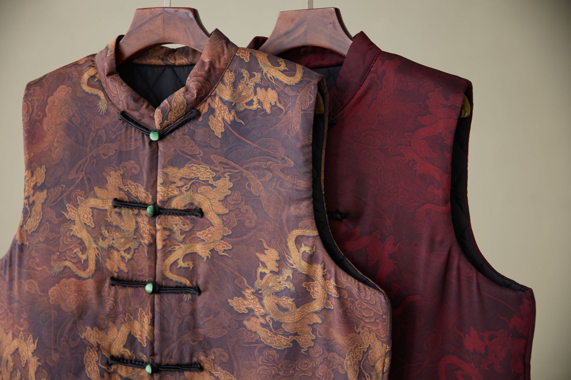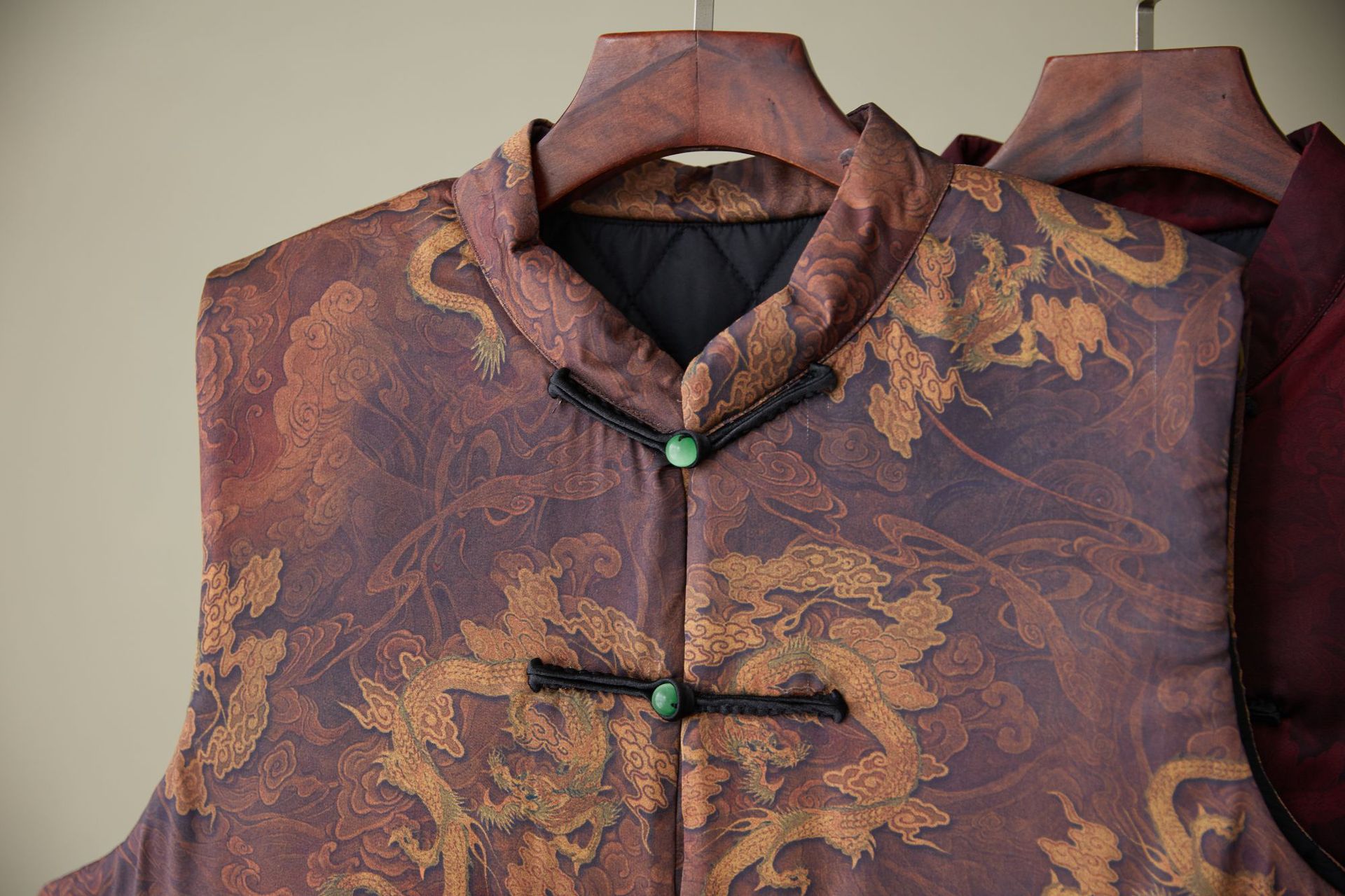 材质:丝缎印花 垂顺柔软 不易皱  手工盘扣加玉扣点缀夹棉款马甲,厚薄适中