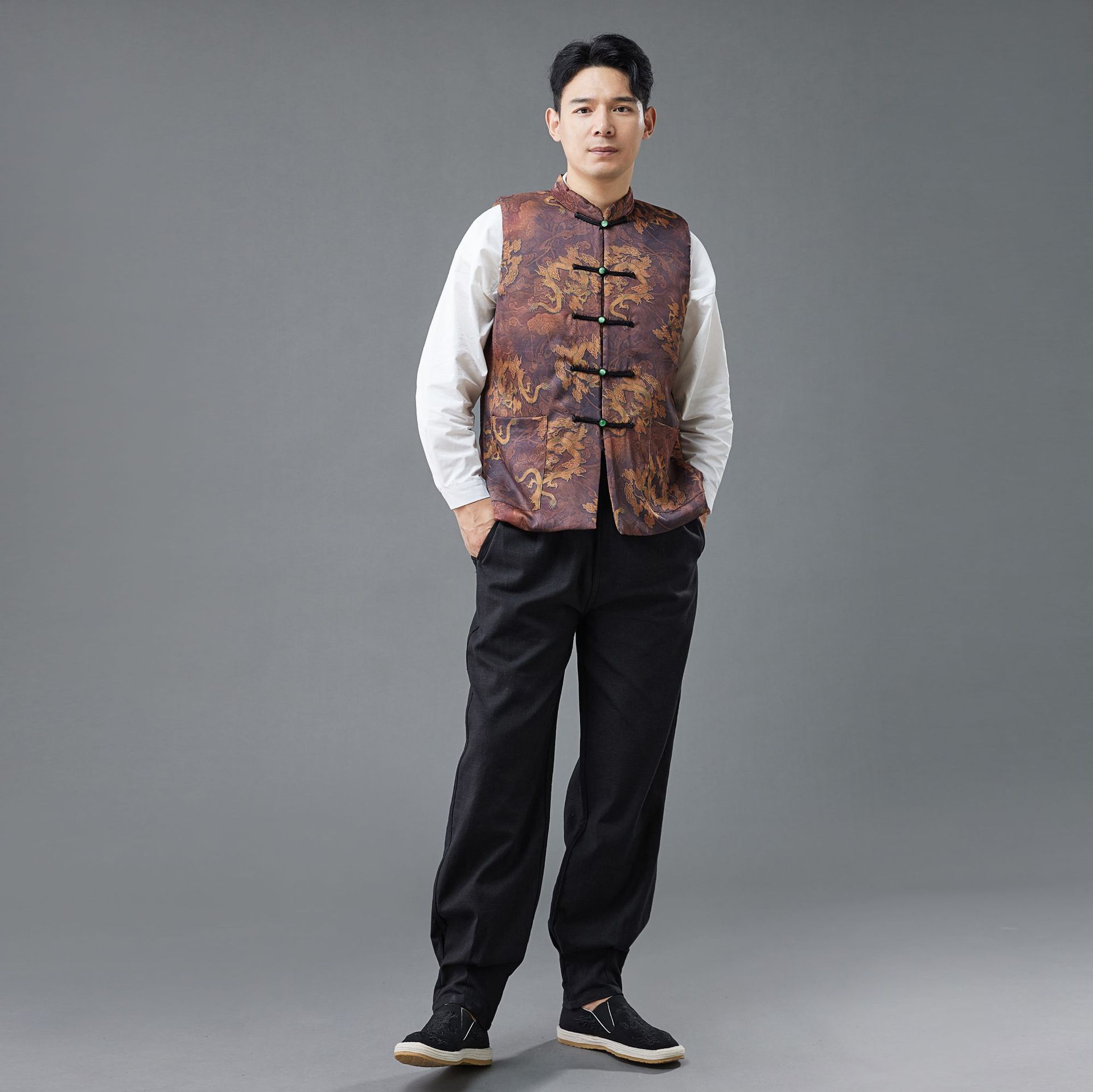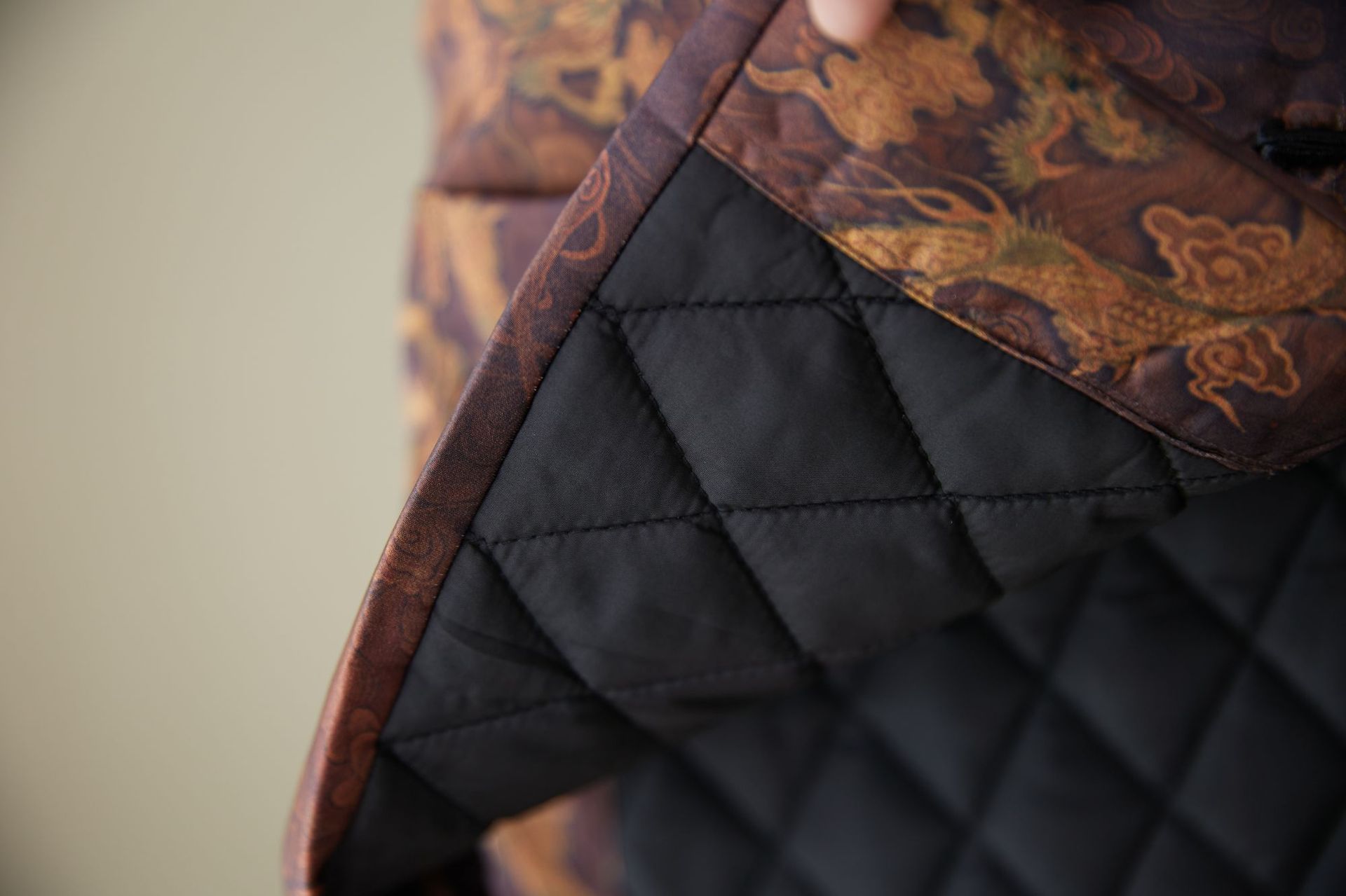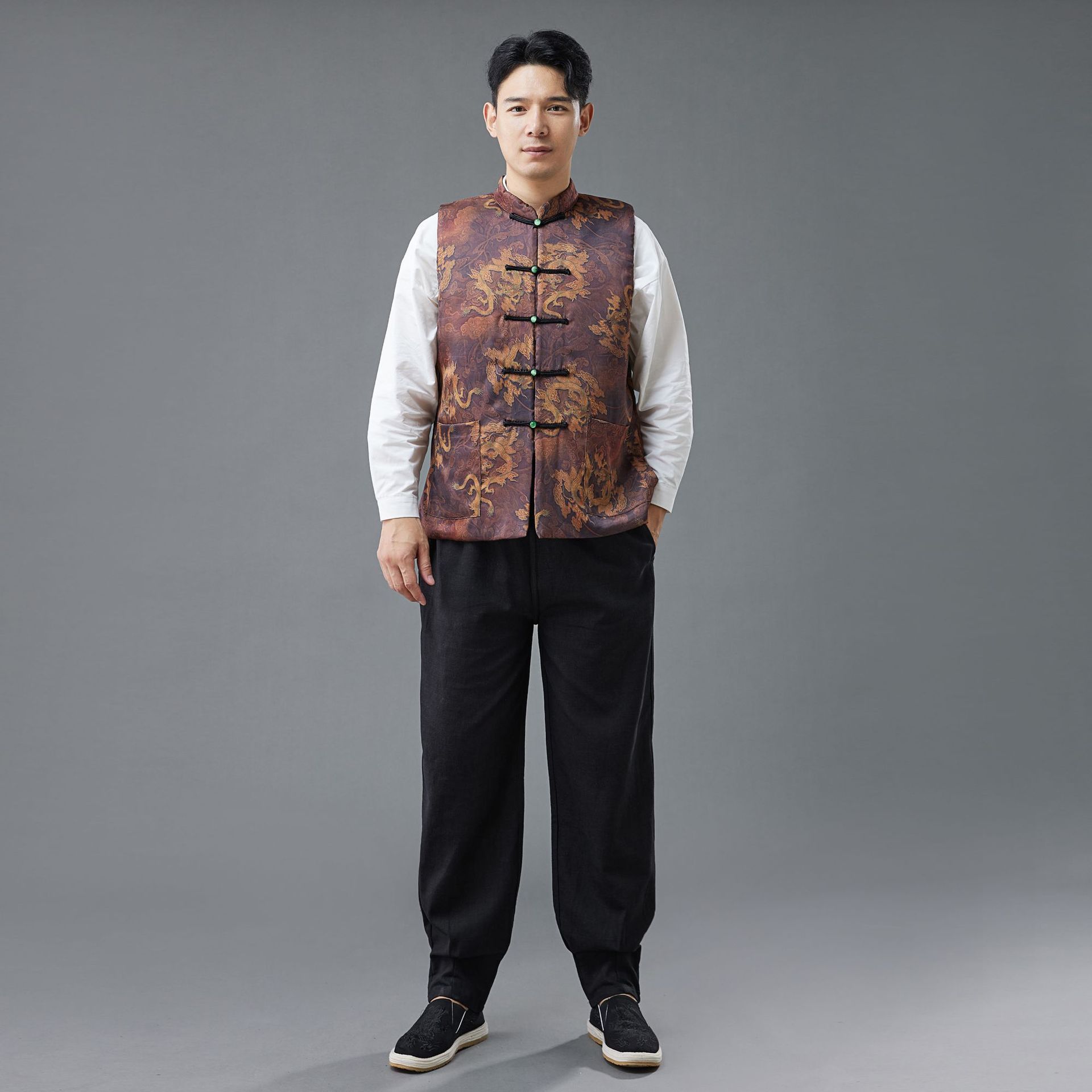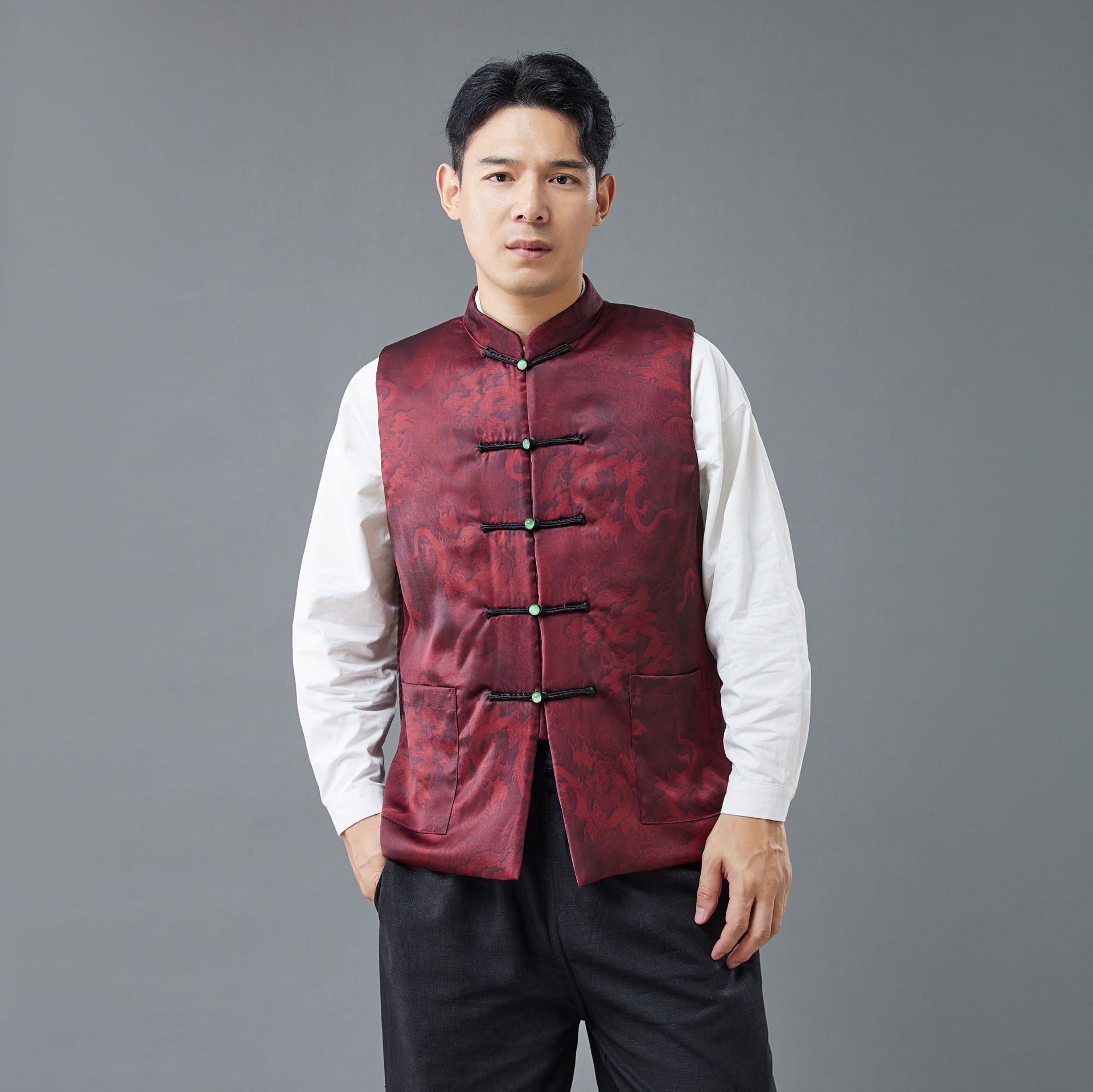 材质:丝缎印花 垂顺柔软 不易皱  手工盘扣加玉扣点缀夹棉款马甲,厚薄适中