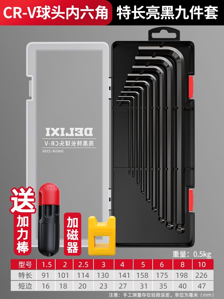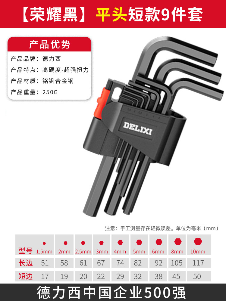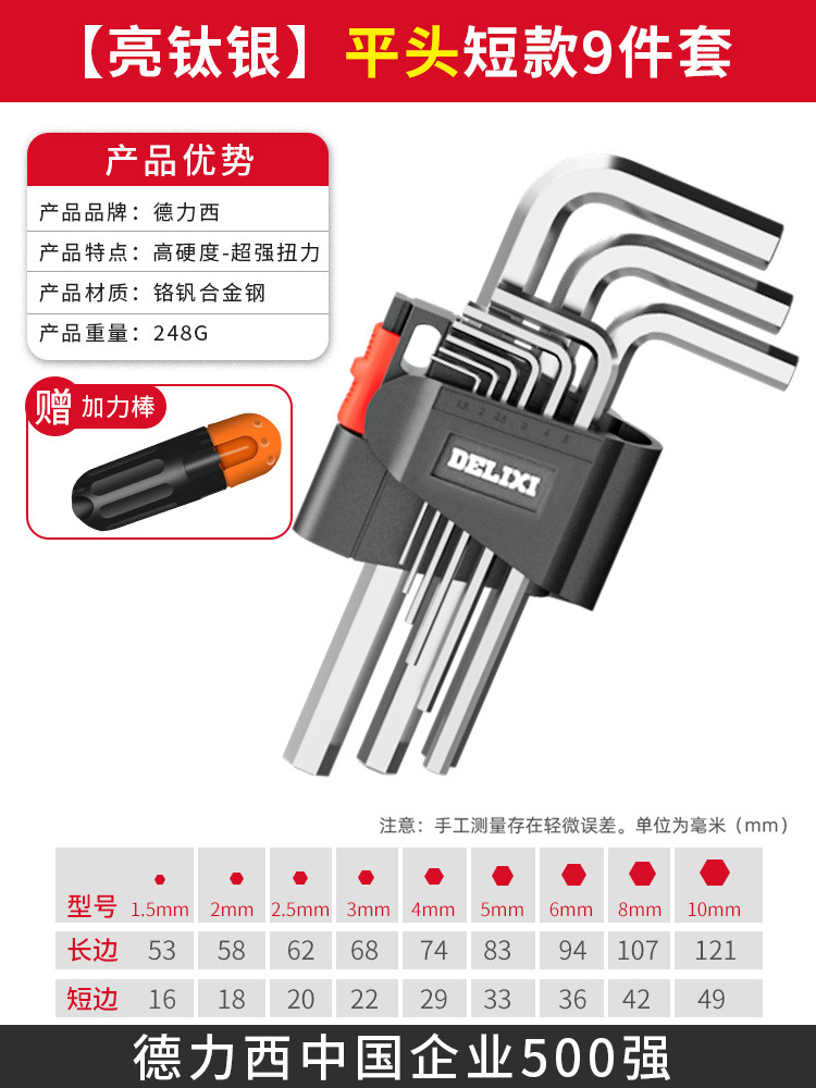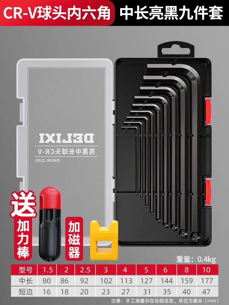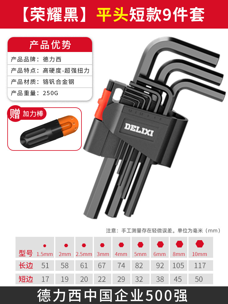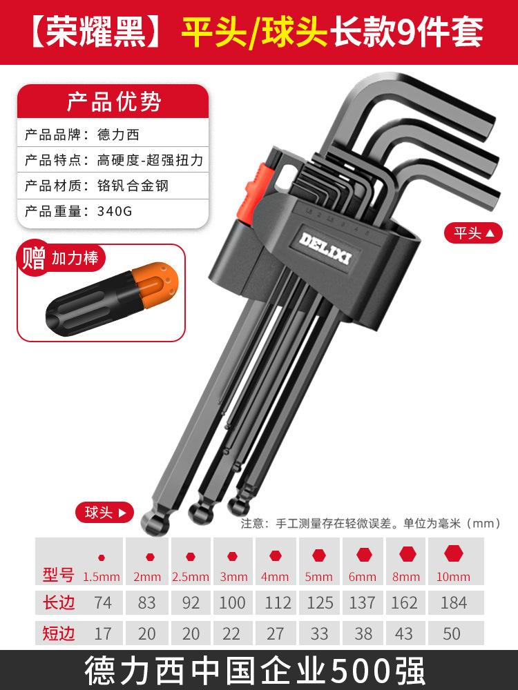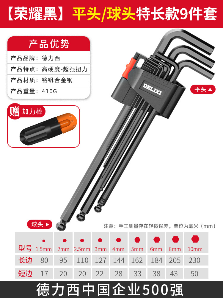 Delixi Allen 렌치 9 피스 세트 플랫 헤드 육각형 각도 Lengthen 구형 L-S2 합금 Allen 렌치
