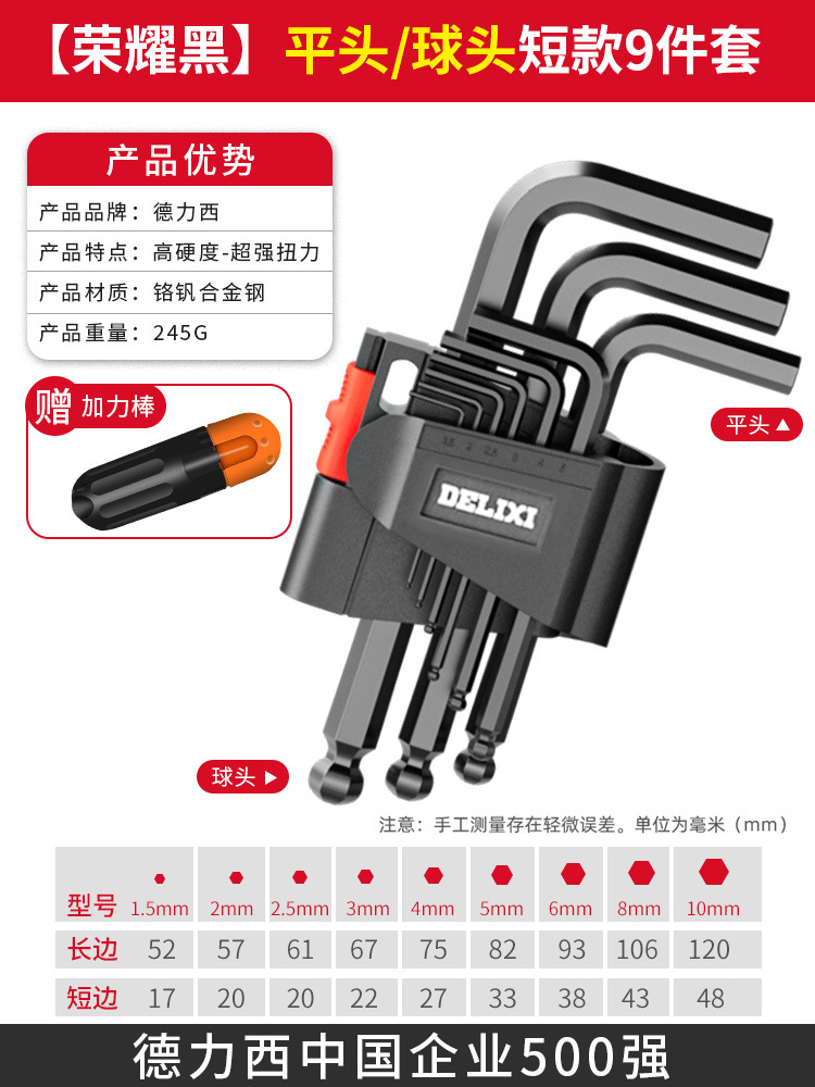Delixi Allen 렌치 9 피스 세트 플랫 헤드 육각형 각도 Lengthen 구형 L-S2 합금 Allen 렌치스토어 가기