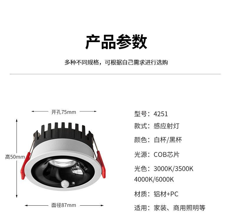 • 4251 유도 스포트라이트-블랙 컵-10W-개구 75mm-3000K 따뜻한 노란색 빛-전체 스펙트럼