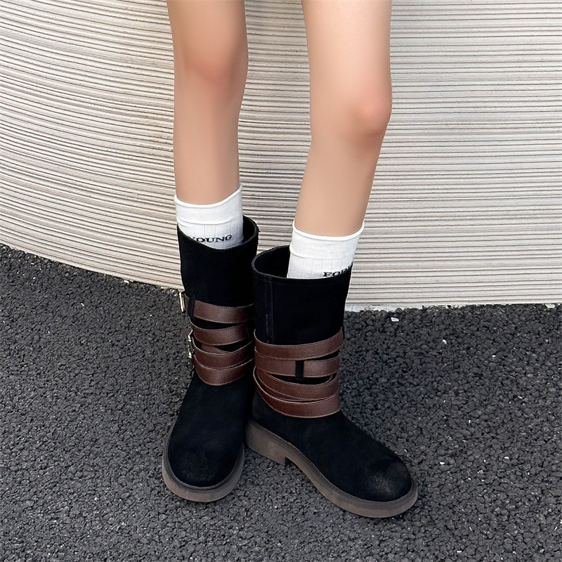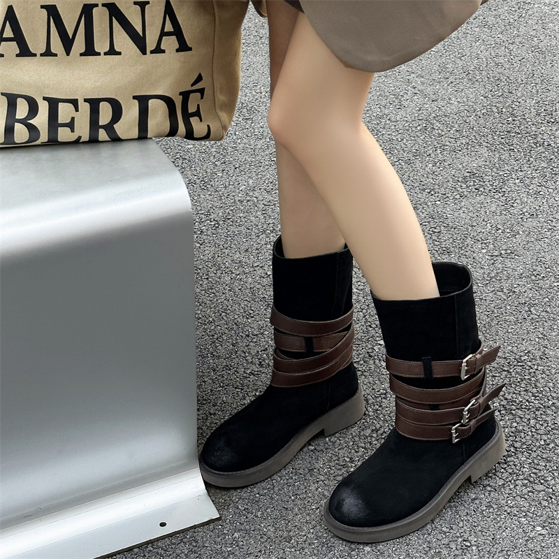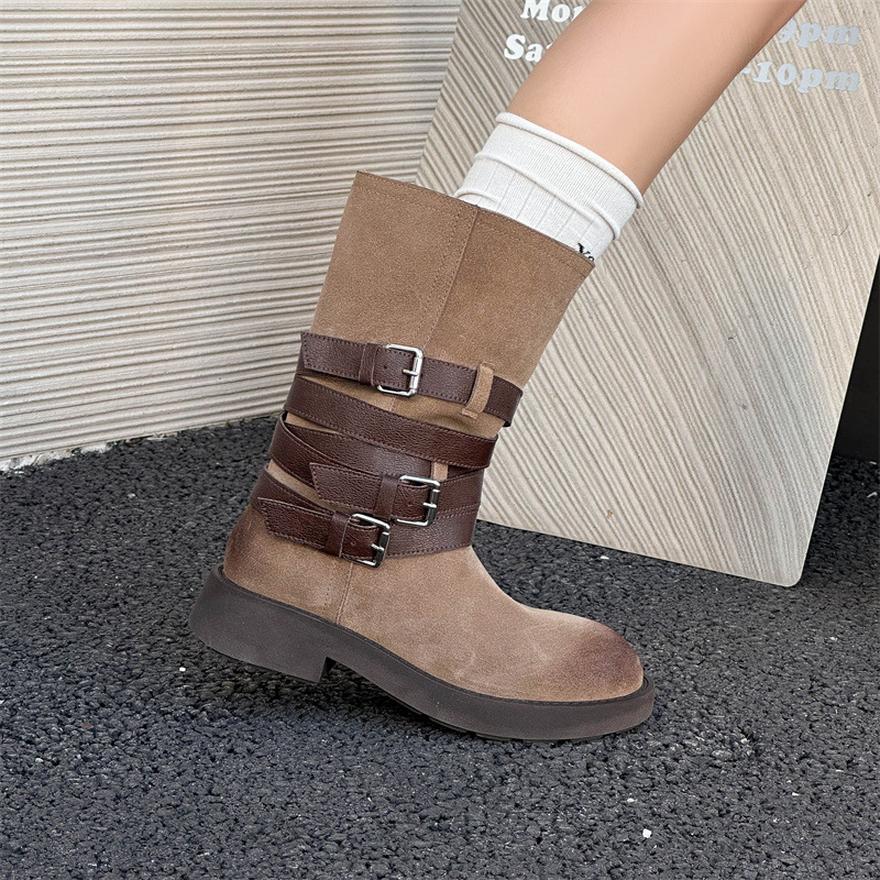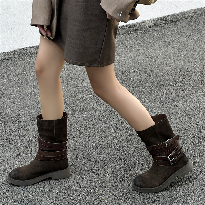 나비 O 빈티지 벨트 버클 장식 웨스턴 카우보이 부츠 여성용 스태킹 부츠 미드 배럴 나이트 두꺼운 부츠 사막 부츠 여성 트렌디스토어 가기