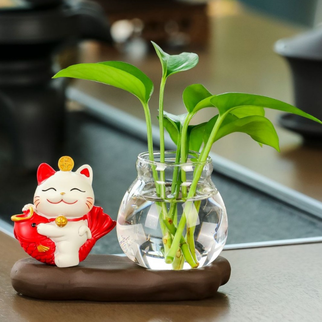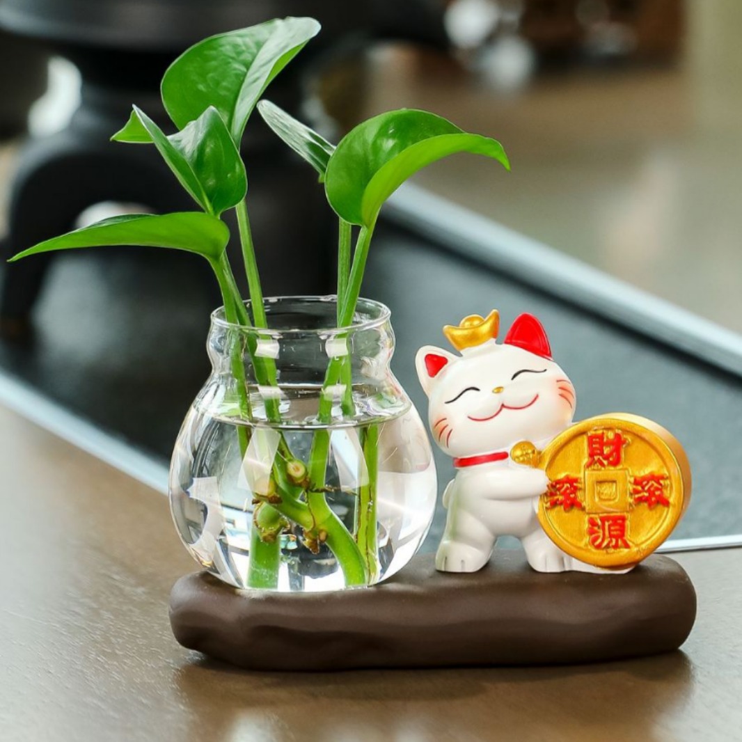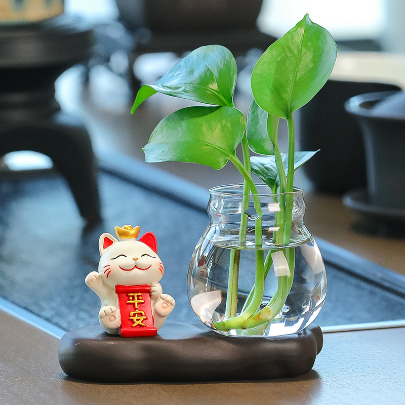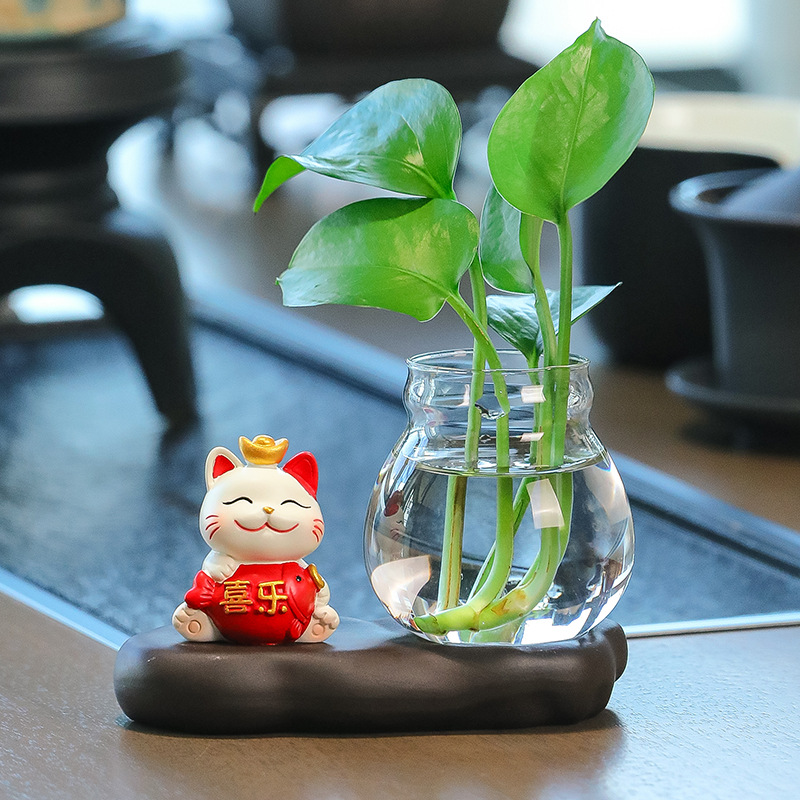 럭키 고양이 홈 액세서리 수경 꽃 배치 꽃병 거실 사무실 책상 장식 고양이 작은 물고기 탱크