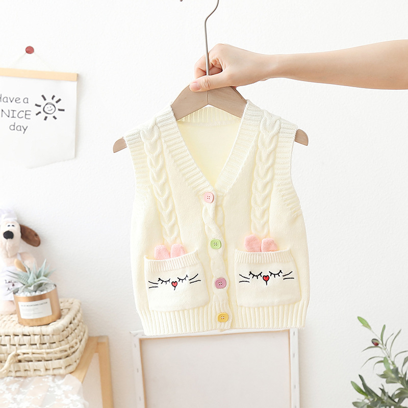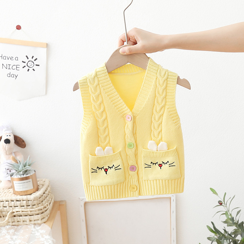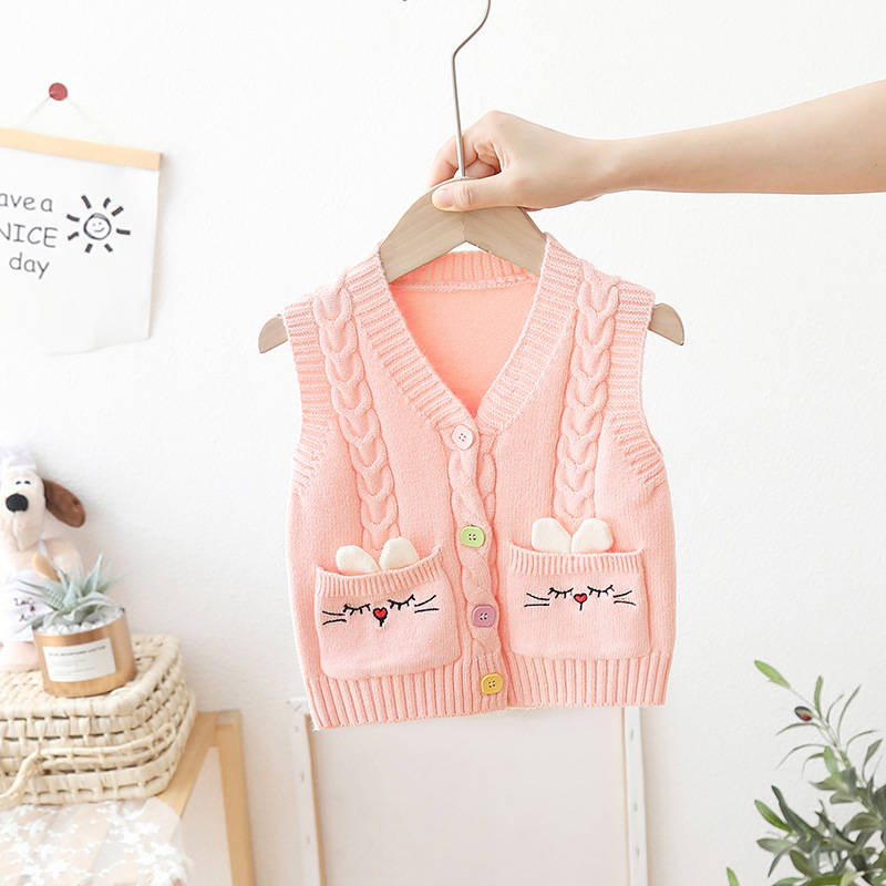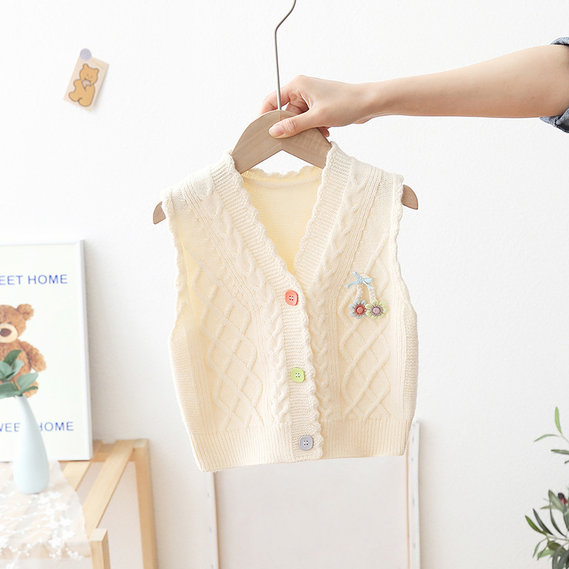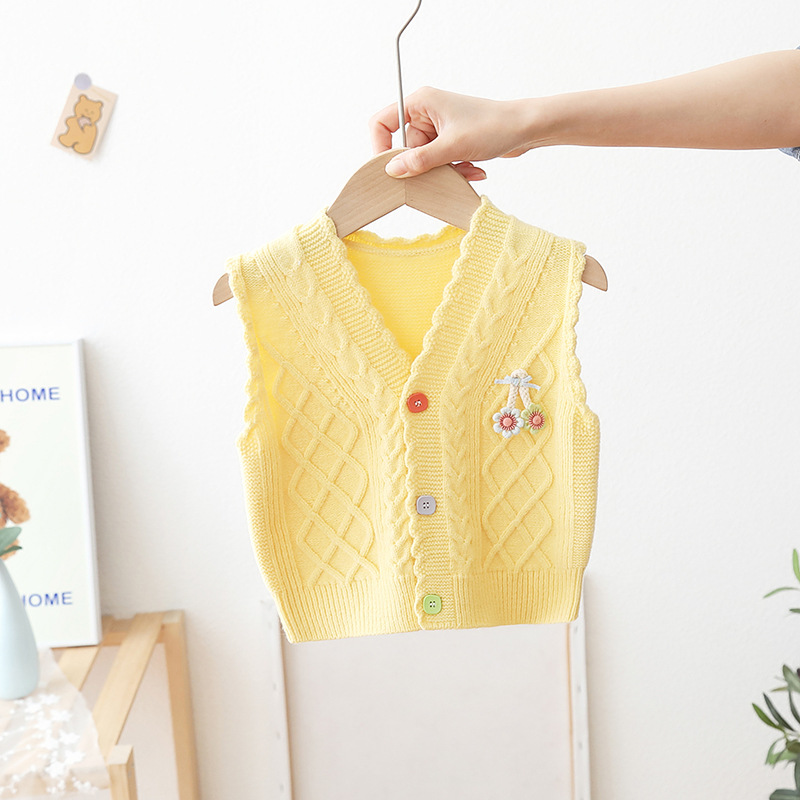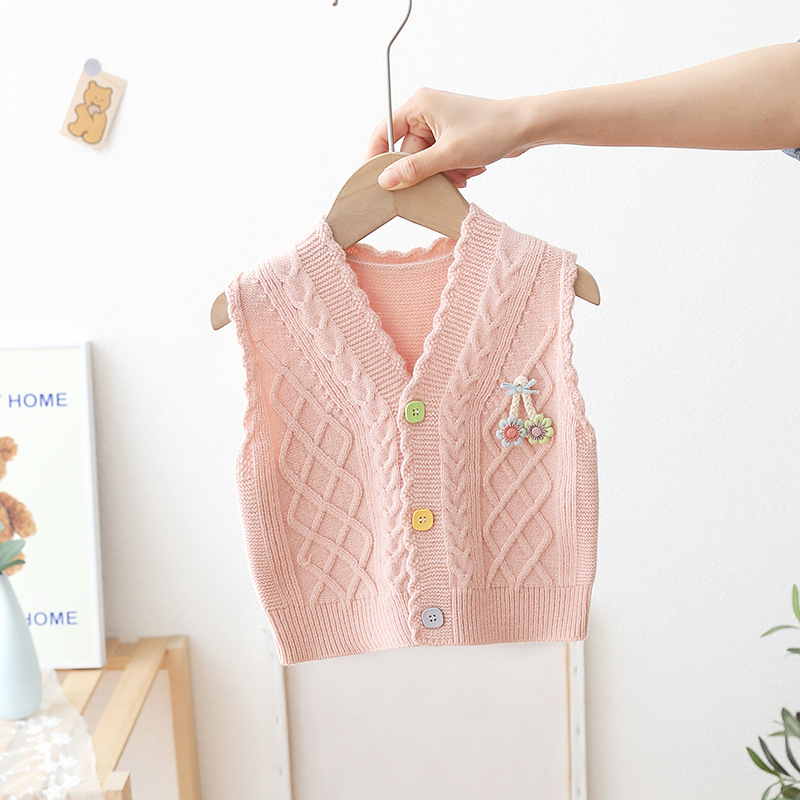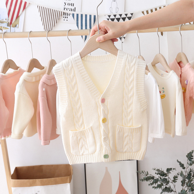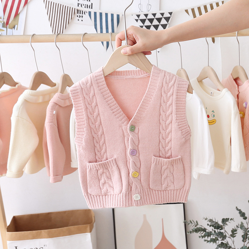 아기의 단색 V-Neck 버튼 카디건 스웨터 조끼 소녀의 봄과 가을 외부 착용 니트 조끼 어린이 왁스 코트
