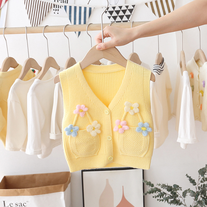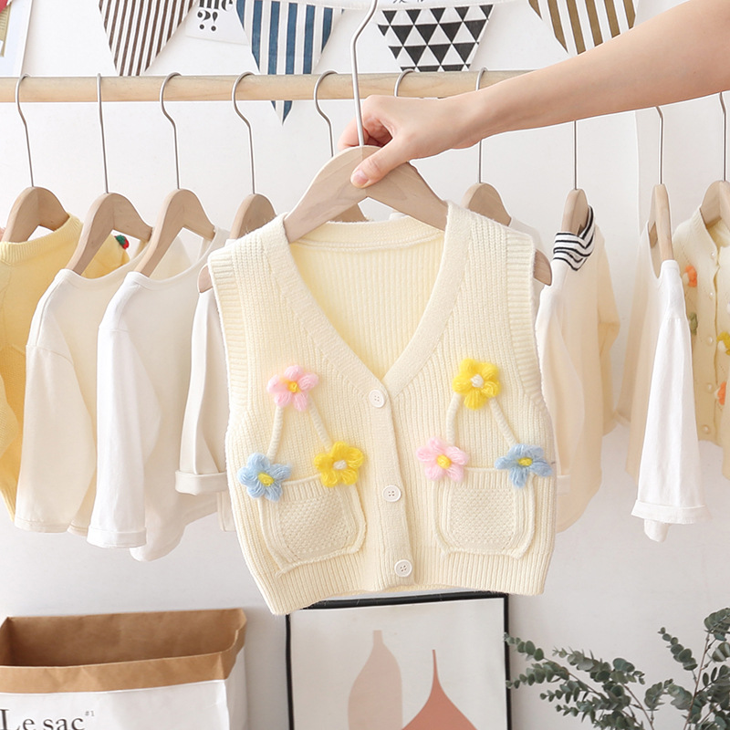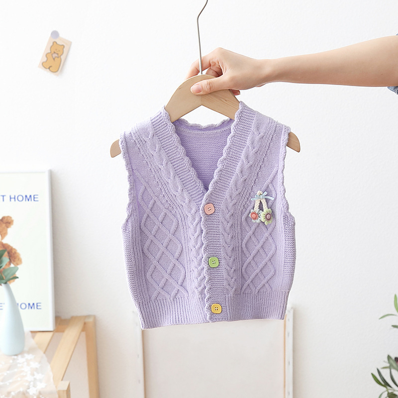아기의 단색 V-Neck 버튼 카디건 스웨터 조끼 소녀의 봄과 가을 외부 착용 니트 조끼 어린이 왁스 코트스토어 가기