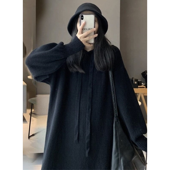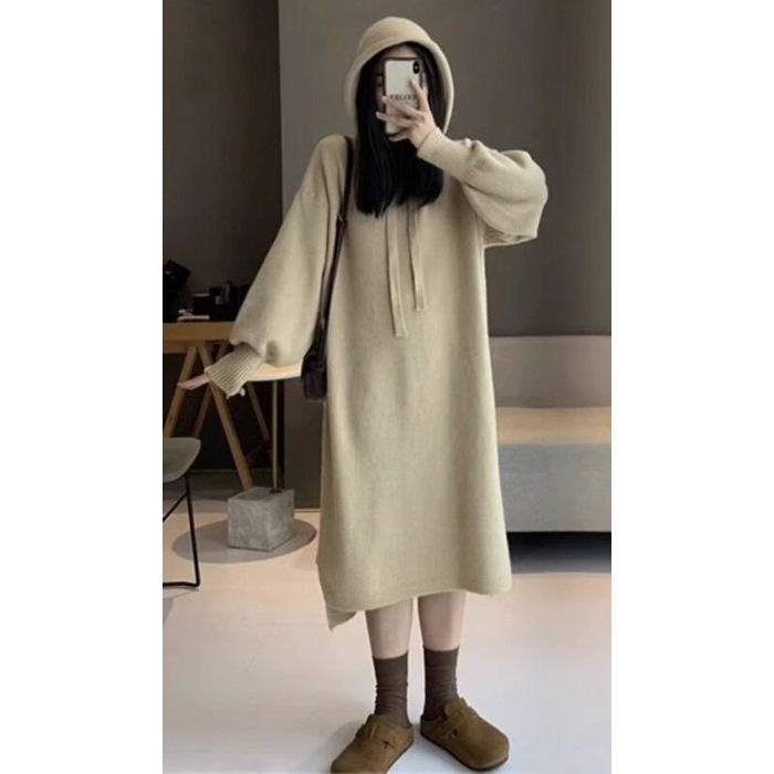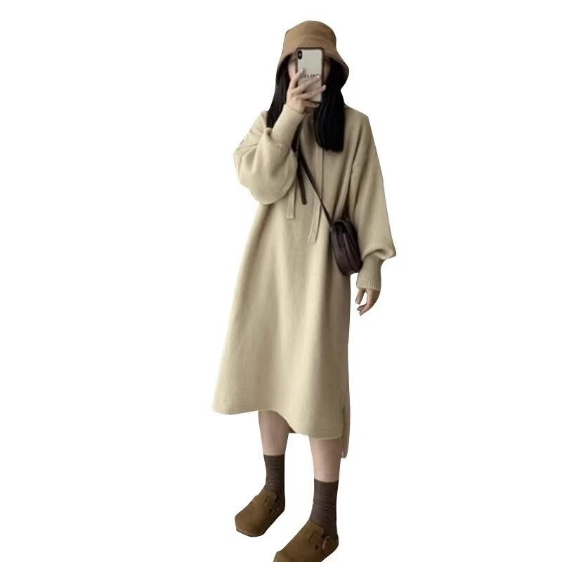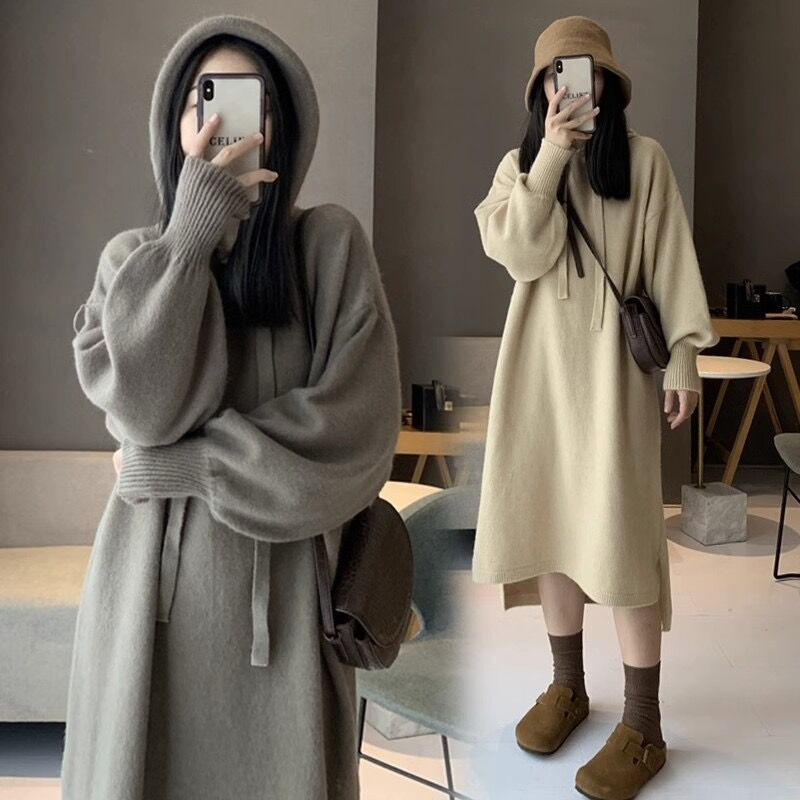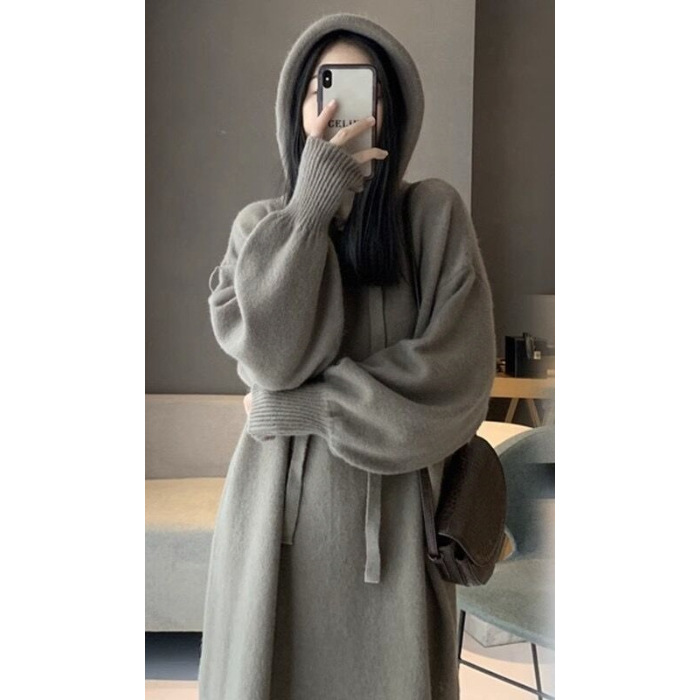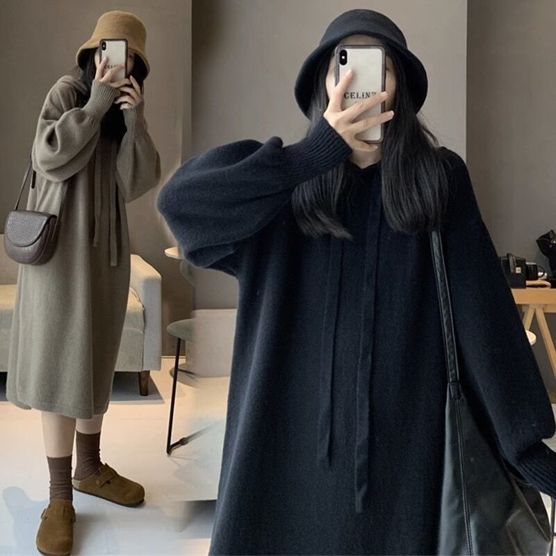 부드러운 게으른 스타일 후드 스웨터 원피스 여성의 가을과 겨울 슬리밍 캐주얼베이스 니트 원피스 트렌디 한 Ins Grey스토어 가기