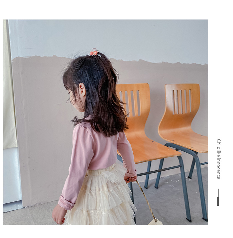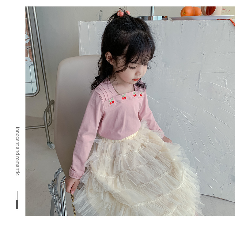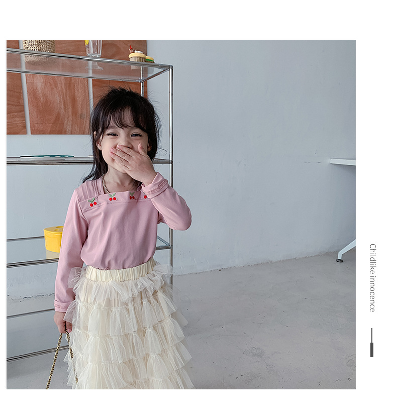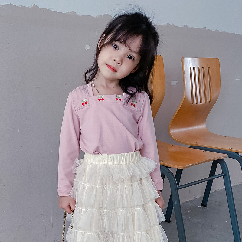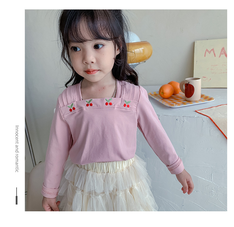 가을 2024 한국식 어린이 탑 소녀를위한 단색 꽃 자수 면화 긴 소매 스퀘어 칼라 티셔츠스토어 가기
