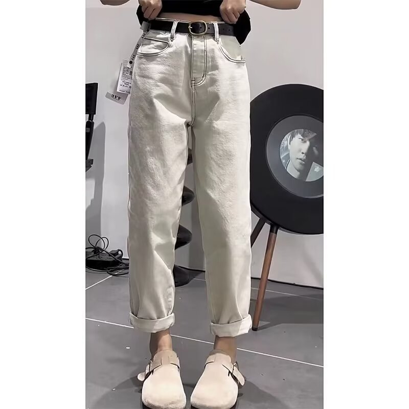 스트레치 화이트 스트레이트 청바지 여성의 가을 새로운 느슨한 슬리밍 높은 허리 넓은 다리 바지 자른 아빠 하렘 바지스토어 가기