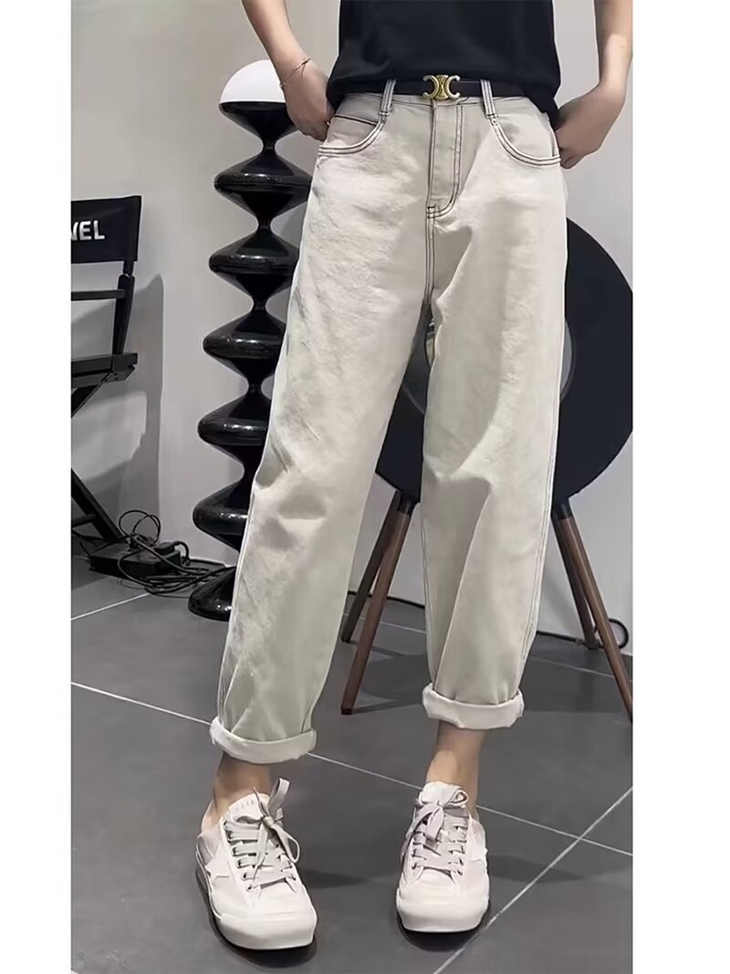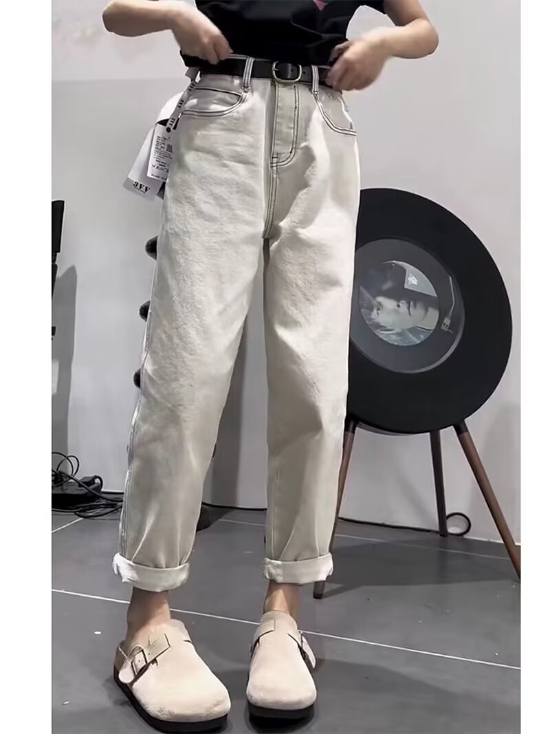 스트레치 화이트 스트레이트 청바지 여성의 가을 새로운 느슨한 슬리밍 높은 허리 넓은 다리 바지 자른 아빠 하렘 바지