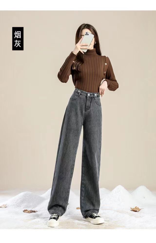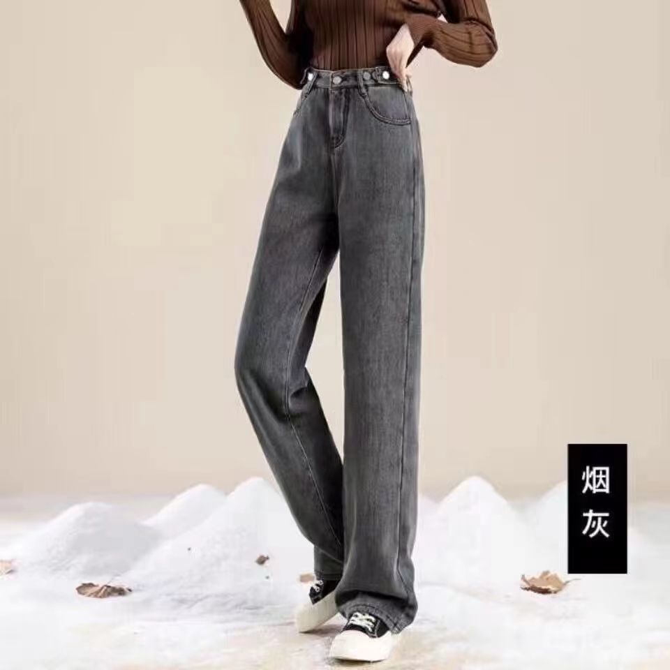 기모 두꺼운 단색 높은 허리 넓은 다리 청바지 여성의 2024 가을 및 겨울 새로운 올 매치 스트레이트 따뜻한 바지