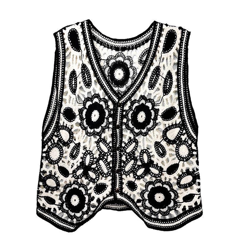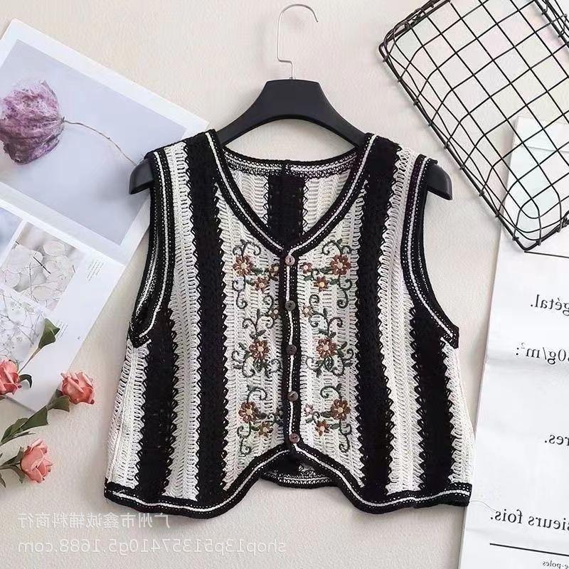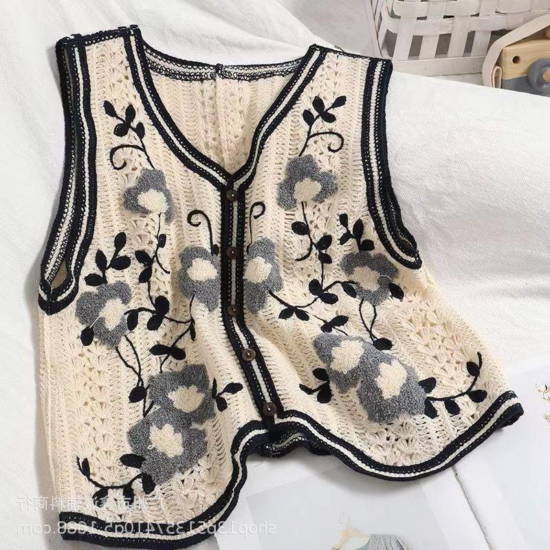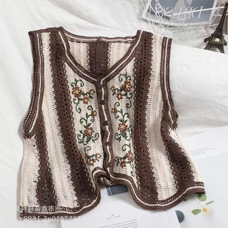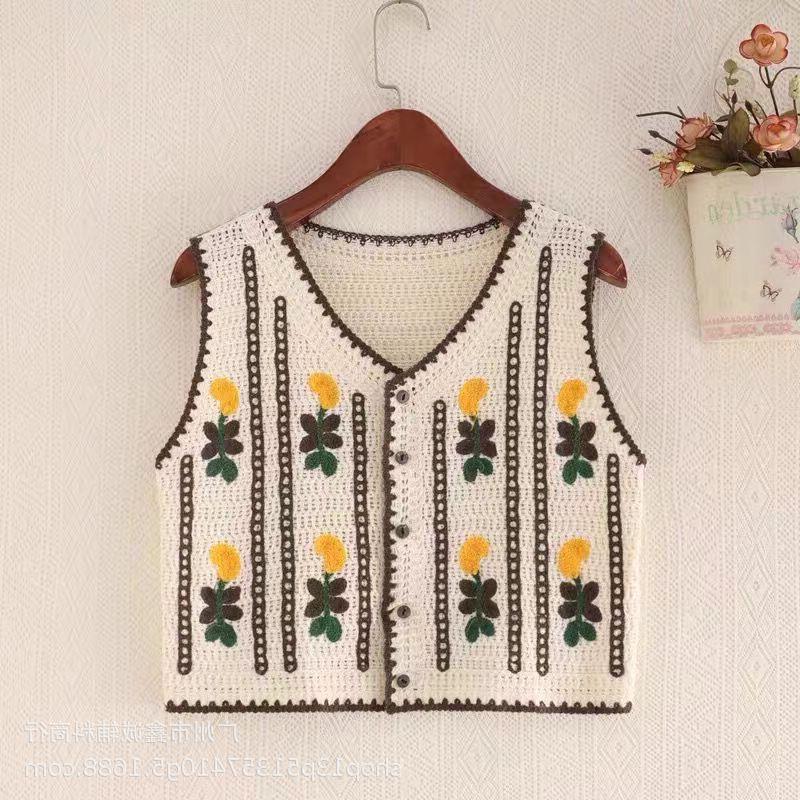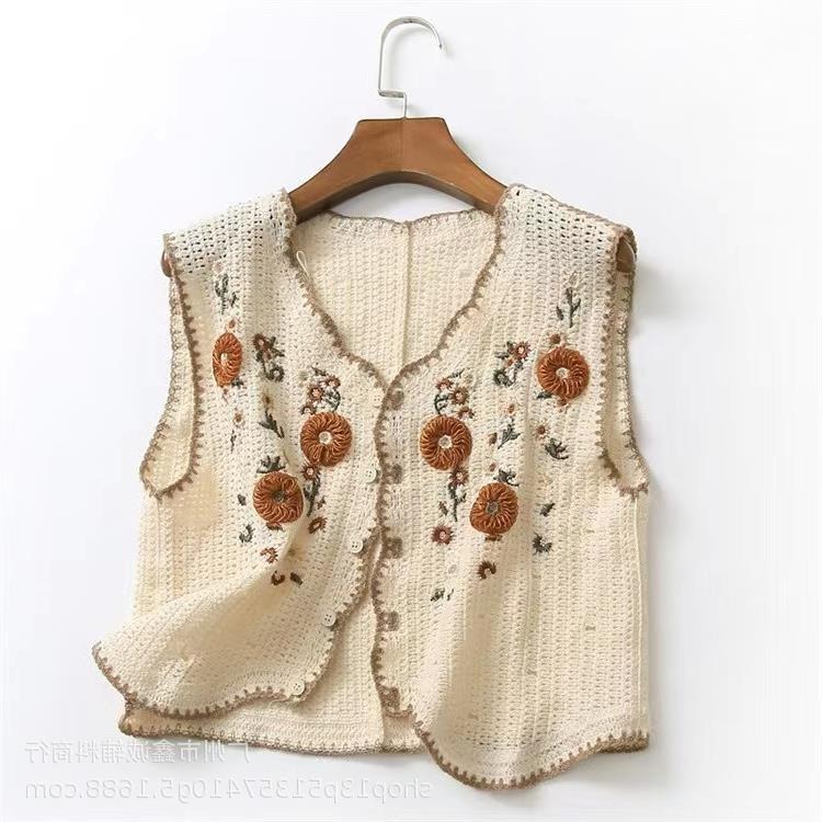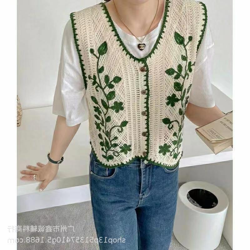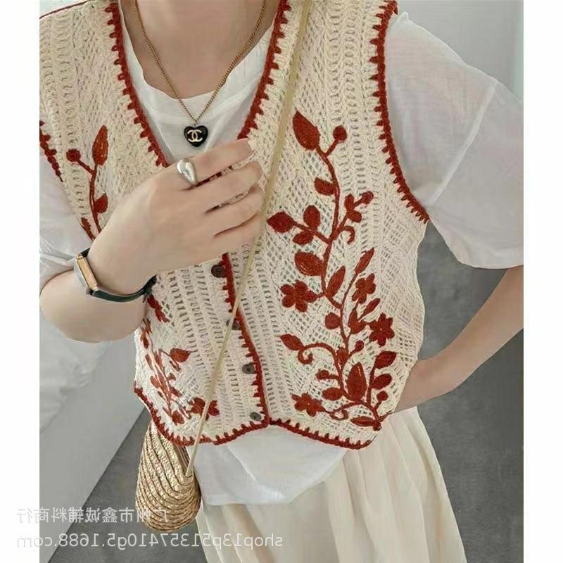 새로운 봄 여성 조끼 코트 니트 자수 중공 크로 셰 뜨개질 카디건 민족 스타일 조끼 외부 짧은 유행
