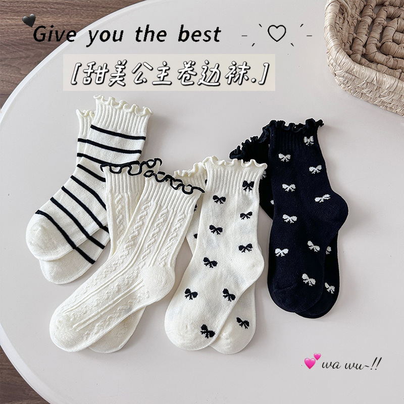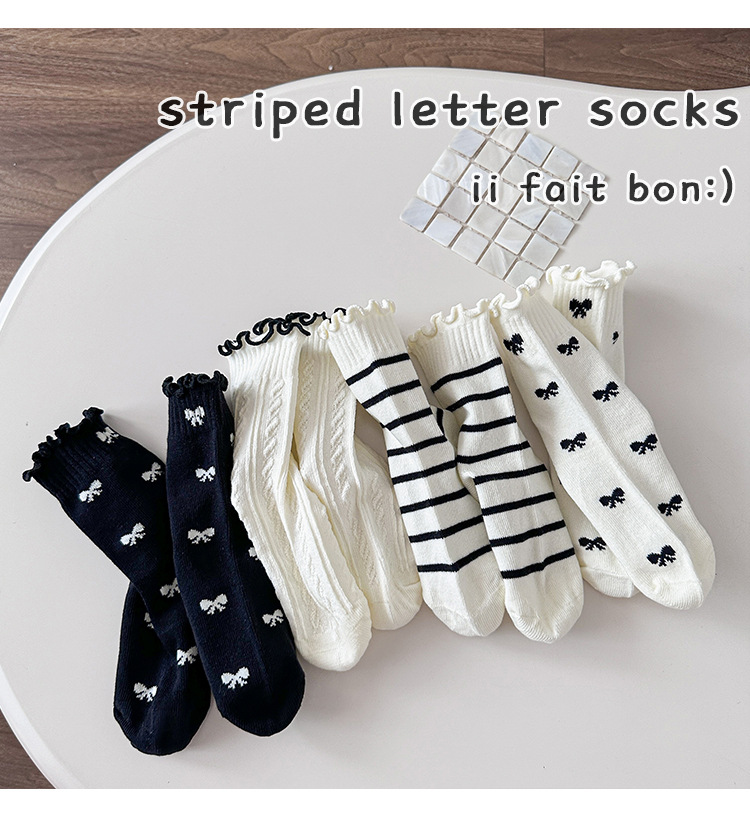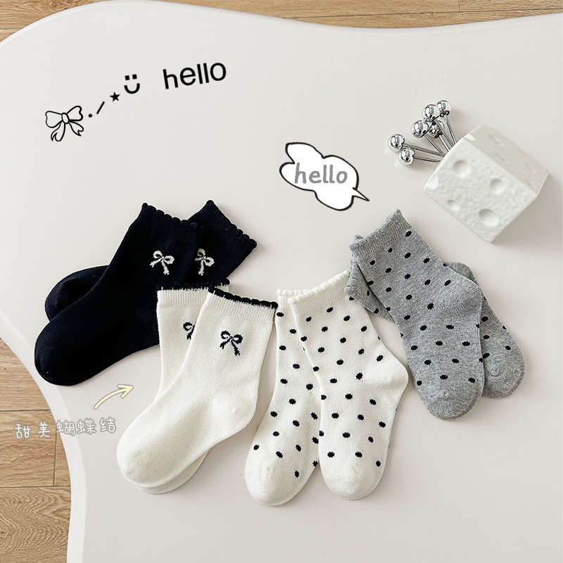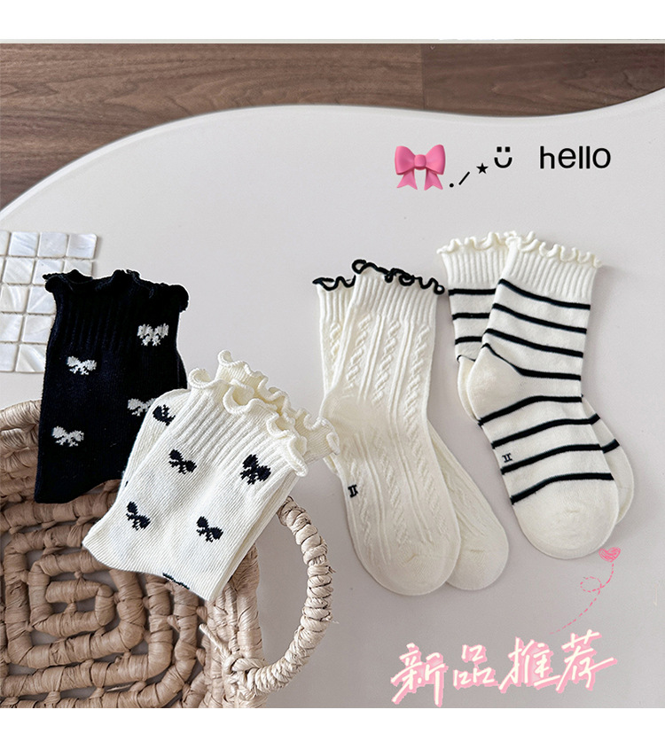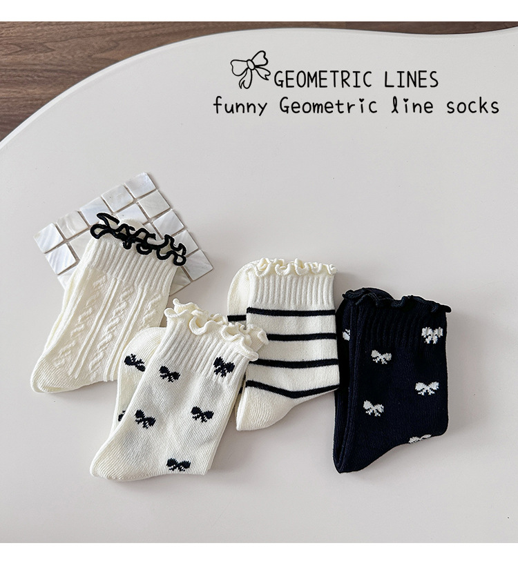 4 쌍의 어린이 양말 도매 가을 및 겨울 어린이 면화 양말 한국 뼈없는 흑백 줄무늬 나비 헴 소녀 양말스토어 가기