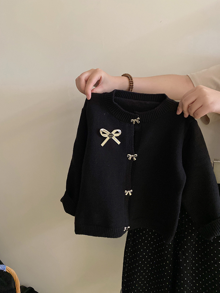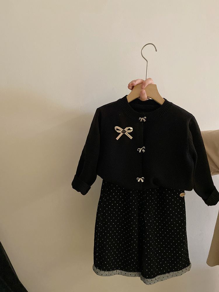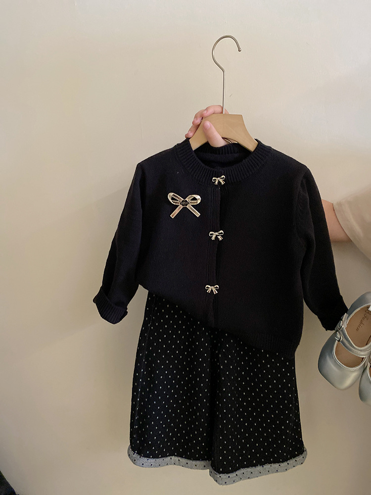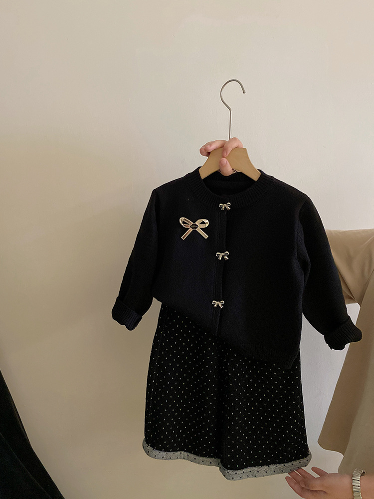 여아용 컬리지 스타일 가을 패션 세트, 패셔너블한 리본 니트 스웨터와 물방울 무늬 바지, 여아용 투피스 세트