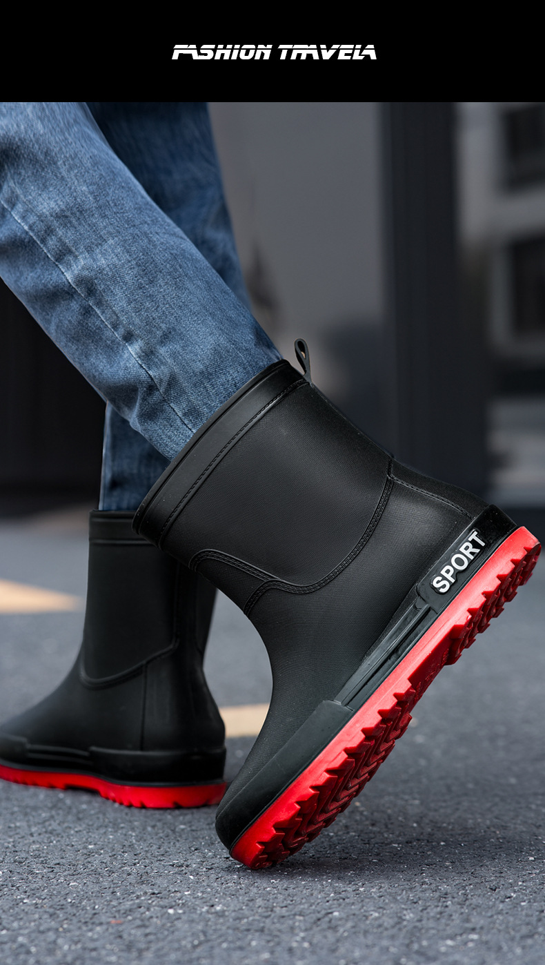 남성용 레인 부츠 소프트 단독 미끄럼 방지 방수 신발 유행 중간 튜브 장화 기모 고무 신발 주방 경량 쇼트 튜브 워터 부츠 남성용