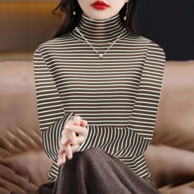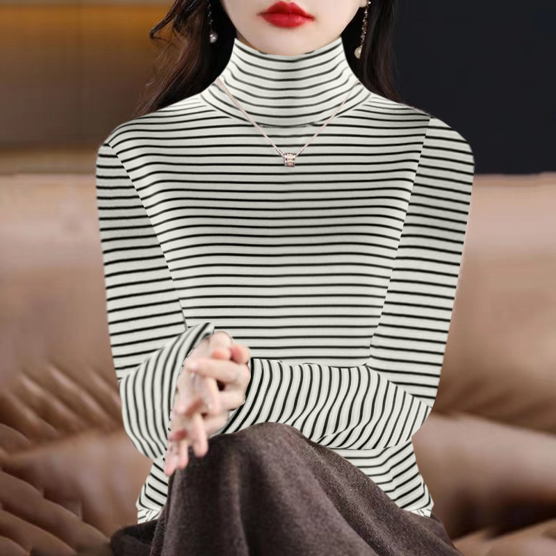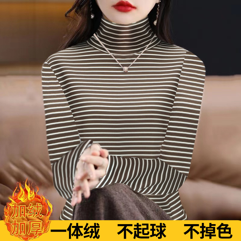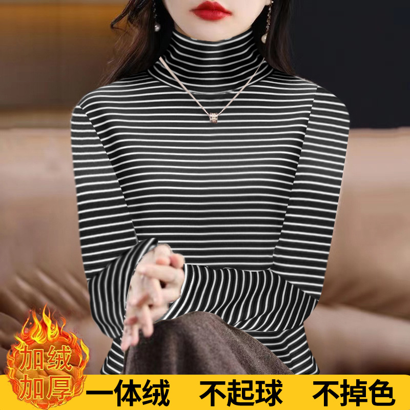 200kg 양면 독일 벨벳 파일 높은 칼라 바닥 셔츠 여성의 가을과 겨울 기모 두꺼운 줄무늬 티셔츠 재킷 조수스토어 가기