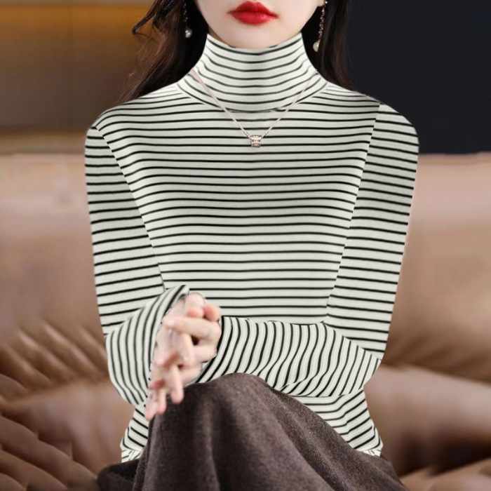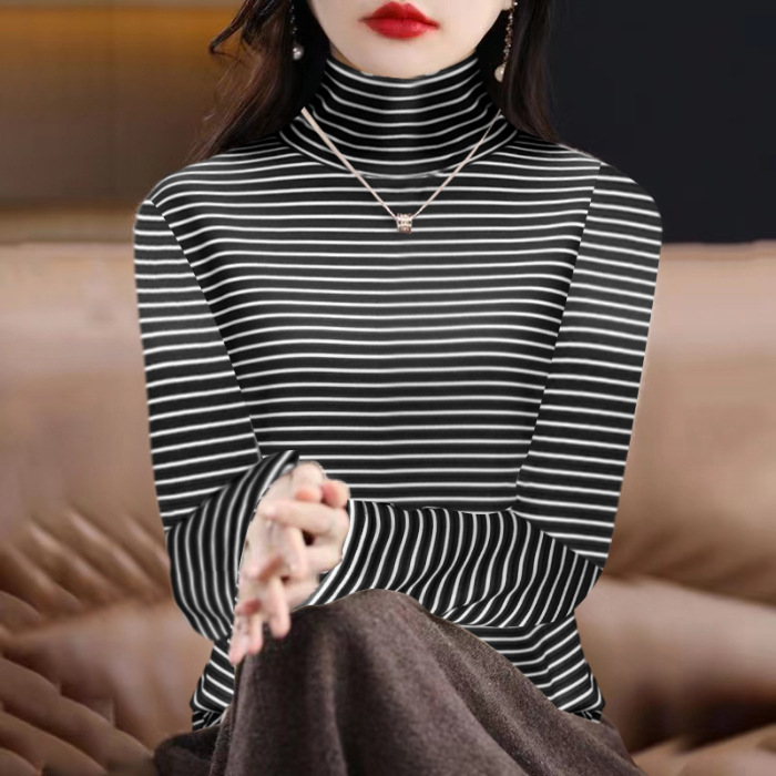 200kg 양면 독일 벨벳 파일 높은 칼라 바닥 셔츠 여성의 가을과 겨울 기모 두꺼운 줄무늬 티셔츠 재킷 조수