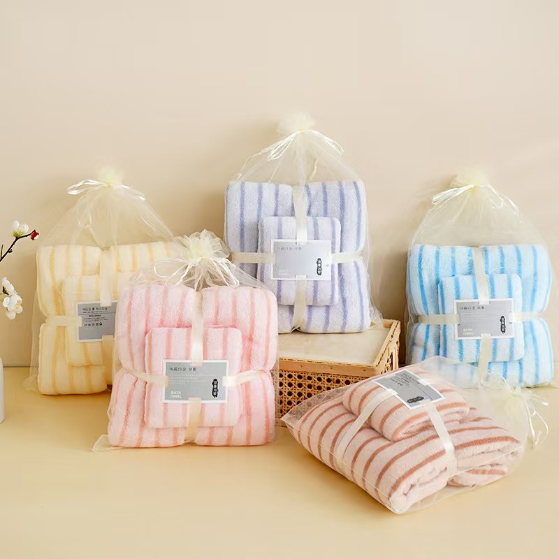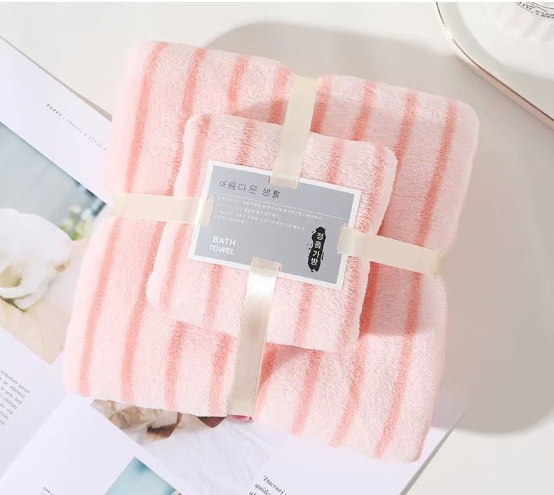 새로운 좁은 줄무늬 목욕 타월 세트 산호 양털 부드러운 얼굴 워시 타월 선물 포장 타월 피부 친화적 인 어머니와 어머니 세트 타월