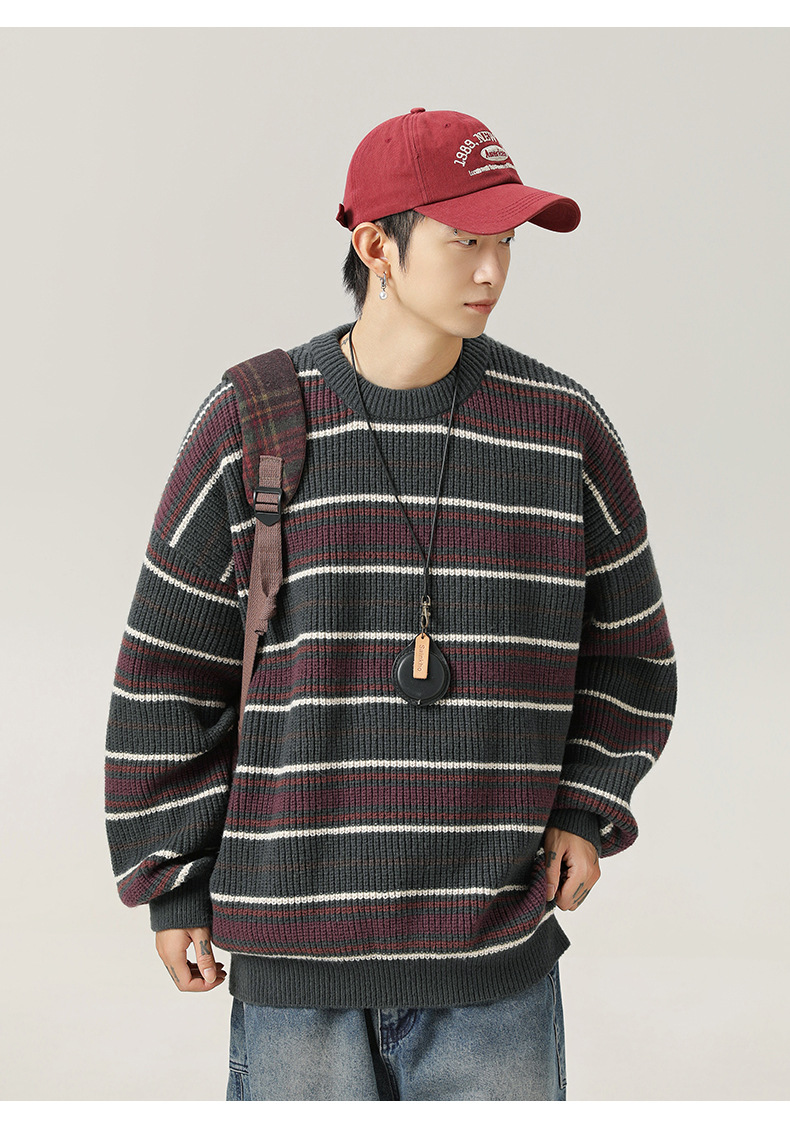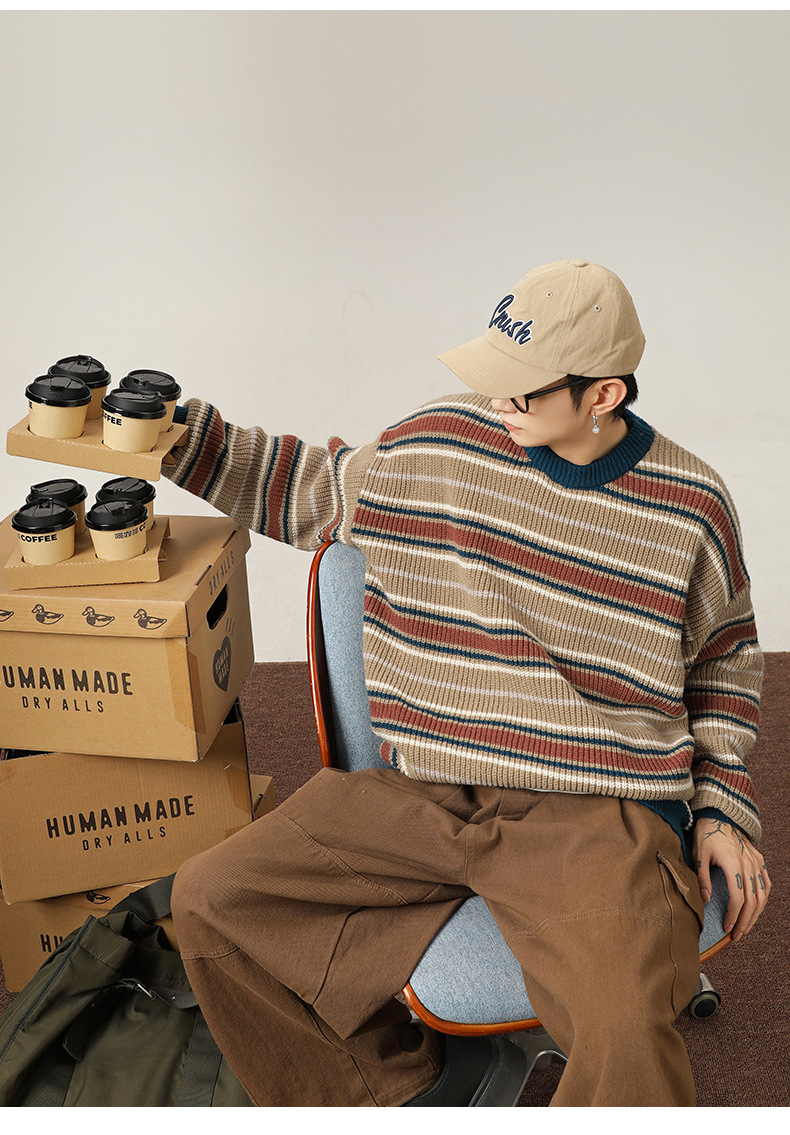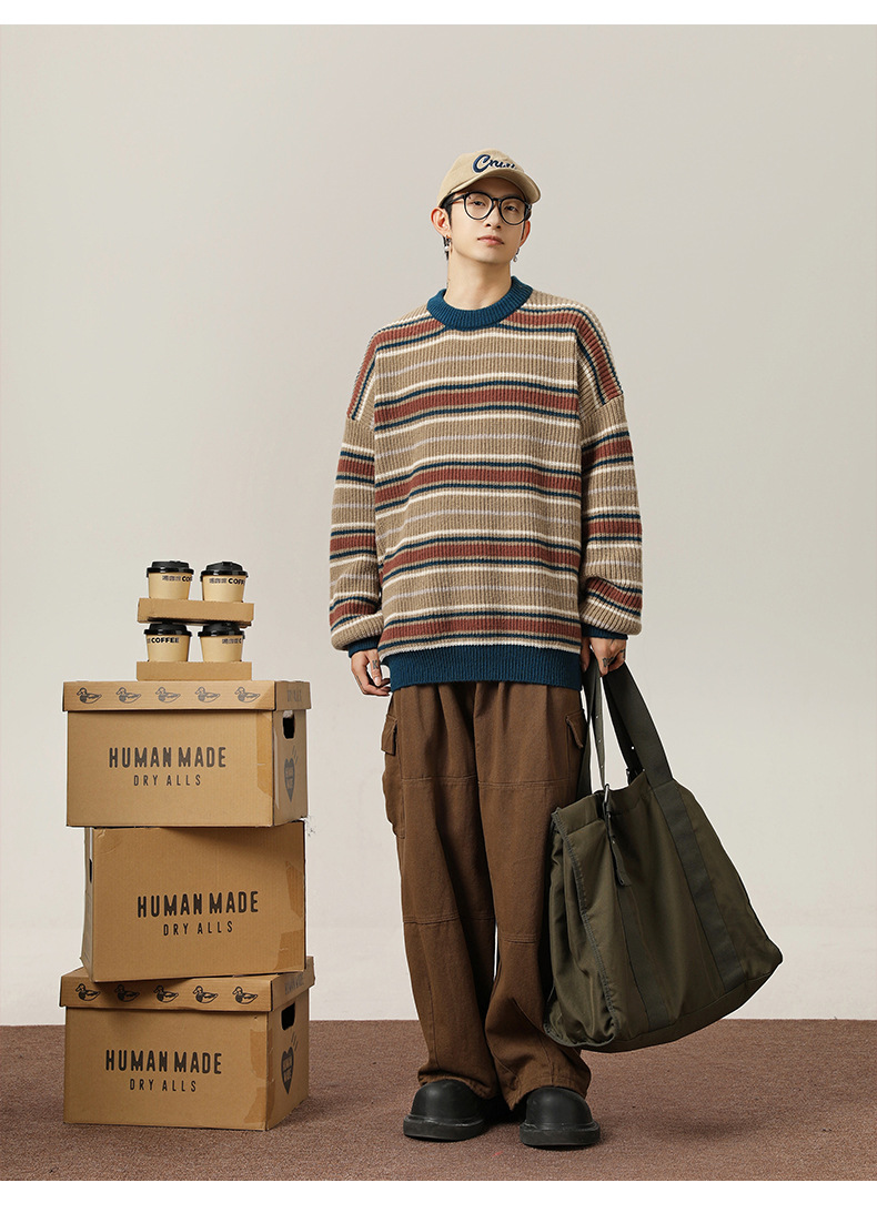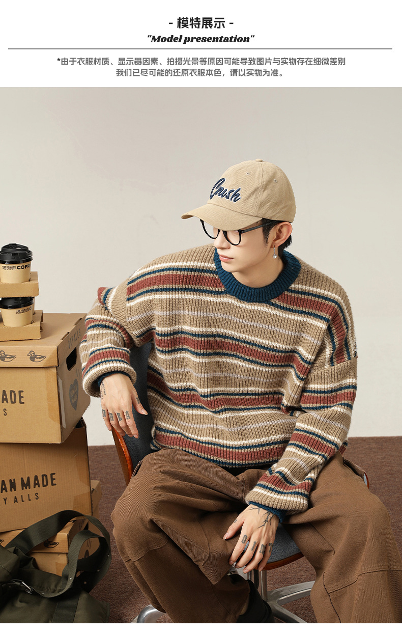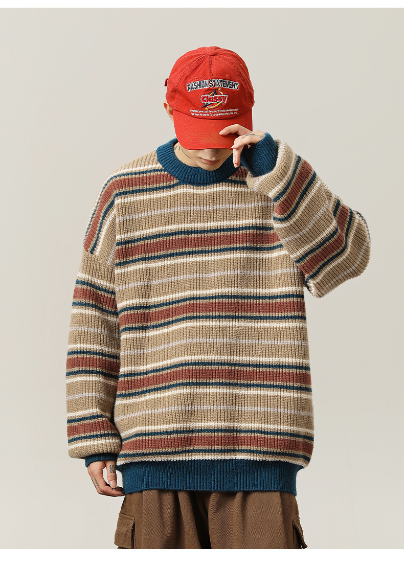 빈티지 콘트라스트 컬러 스트라이프 크루 넥 스웨터 남성 가을 및 겨울 두꺼운 바늘 느슨한 게으른 스타일 소프트 왁스 풀오버 스웨터 재킷스토어 가기