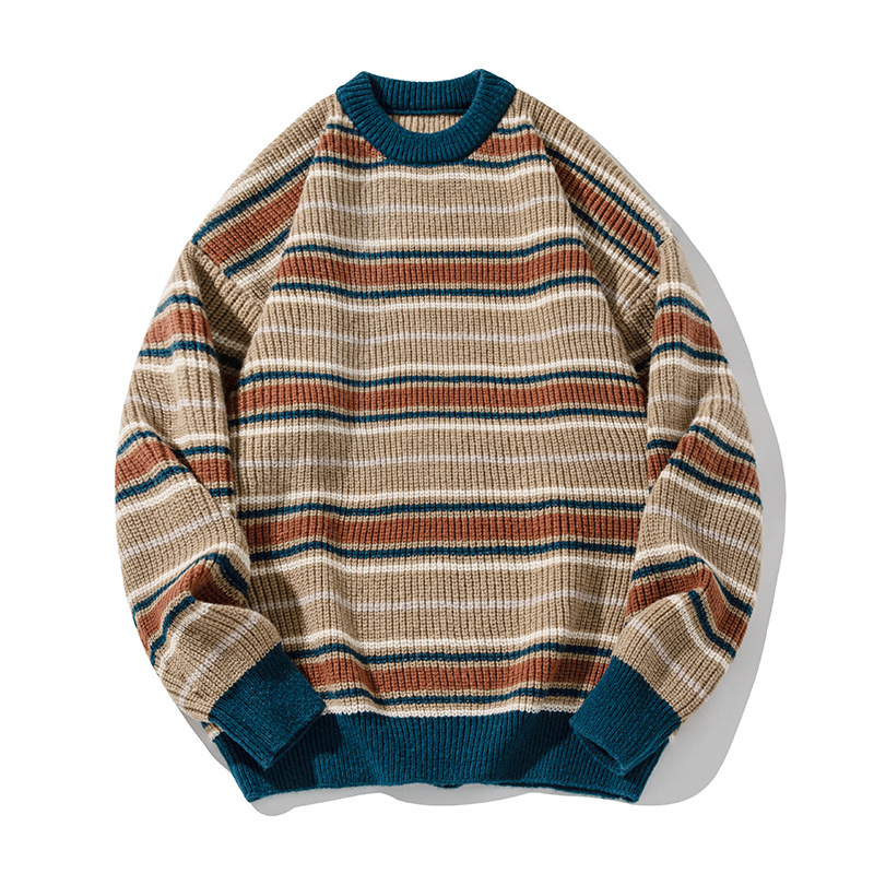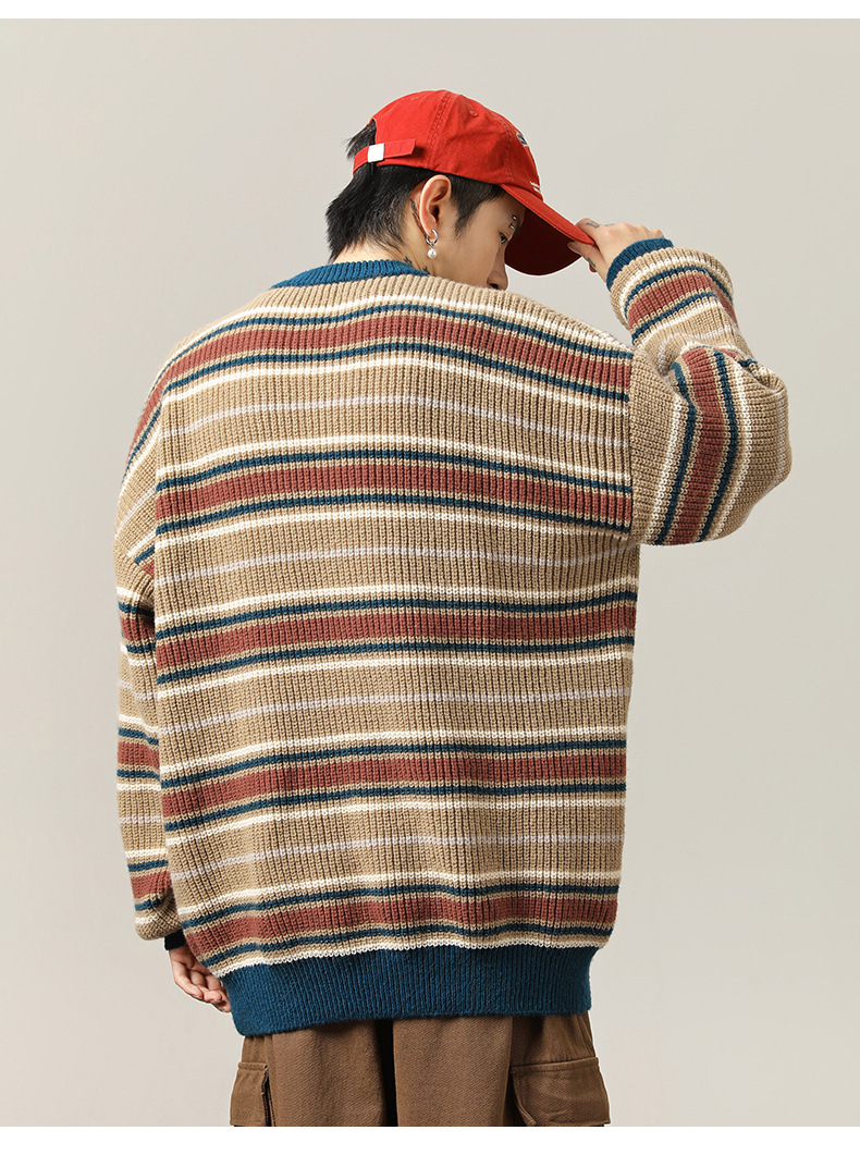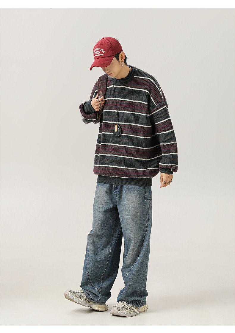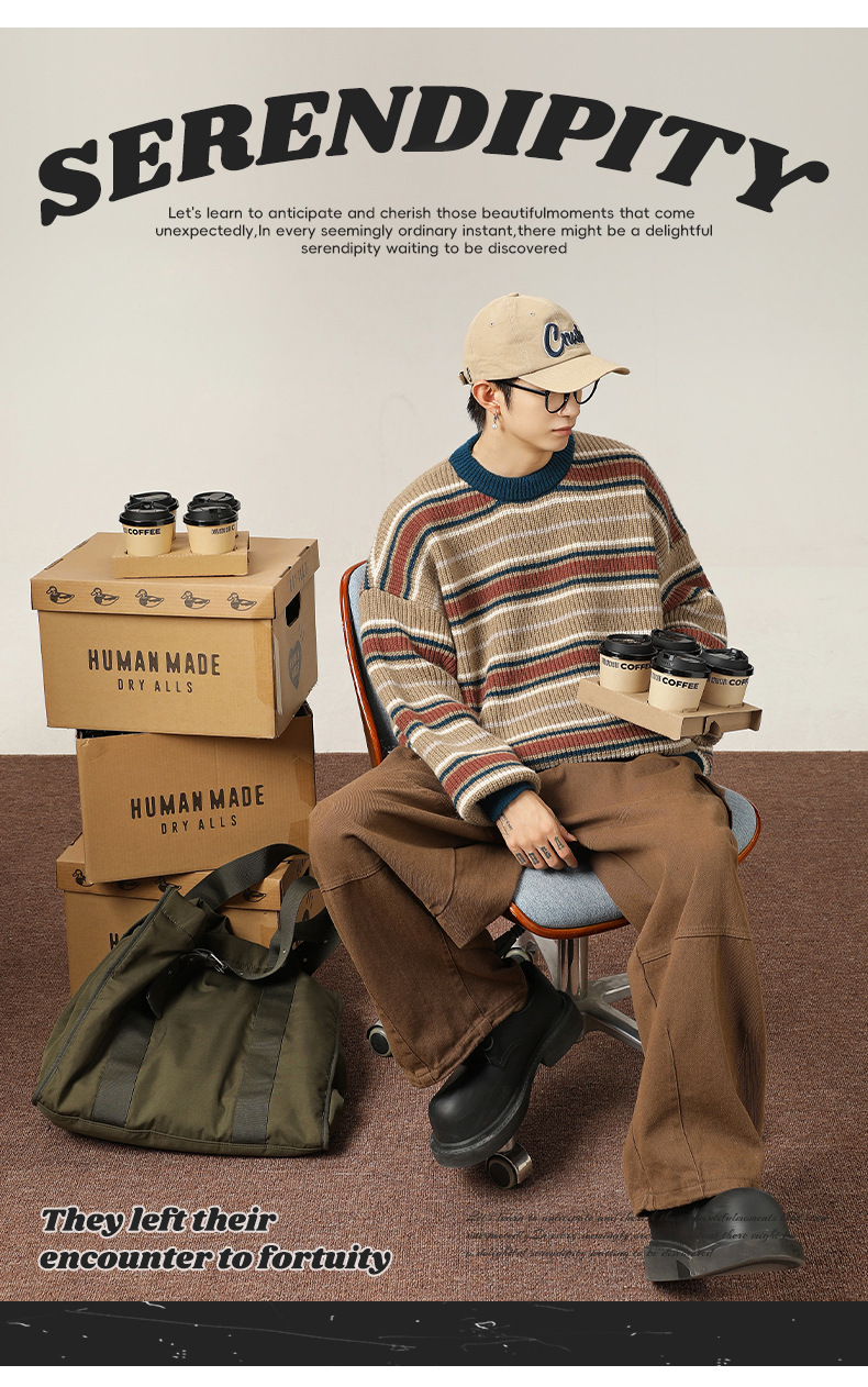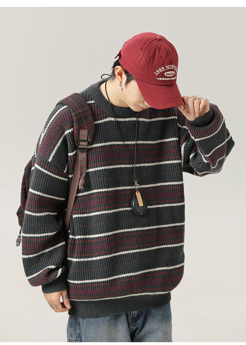 빈티지 콘트라스트 컬러 스트라이프 크루 넥 스웨터 남성 가을 및 겨울 두꺼운 바늘 느슨한 게으른 스타일 소프트 왁스 풀오버 스웨터 재킷스토어 가기