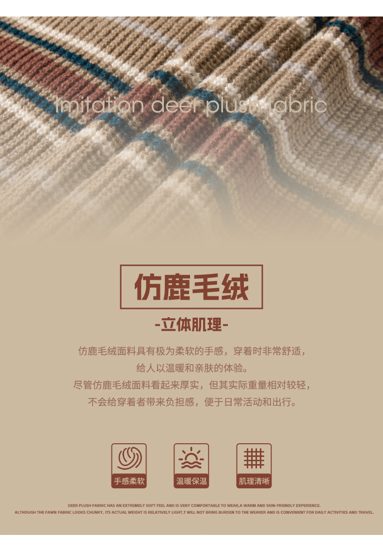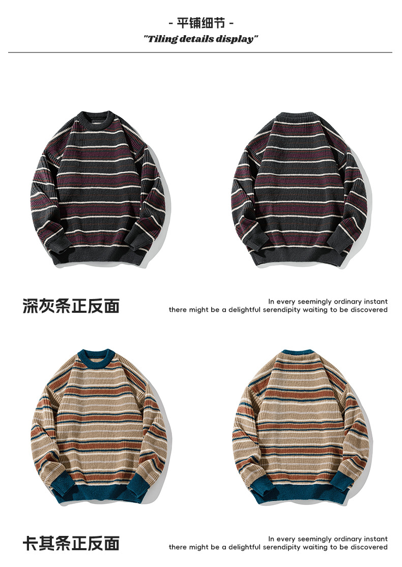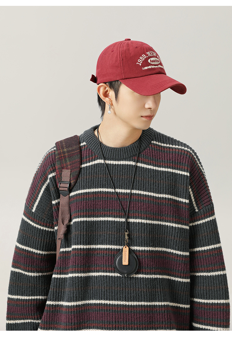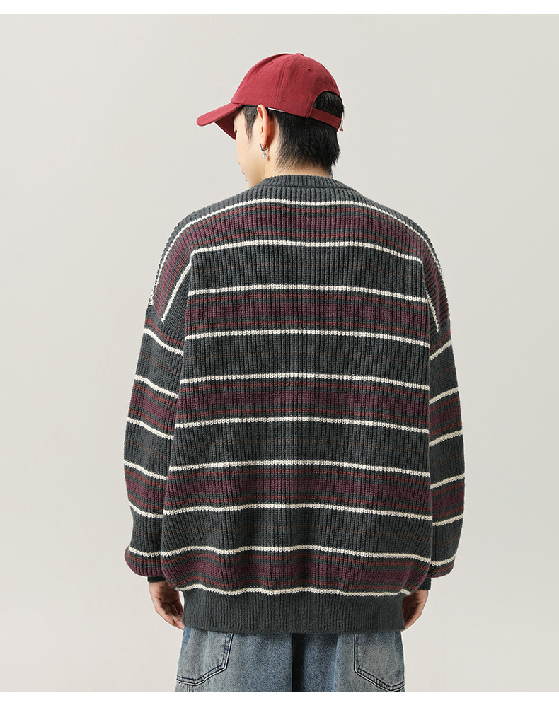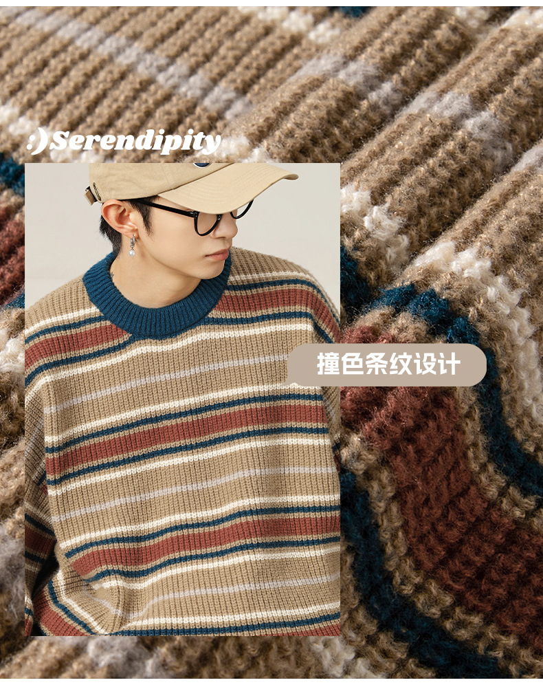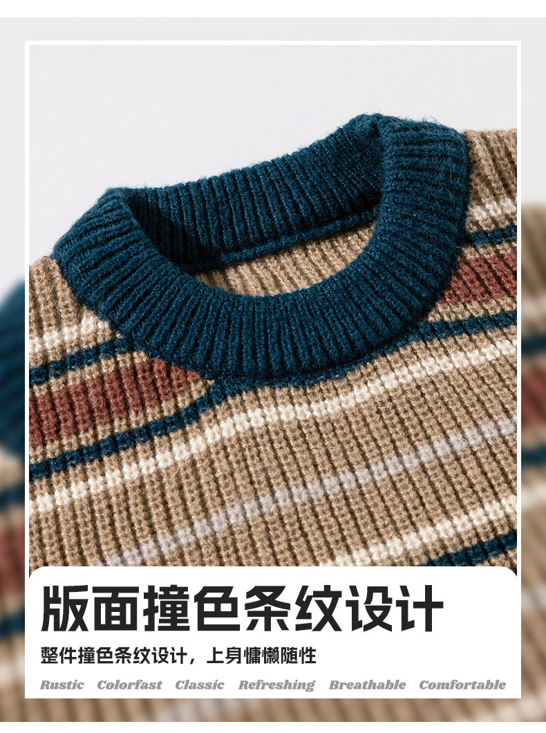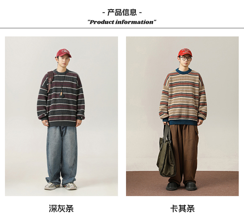 빈티지 콘트라스트 컬러 스트라이프 크루 넥 스웨터 남성 가을 및 겨울 두꺼운 바늘 느슨한 게으른 스타일 소프트 왁스 풀오버 스웨터 재킷
