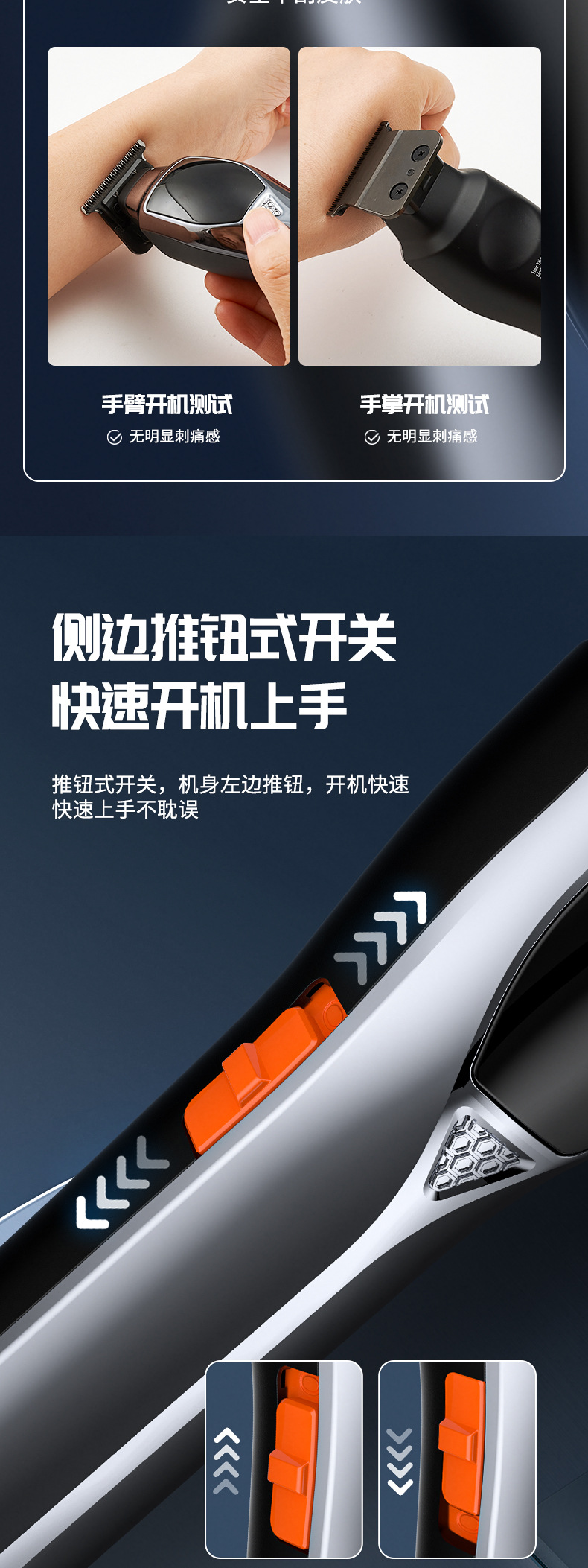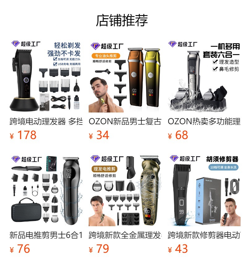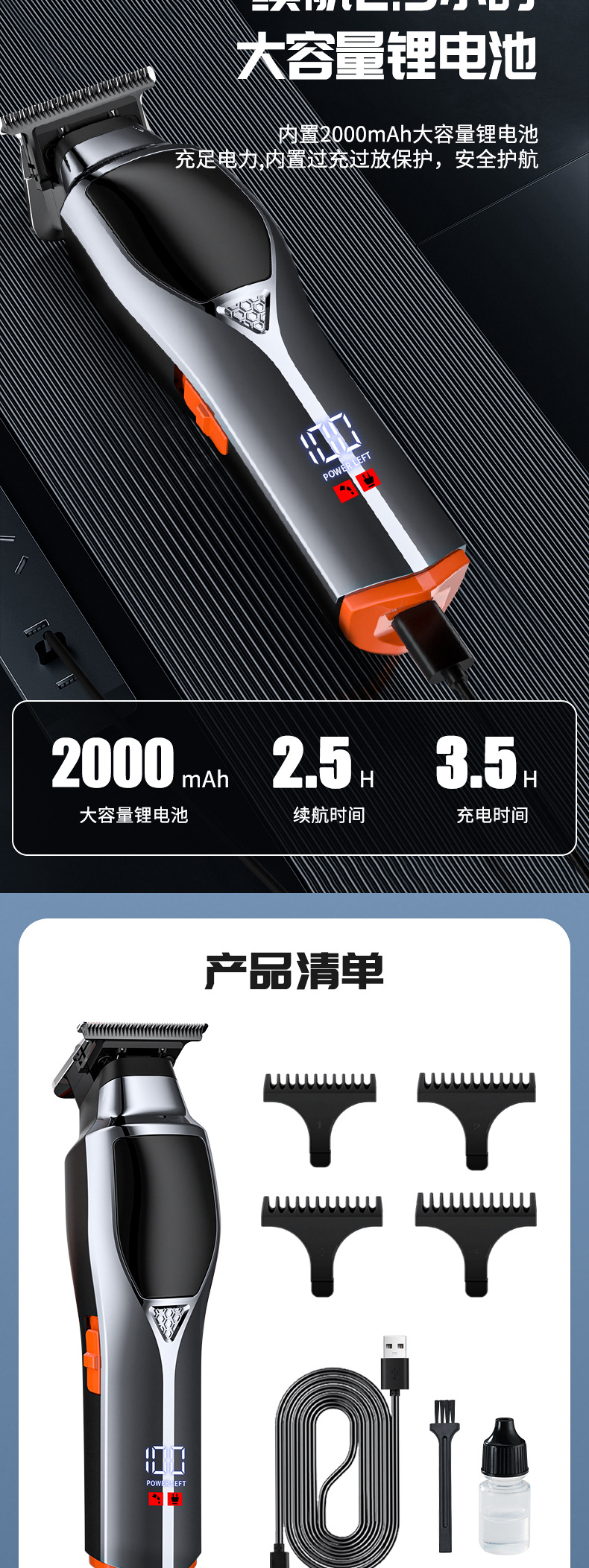 配件:理发器*1 限位梳*4(1 2 3 4)清洁刷*1 USB充电线*1 油瓶*1