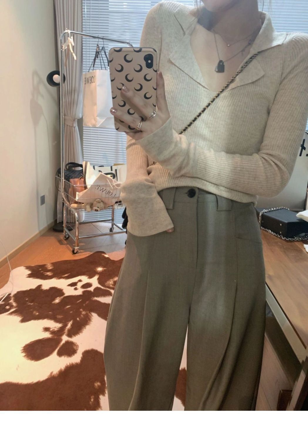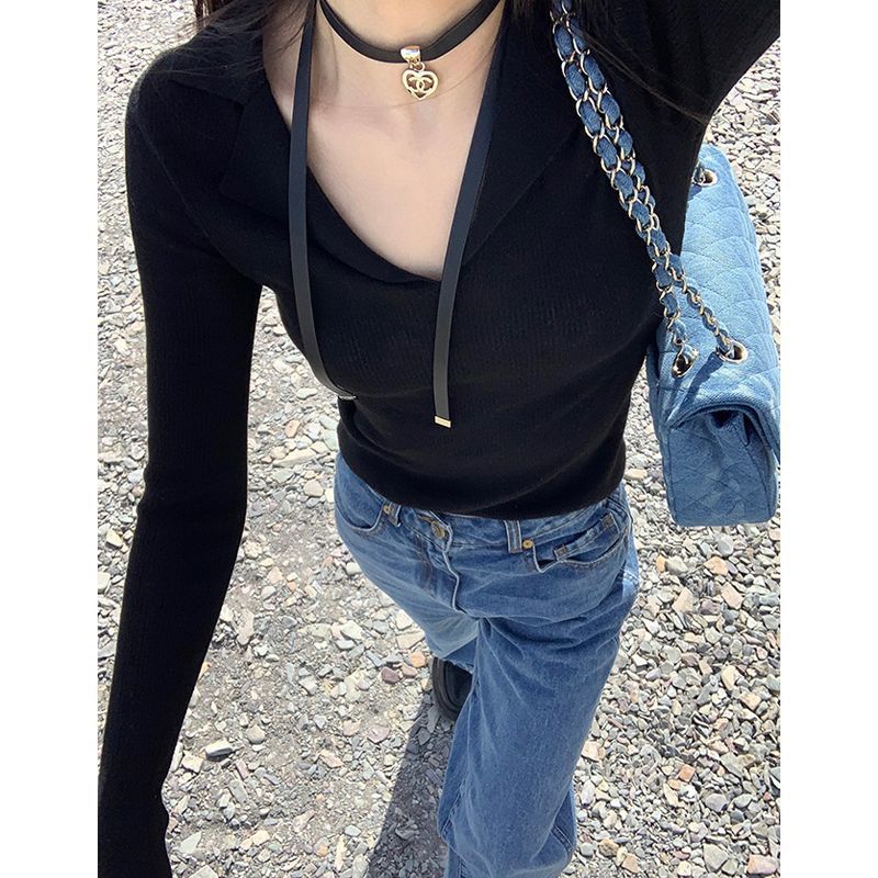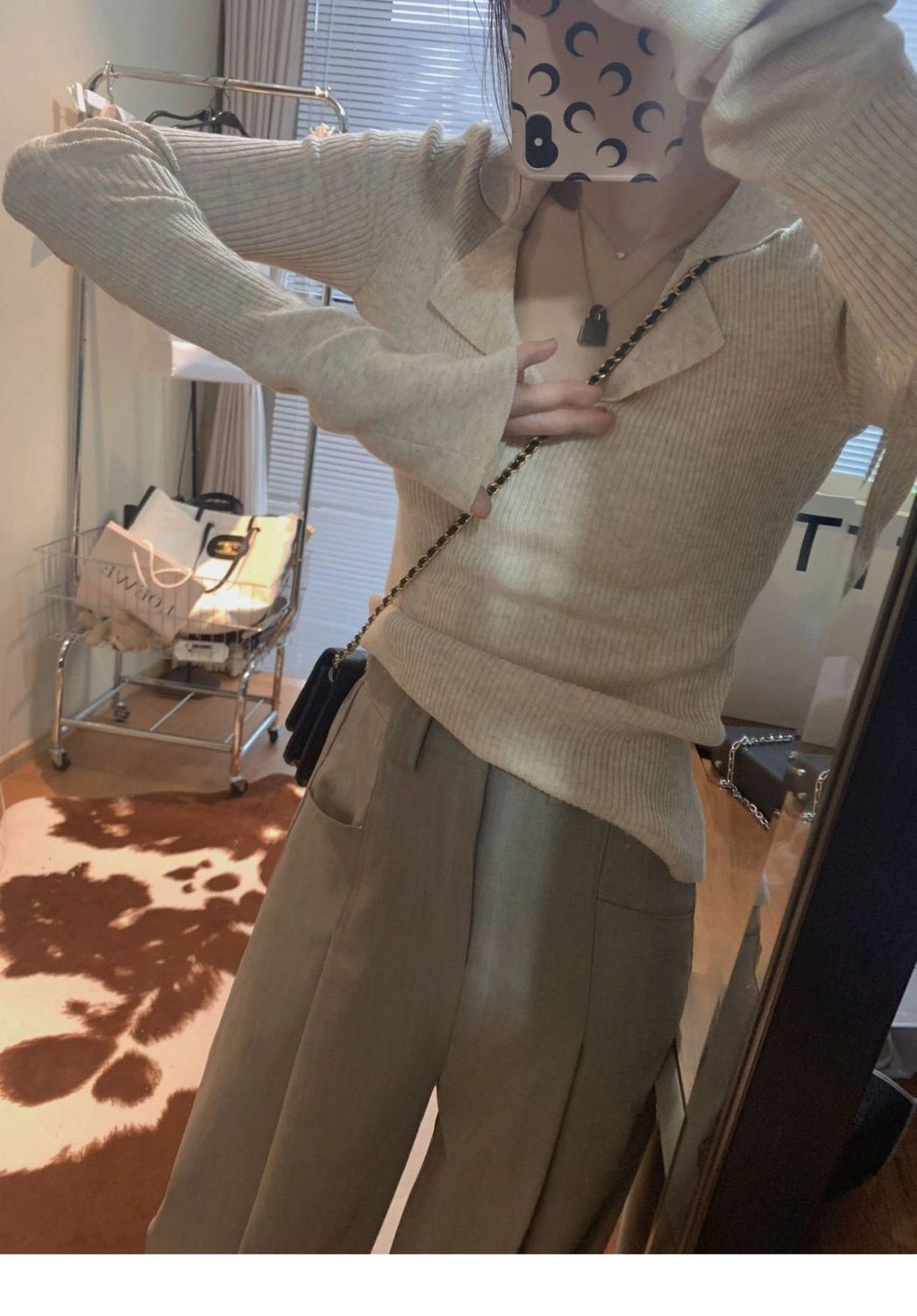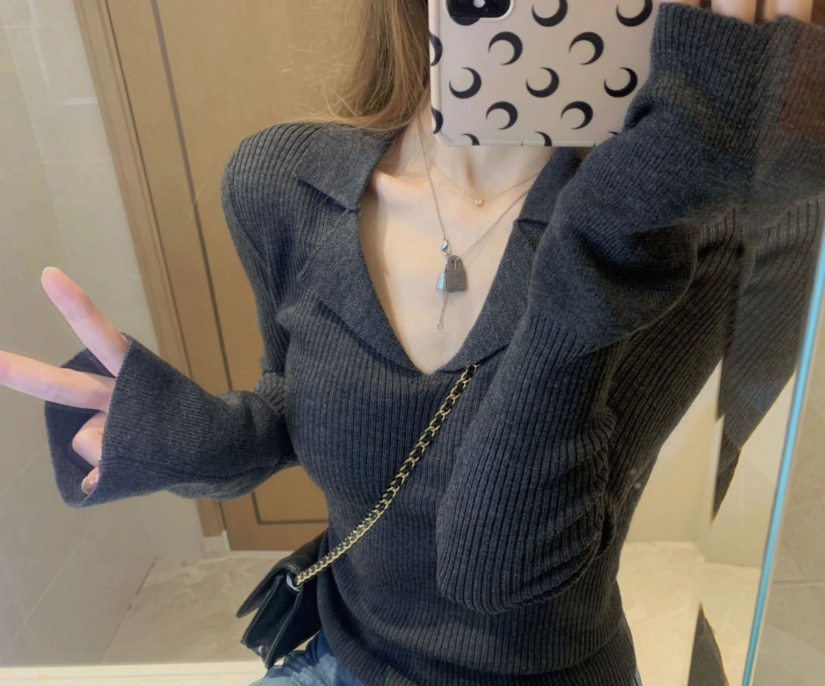 2024 년 이른 가을 뿔 슬리브 POLO 칼라 니트 스웨터 여성의 새로운 풀오버 긴 소매 올매치 베이스 셔츠 트렌디 슬림 핏 슬리밍스토어 가기