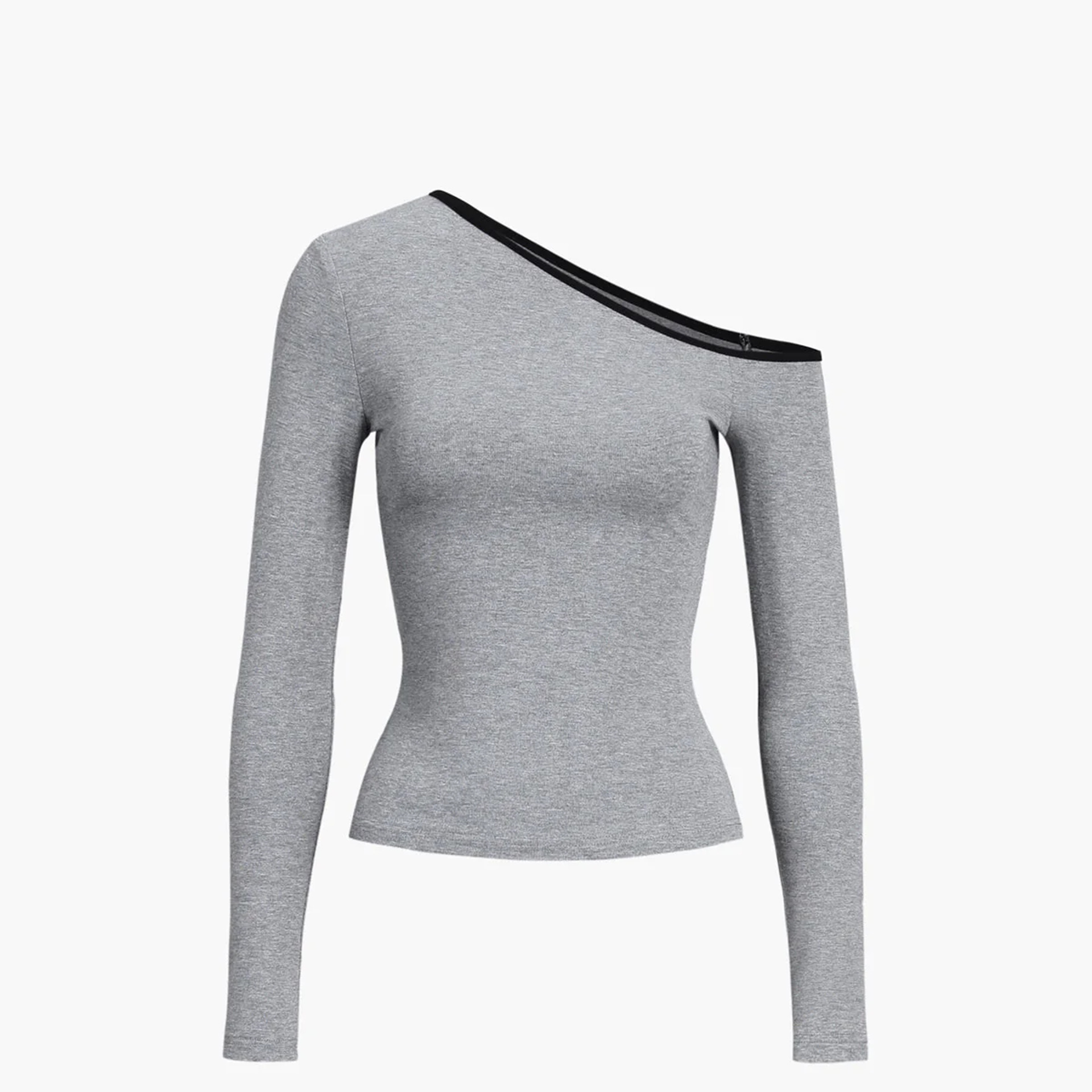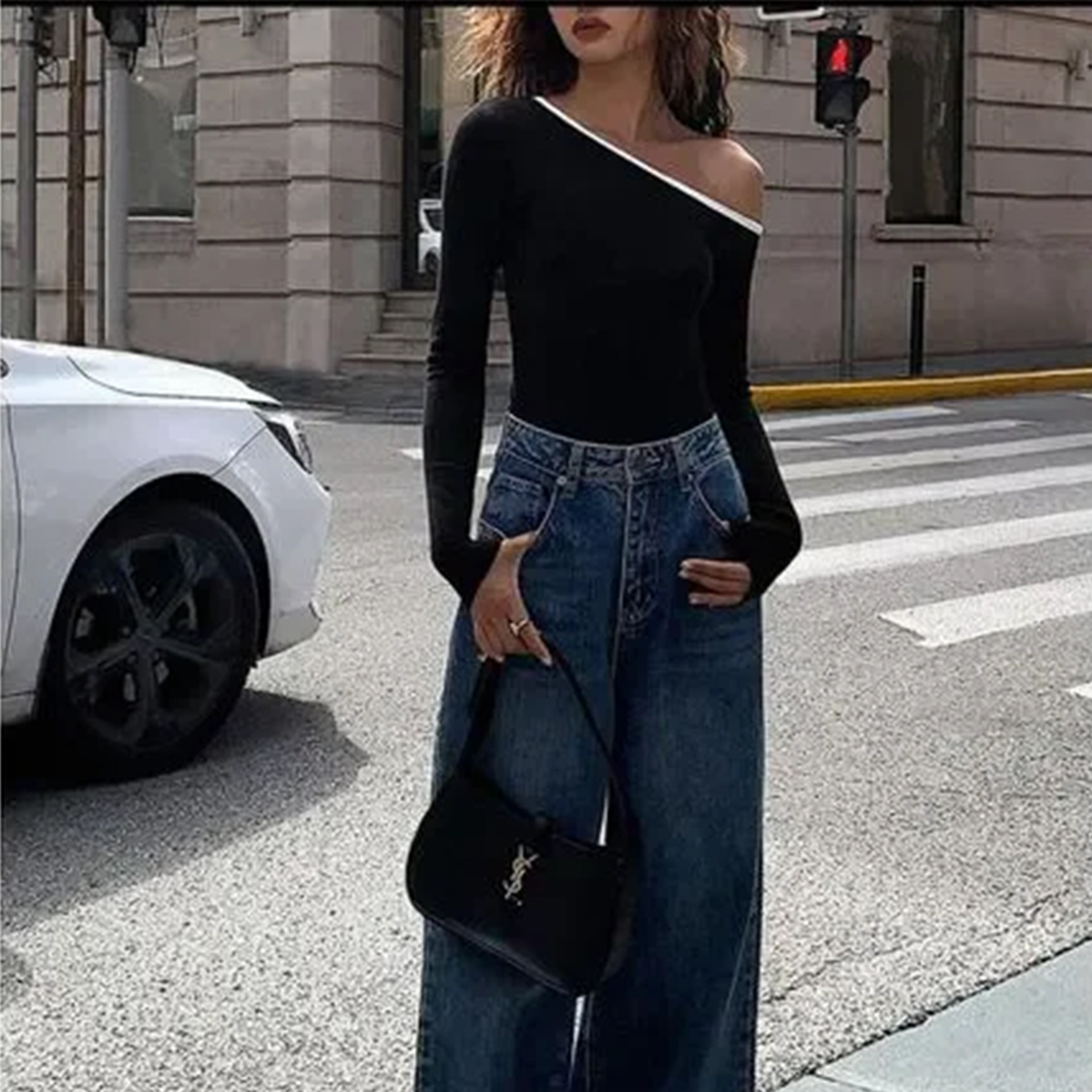 유럽 및 미국 스타일 2024 가을 새로운 여성 비스듬한 어깨 긴 소매 티셔츠 여성 국경 노출 어깨 최고 도매 여성스토어 가기