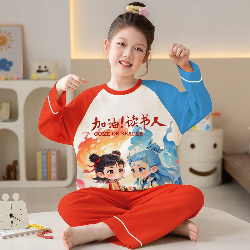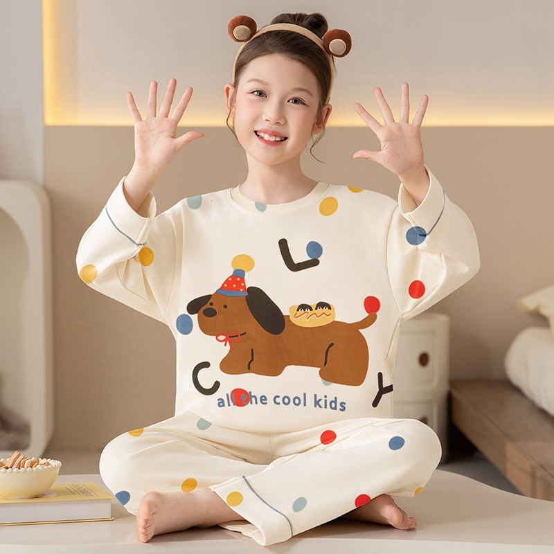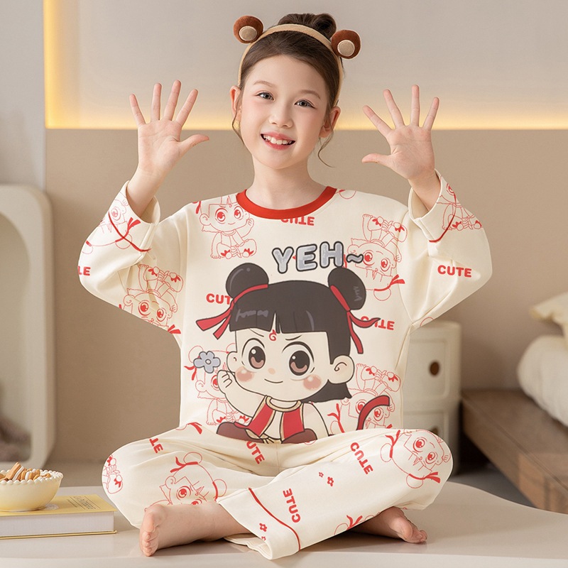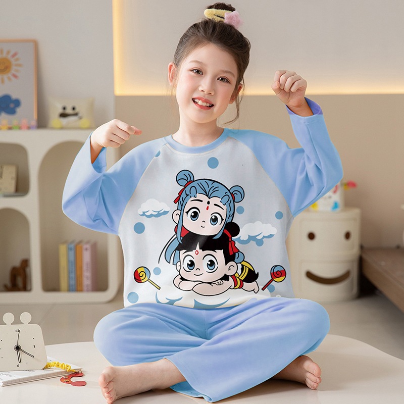 2025 새로운 순수 코튼 소녀 잠옷 얇은 긴 소매 봄, 가을 만화 에그 보이 파티 소녀와 어린이 홈웨어스토어 가기