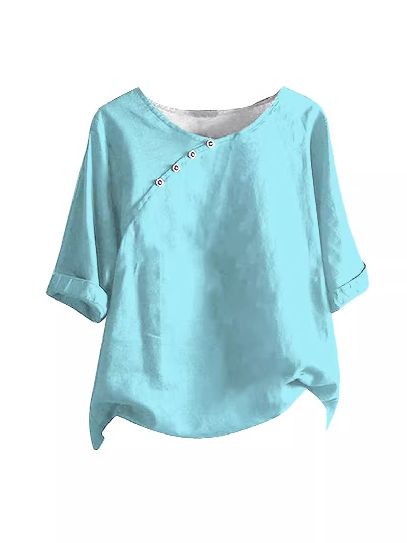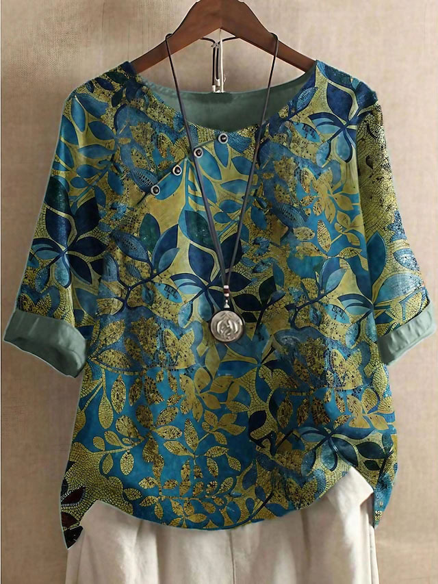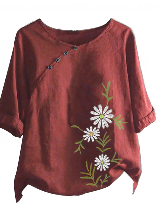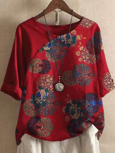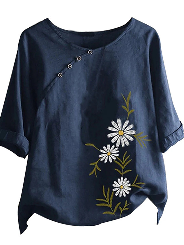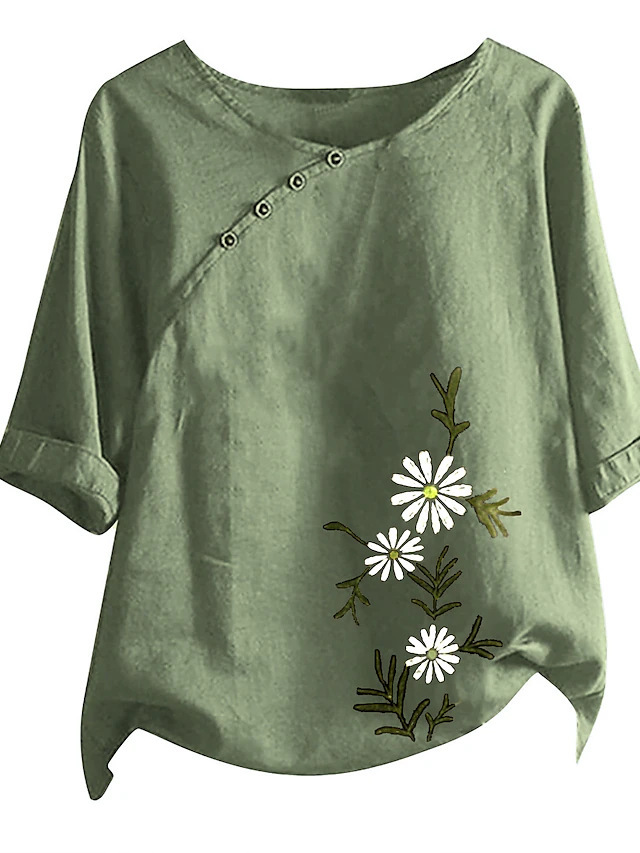 대외 무역 독립 역 새로운 셔츠 여성 꽃 3D 인쇄 슬럽 라운드 넥 짧은 소매 버튼 7 점 소매 셔츠스토어 가기